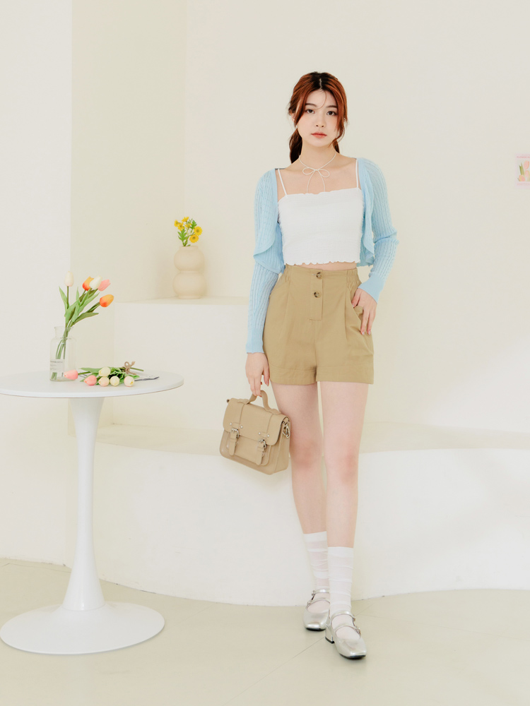 โ Featuring a pleated design and button detailing.