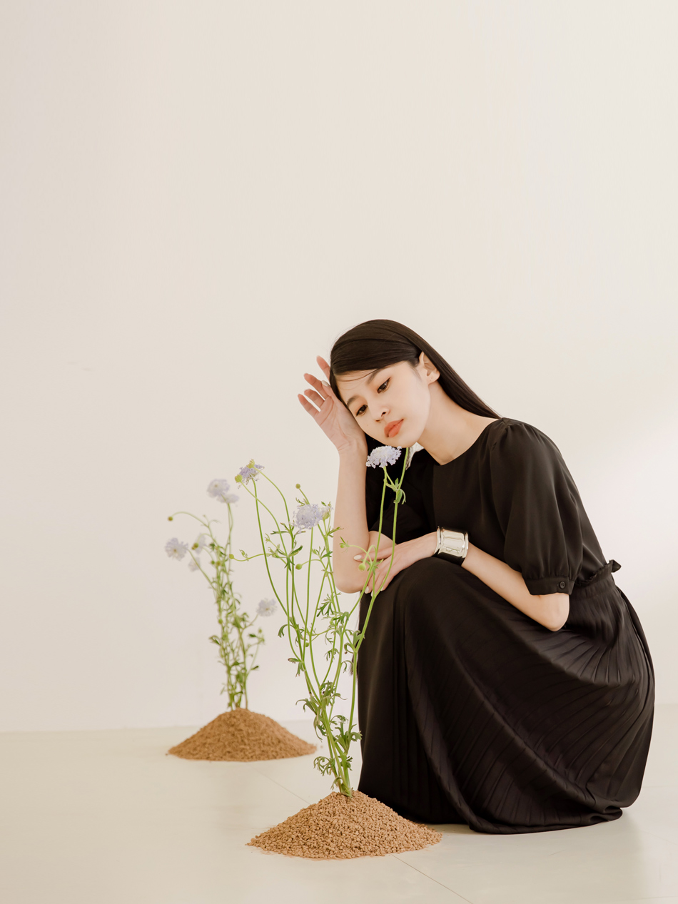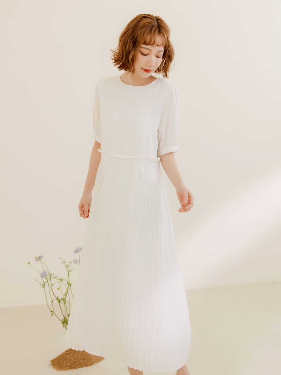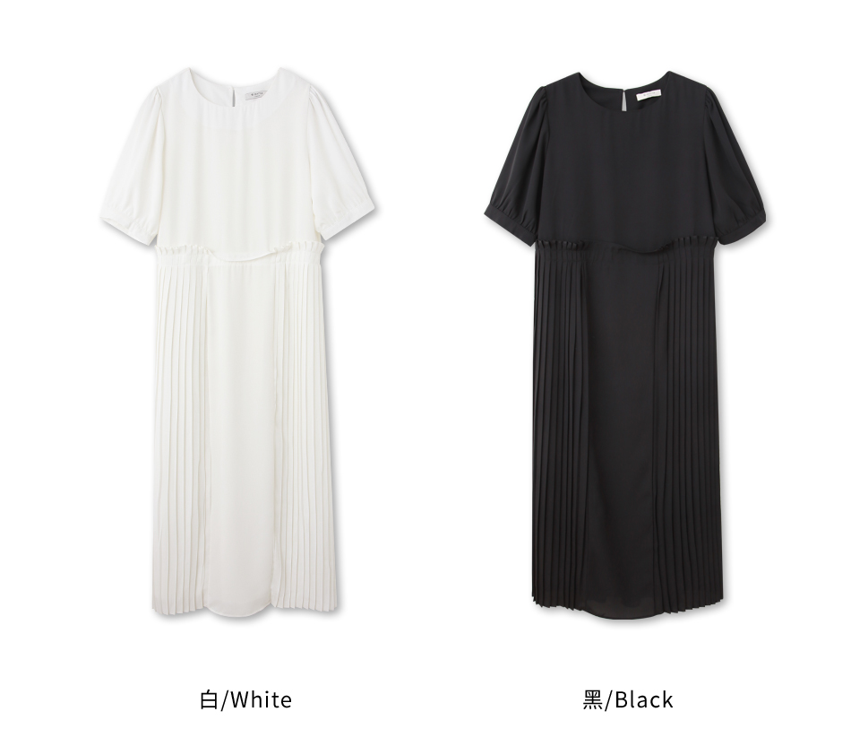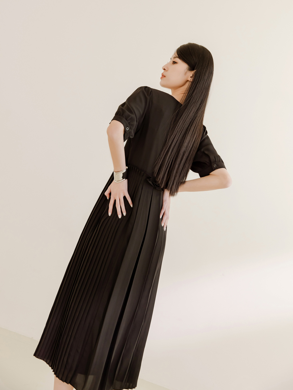 โ Flowing pleated skirt creates a soft silhouette