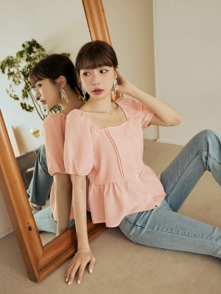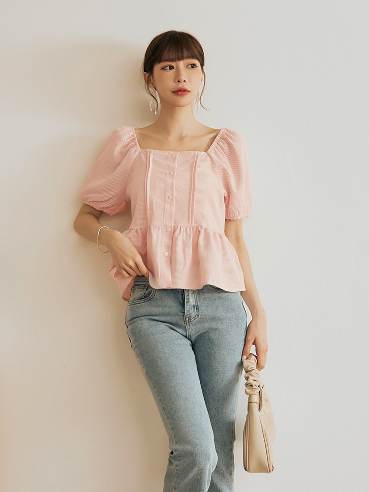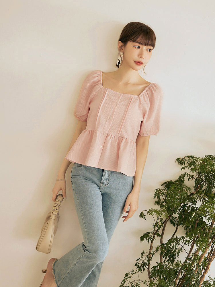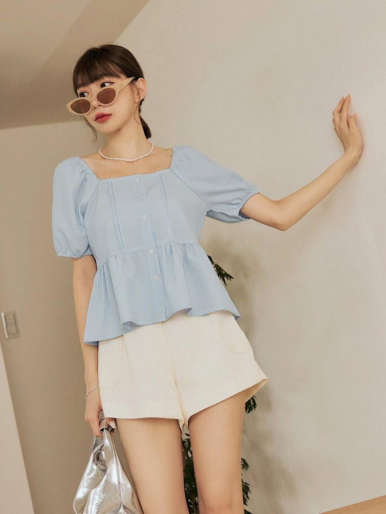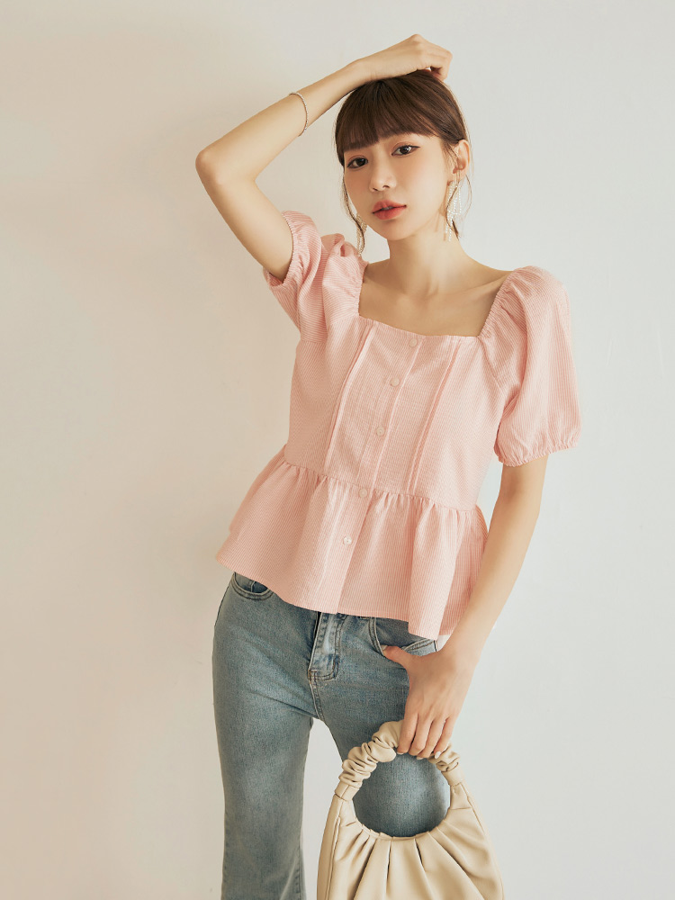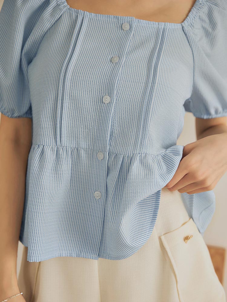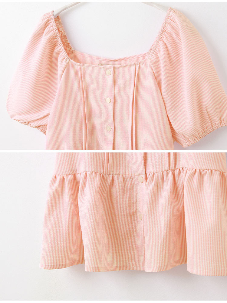 Product Feature: โ Crafted from a soft, striped fabric โ Features a flattering square neckline โ Designed with a shirred, elasticated shoulder and sleeves โ Delicate ruffle hem detail