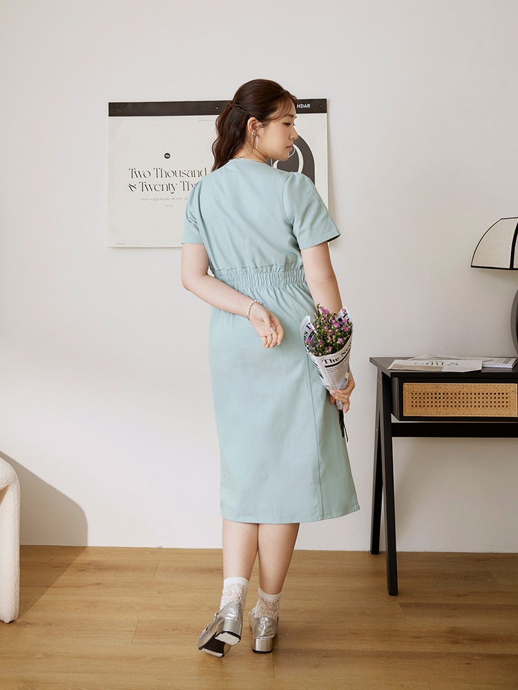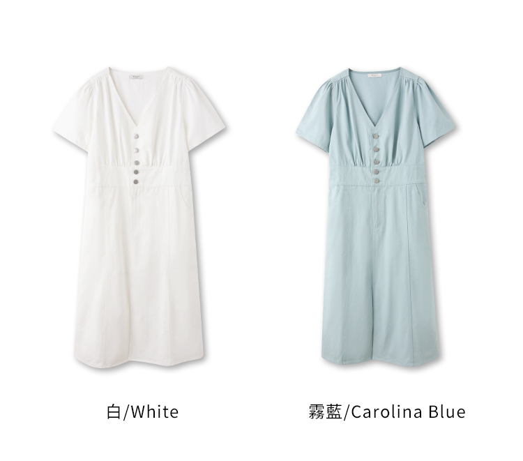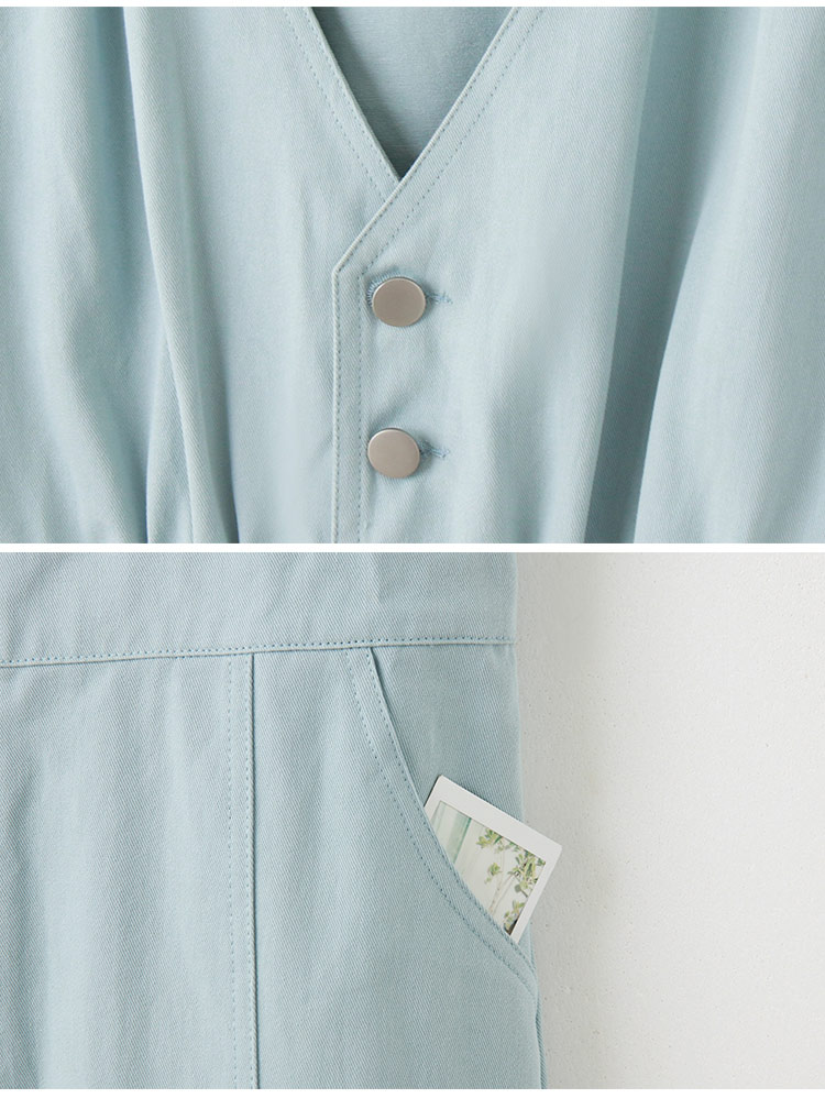 Product Feature: โ Crafted from breathable, skin-friendly cotton โ Flattering V-neck design โ Features functional pockets and button details โ Side split for enhanced silhouette