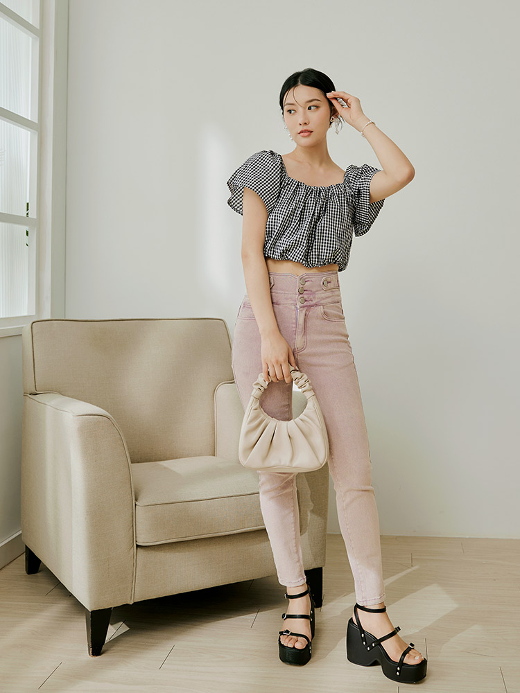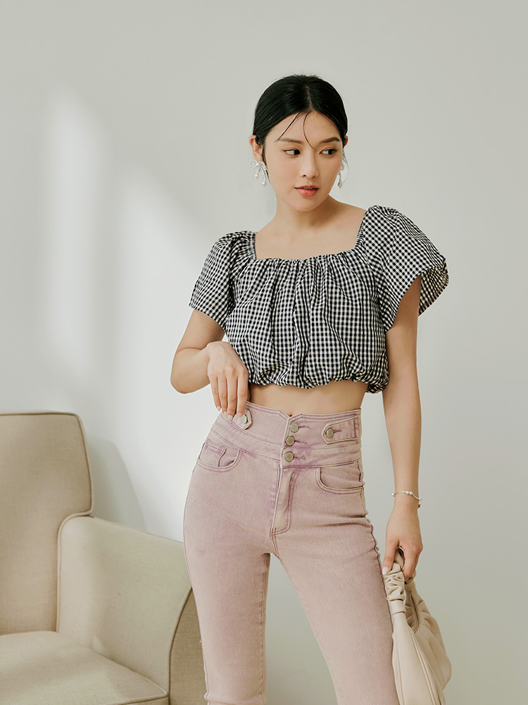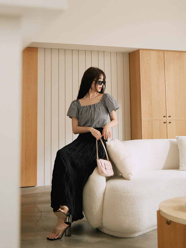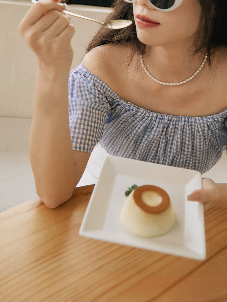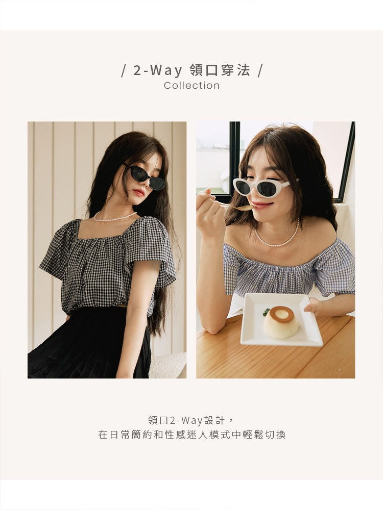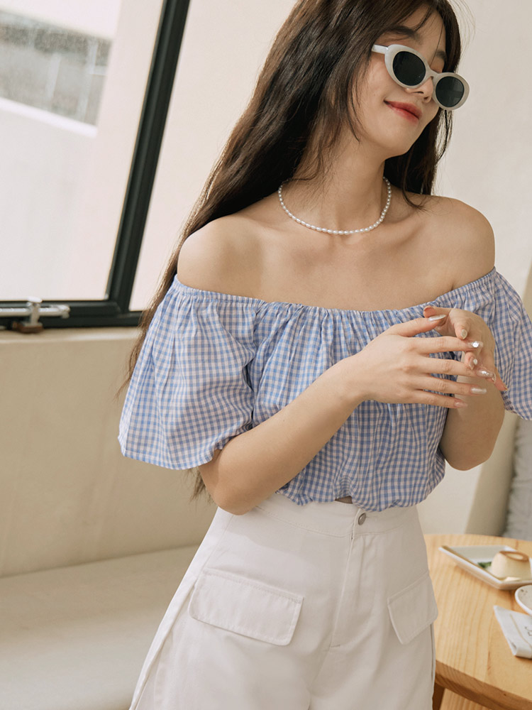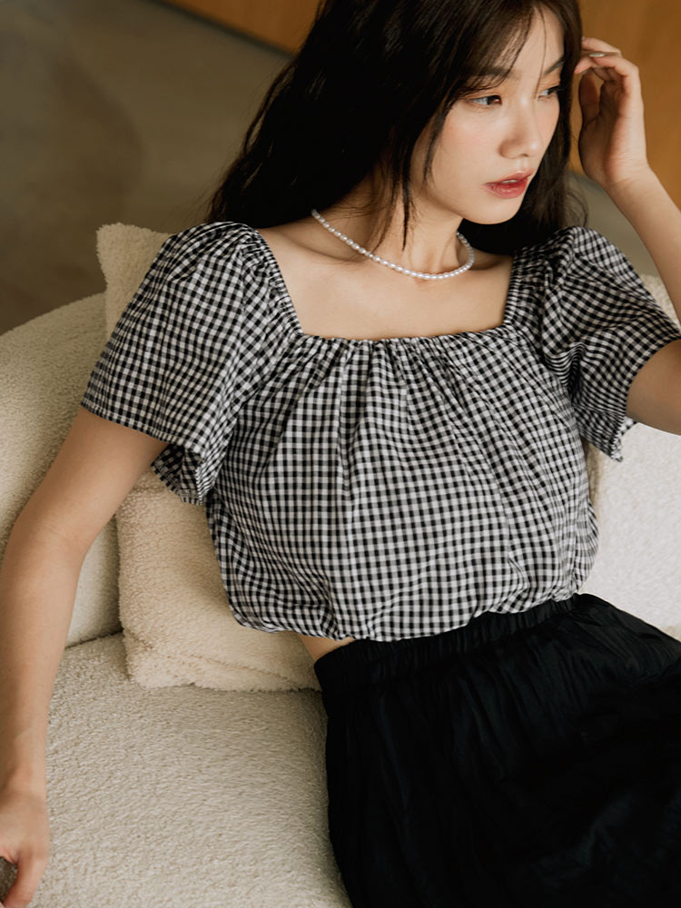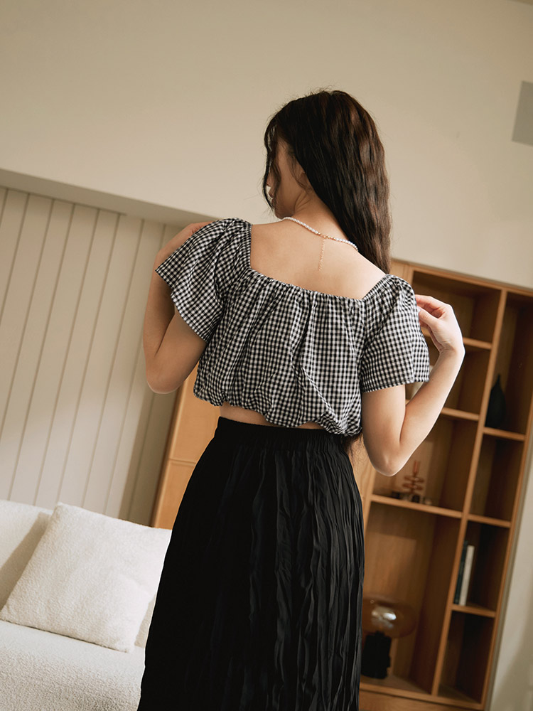 Product Feature: โ Versatile two-way design: wear as a square neck or off-the-shoulder top โ Made from a lightweight, skin-friendly fabric โ Features a charming checkered pattern โ Elasticated neckline and hem for a comfortable fit