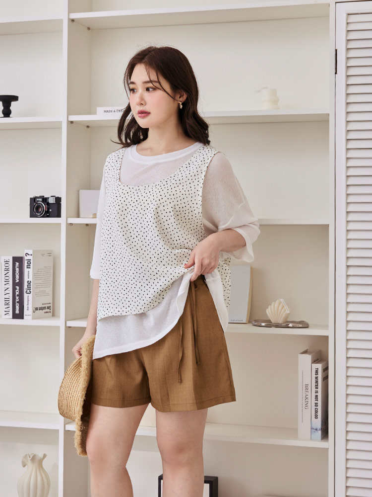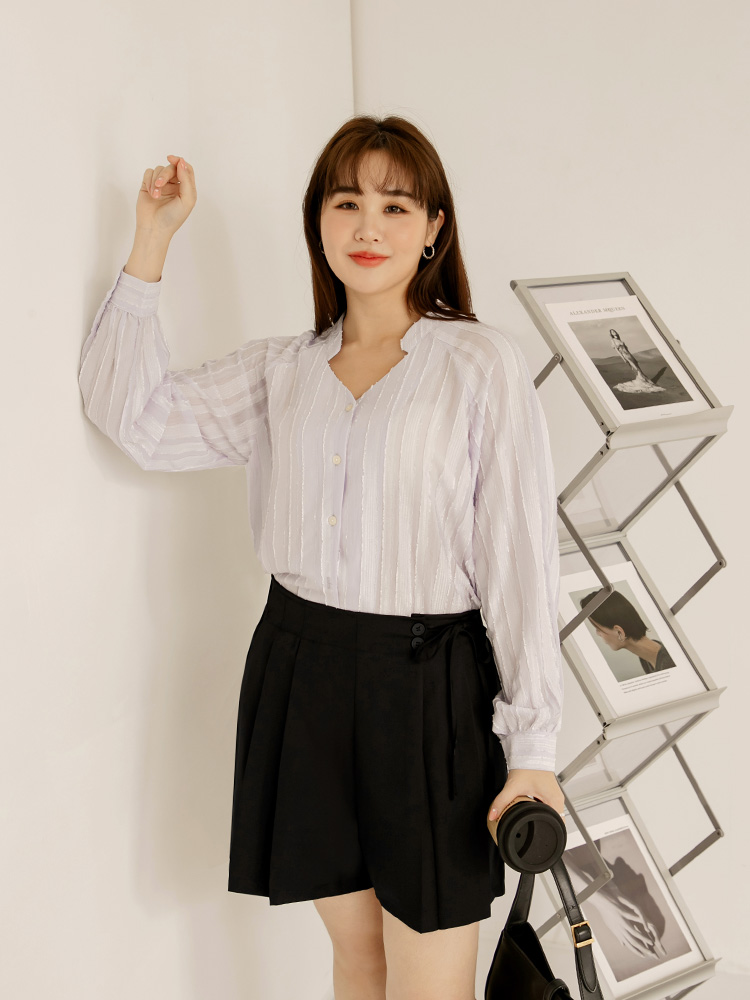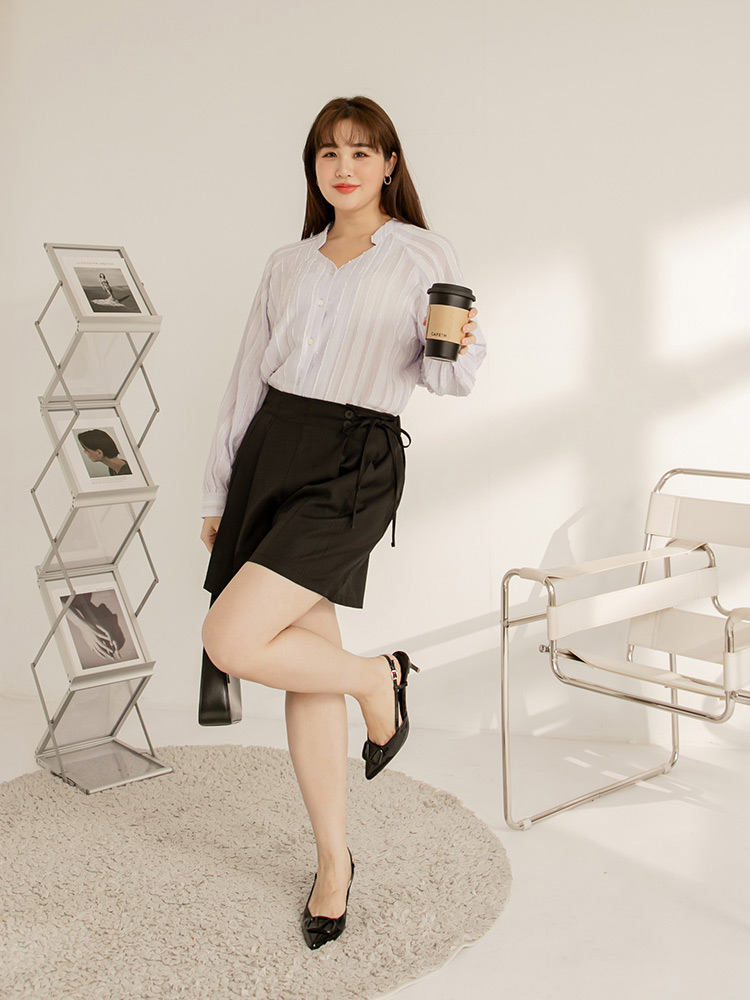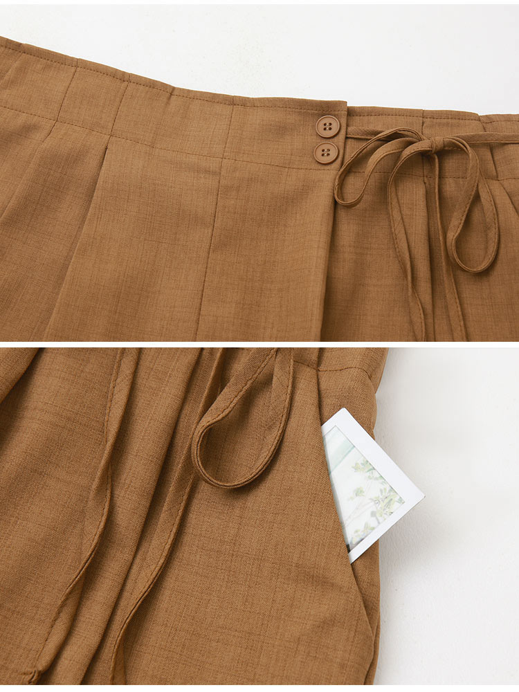 Product Feature: โ Made from wrinkle-resistant fabric for easy care. โ Features a non-functional button and a fixed tie. โ Designed with an elasticated waistband at the back for comfort. โ Includes functional pockets. โ Pleated design for a flattering silhouette.