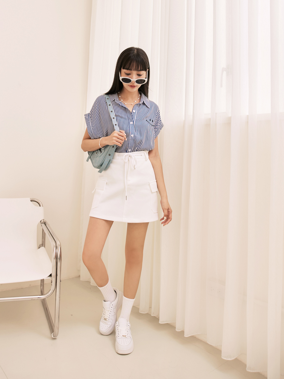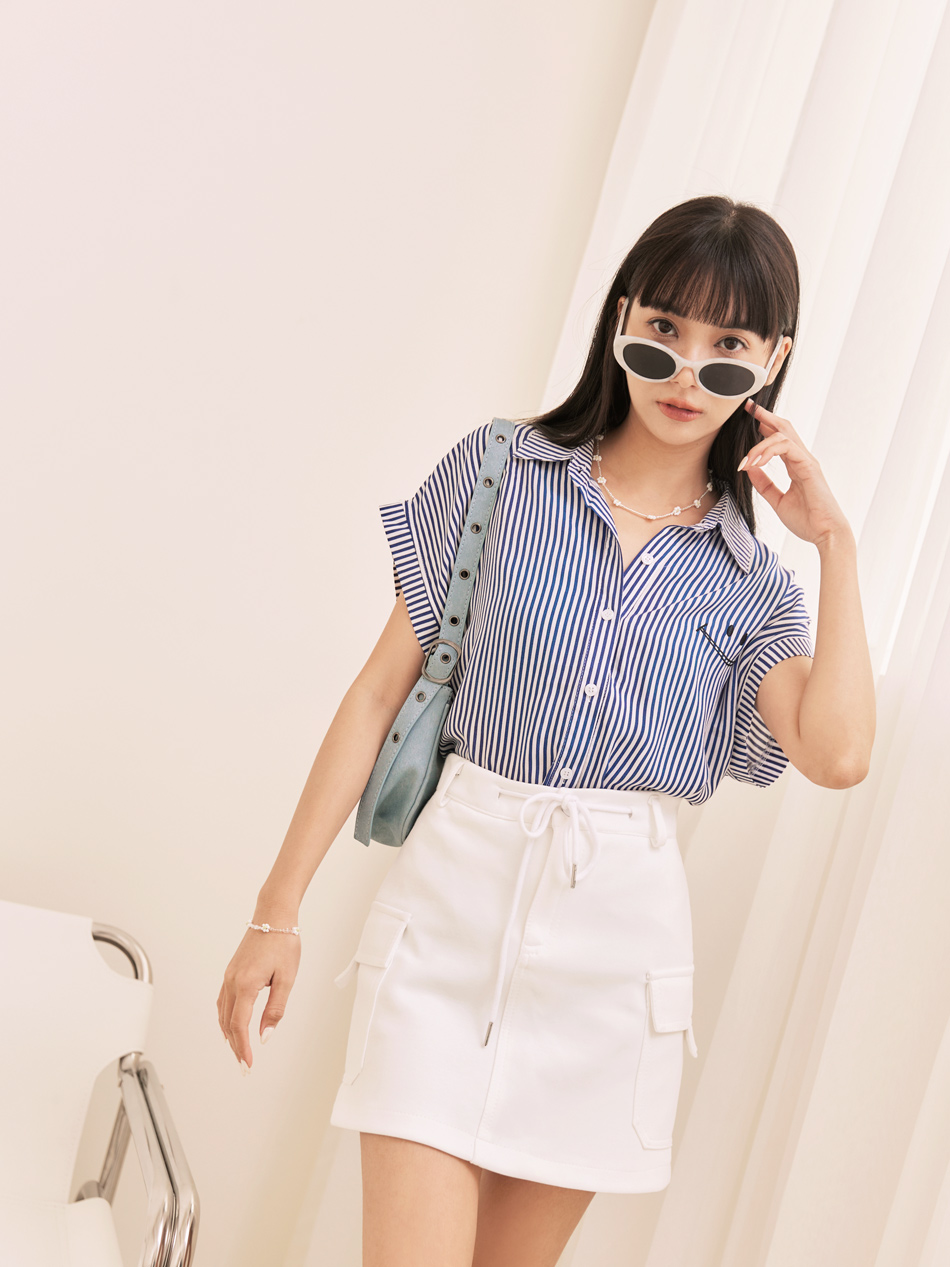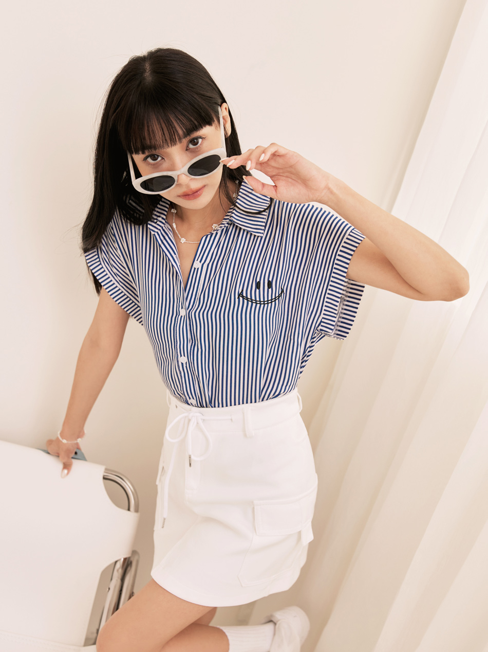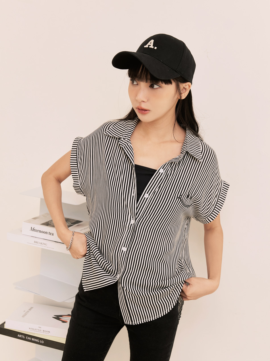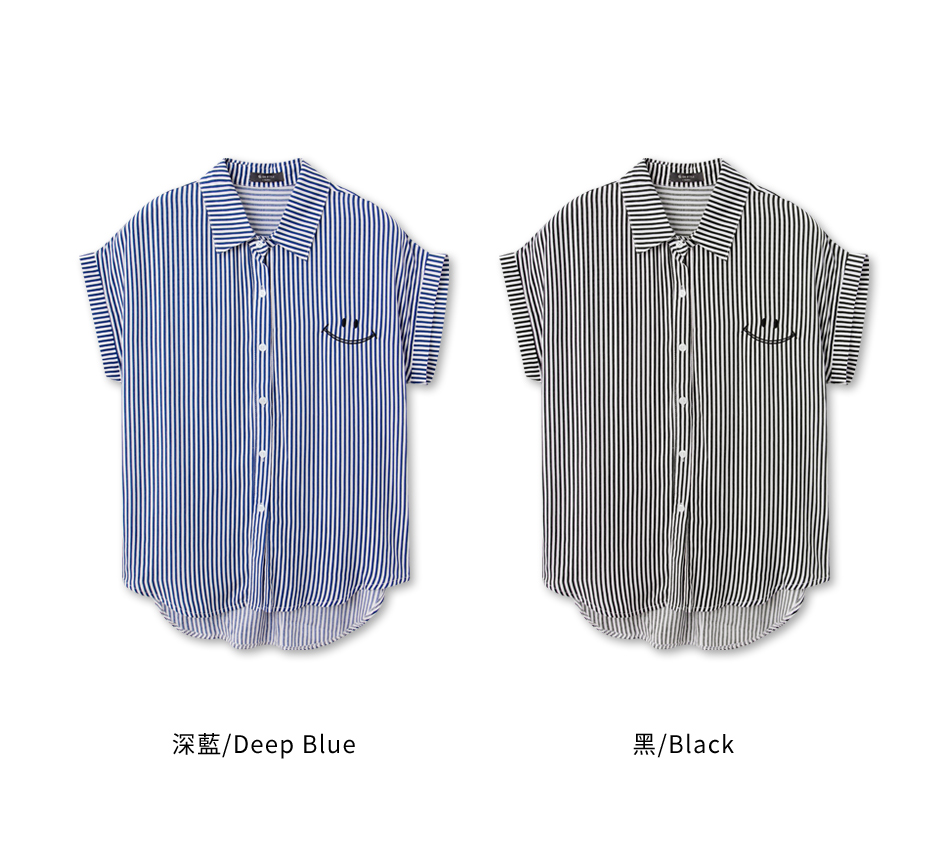 Product Feature: โ Crafted from a minimalist striped fabric โ Features a charming embroidered smiling face โ Designed with a flattering front-short, back-long silhouette
