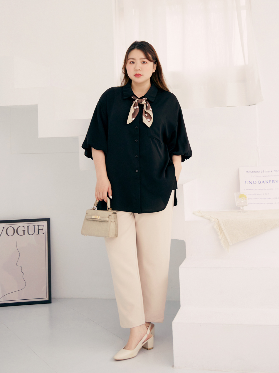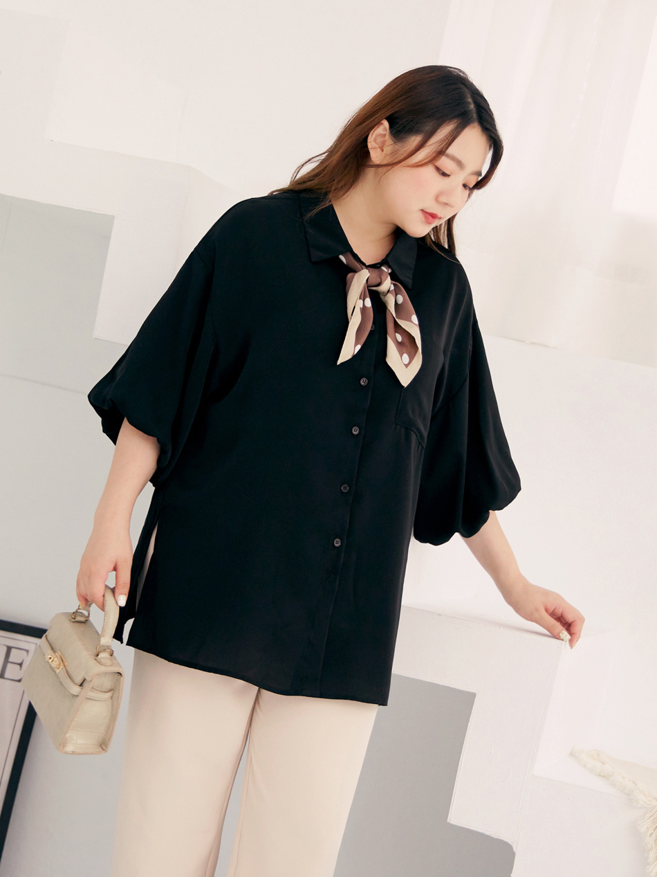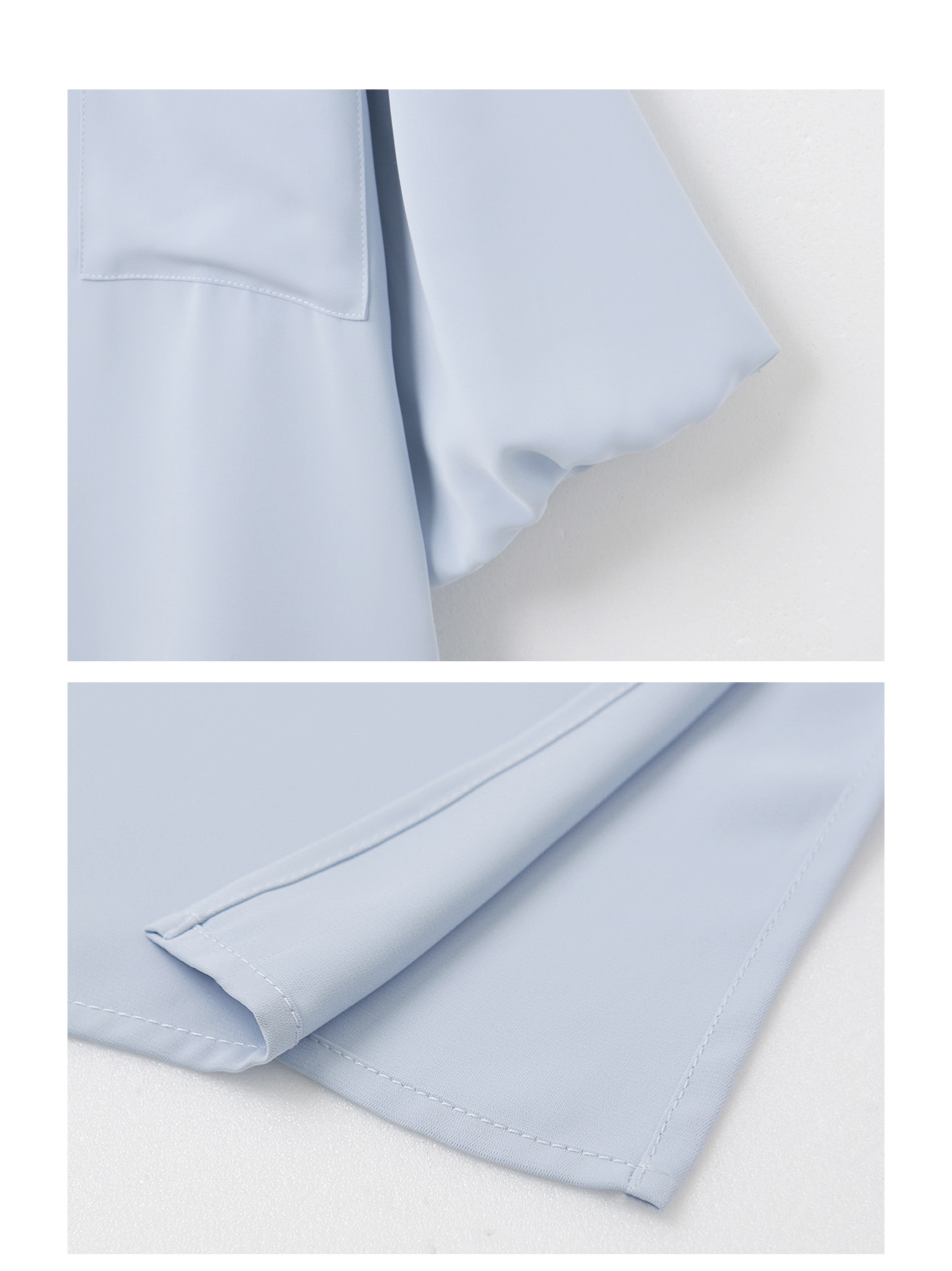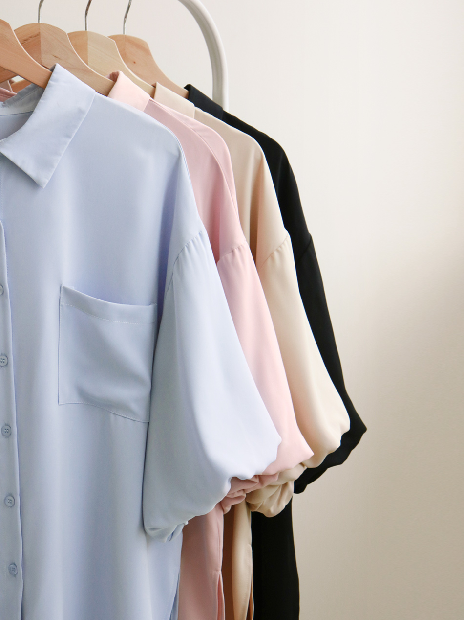 Product Feature: โ Made from cooling, lightweight chiffon โ Flattering puff sleeves to conceal arms โ Features front pocket with button closure โ Side slits for a streamlined silhouette