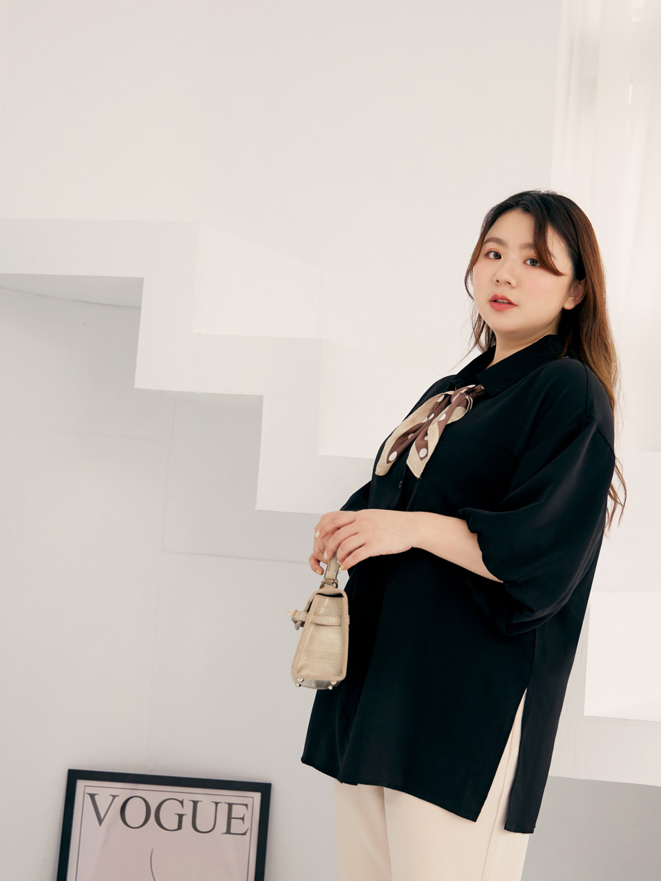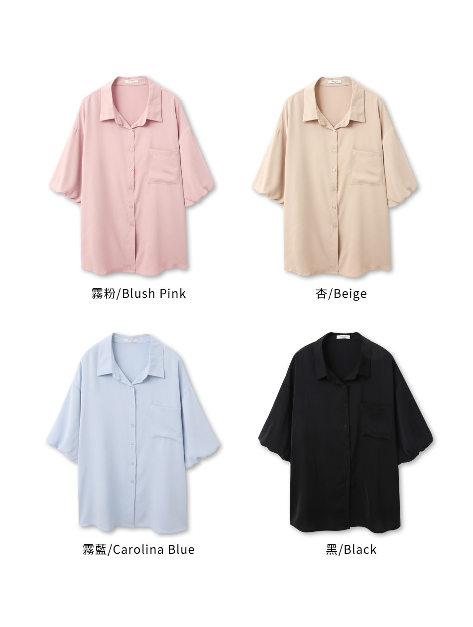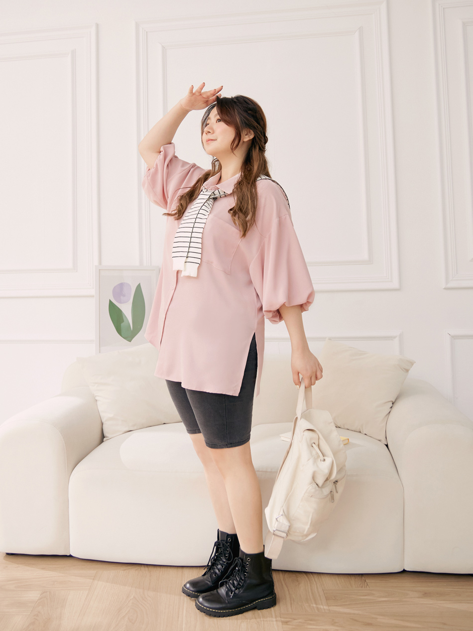 Product Feature: โ Made from cooling, lightweight chiffon โ Flattering puff sleeves to conceal arms โ Features front pocket with button closure โ Side slits for a streamlined silhouette