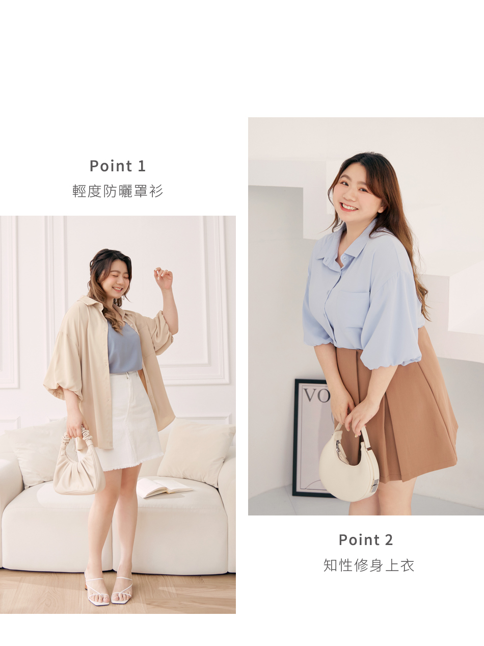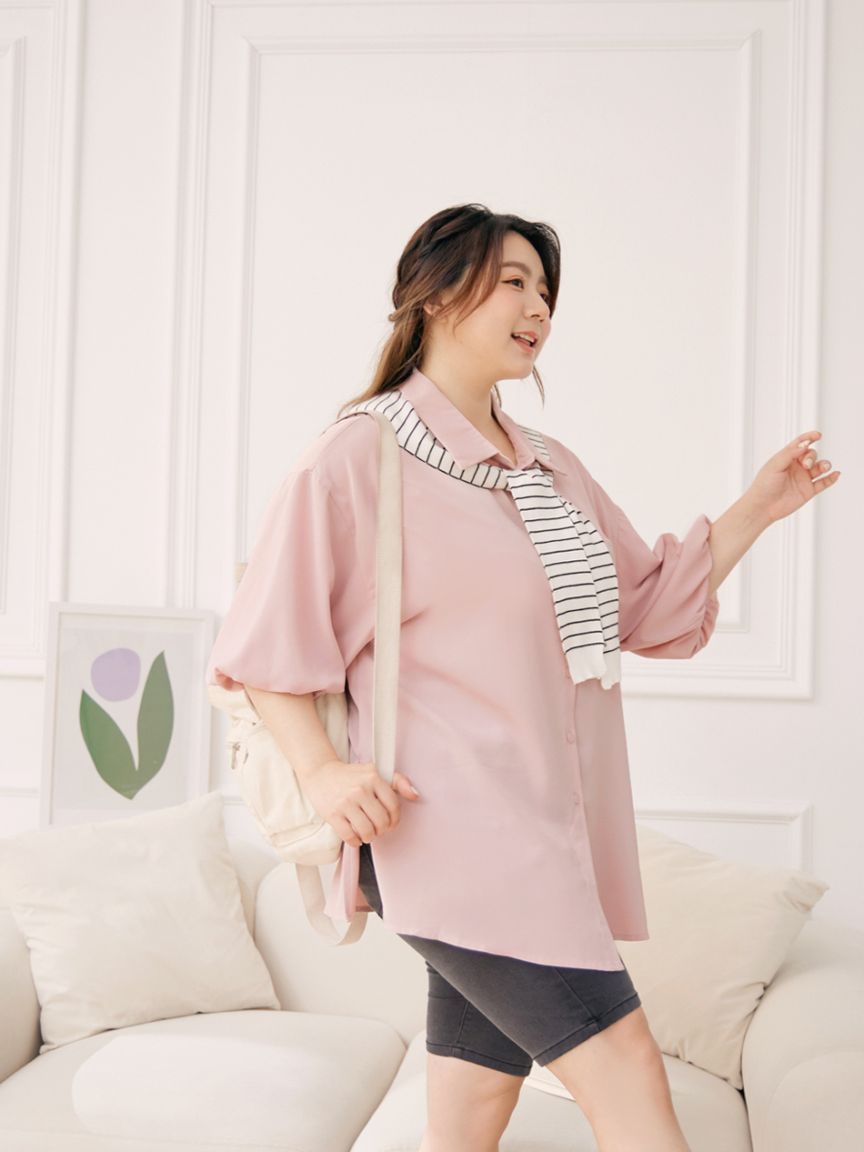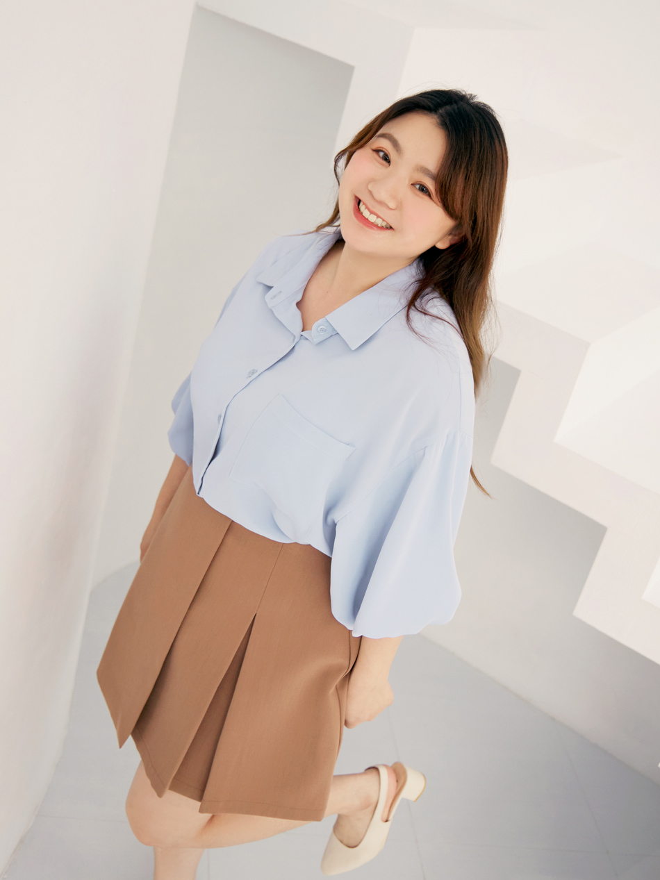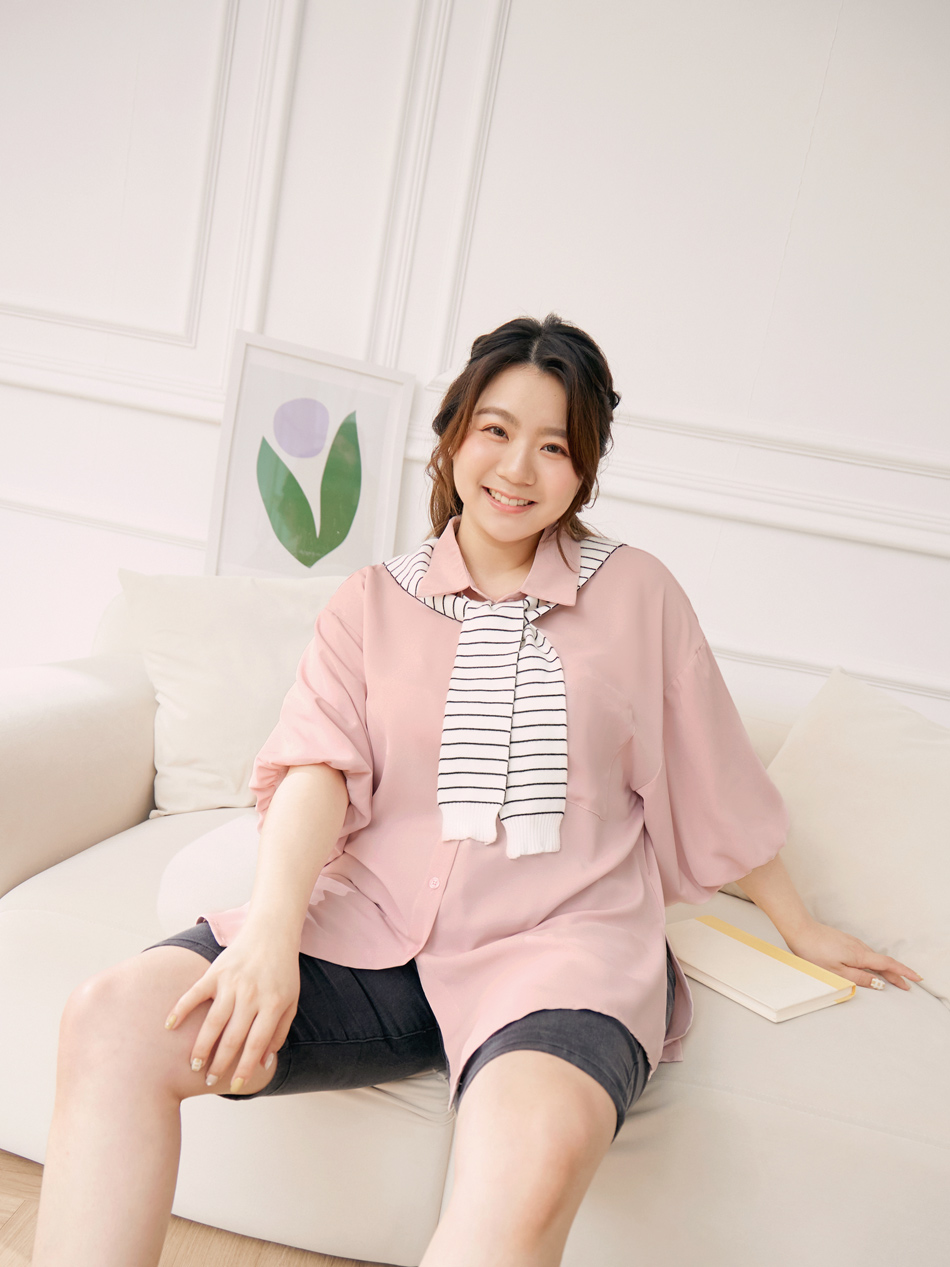 Product Feature: โ Made from cooling, lightweight chiffon โ Flattering puff sleeves to conceal arms โ Features front pocket with button closure โ Side slits for a streamlined silhouette
