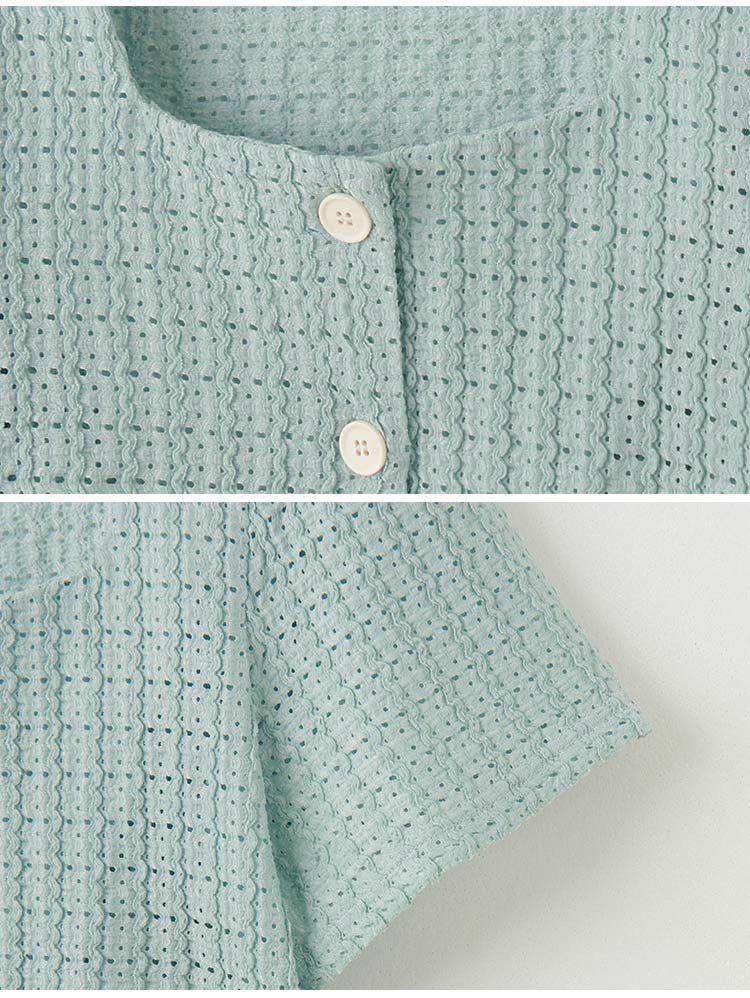 Product Feature: โ Crafted from intricate, textured openwork fabric. โ Features a flattering square neckline. โ Designed with puff sleeves to subtly conceal the arms. โ Button-down front.