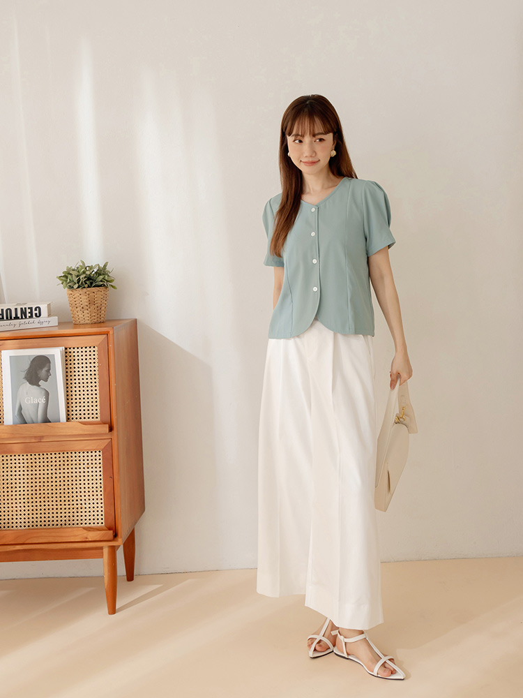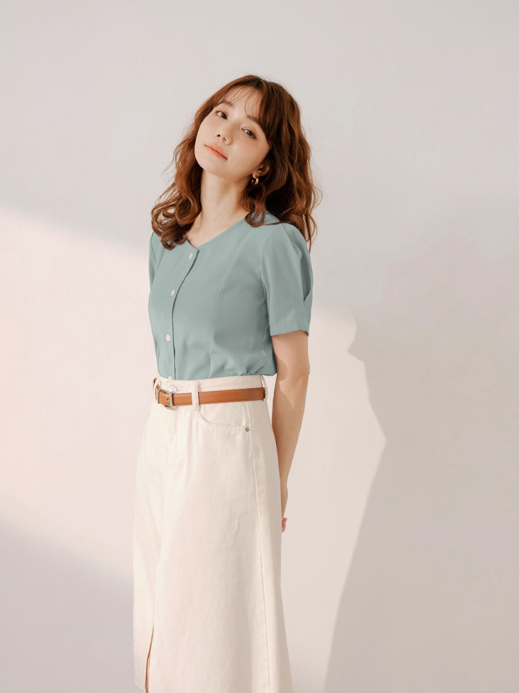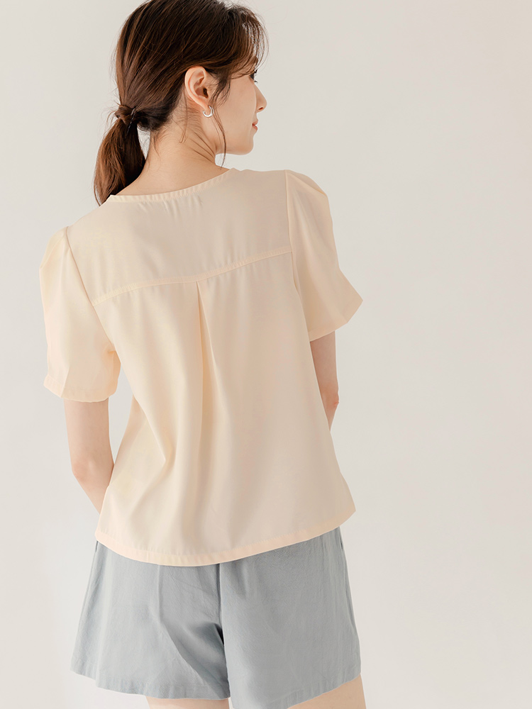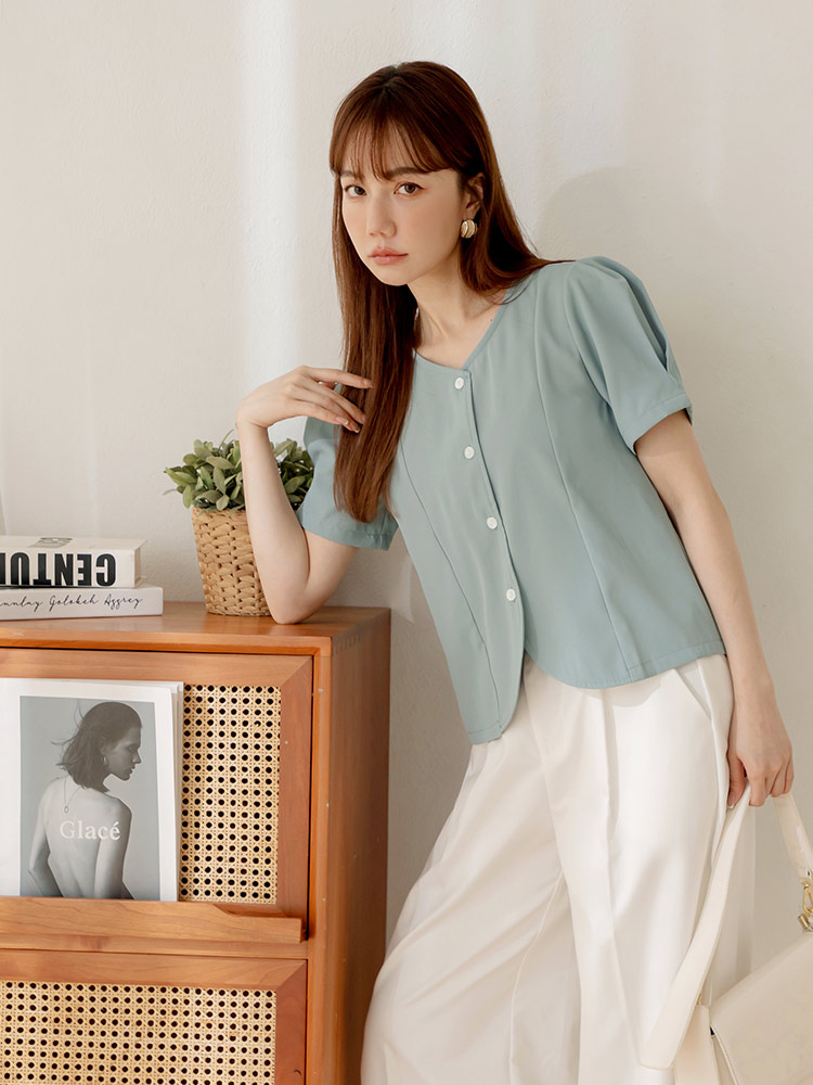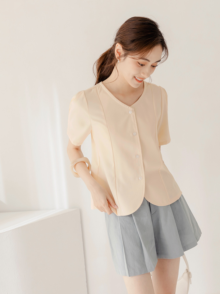 Product Feature: โ Crafted from smooth, soft fabric. โ Features elegant shell buttons for a touch of sophistication. โ Designed with flattering puff sleeves. โ Non-stretch fabric.
