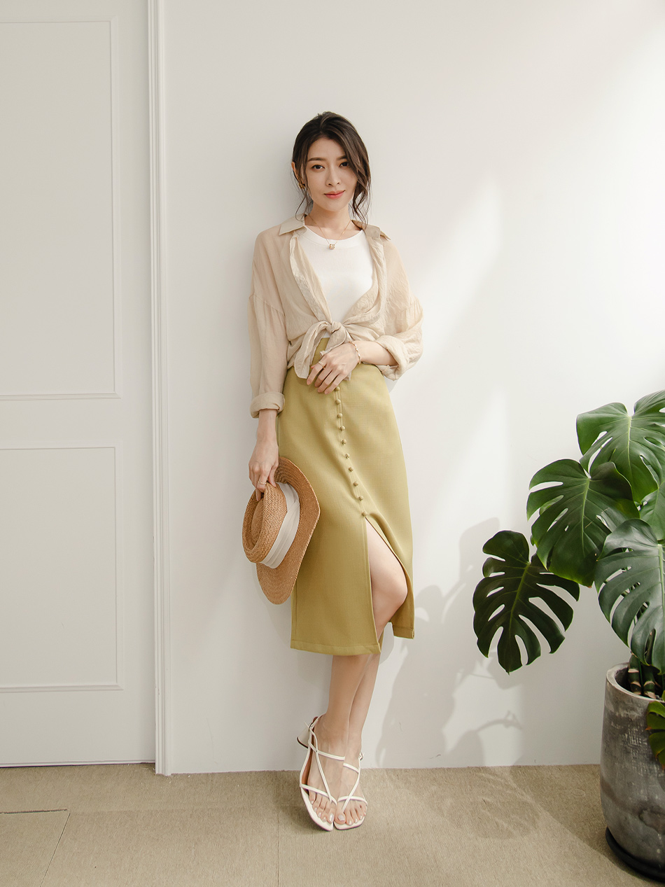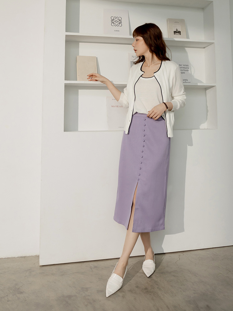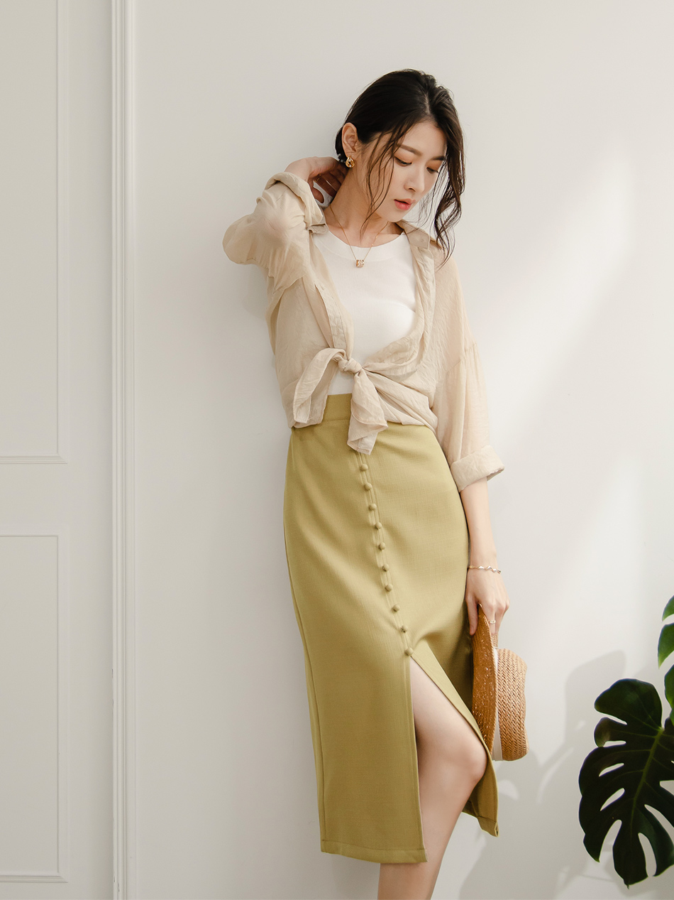 Product Feature: โ Elegant midi skirt with refined button detailing โ Features a flattering slit at the hem โ Designed for both casual and semi-formal occasions โ Crafted from smooth, non-stretch fabric