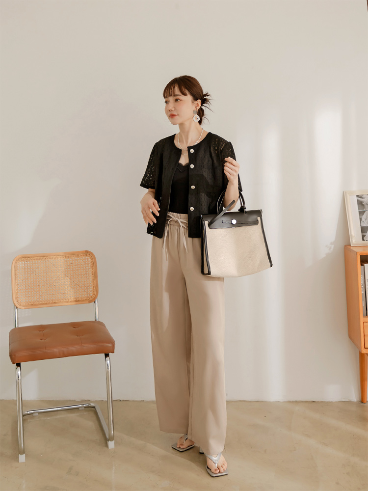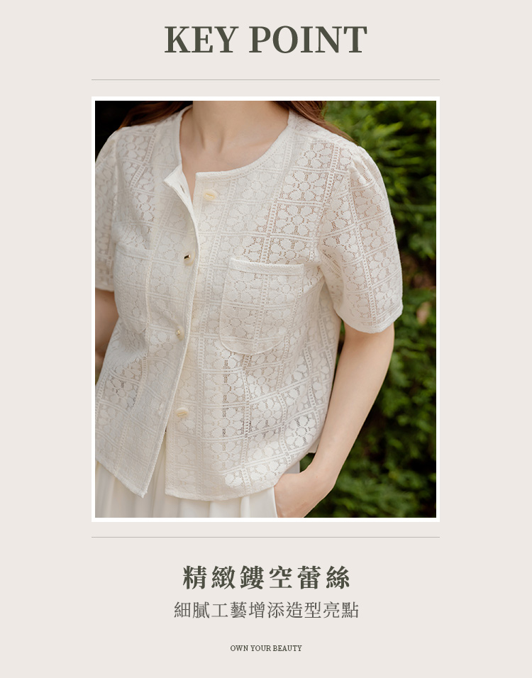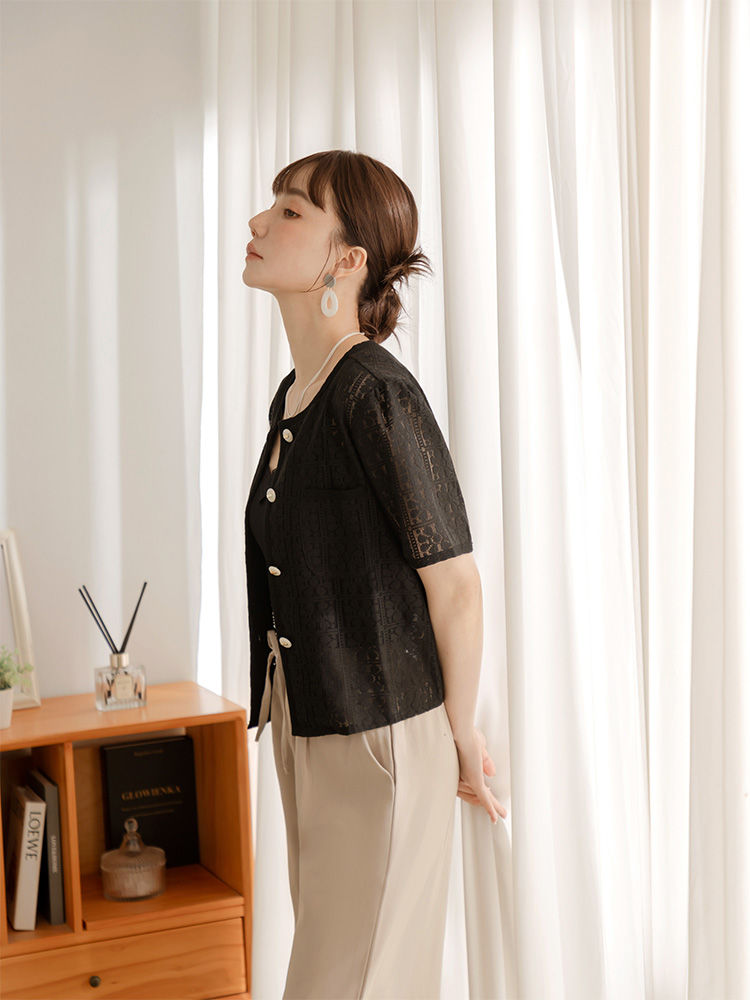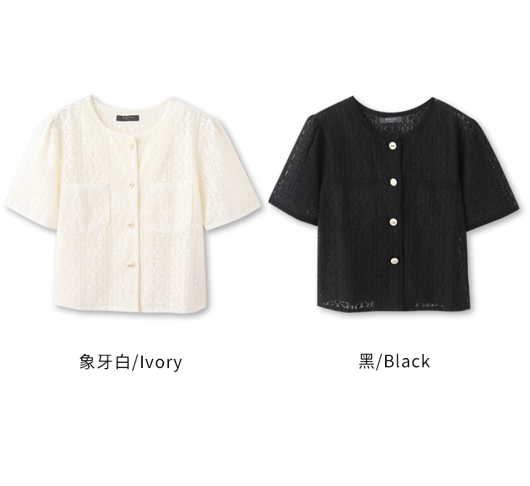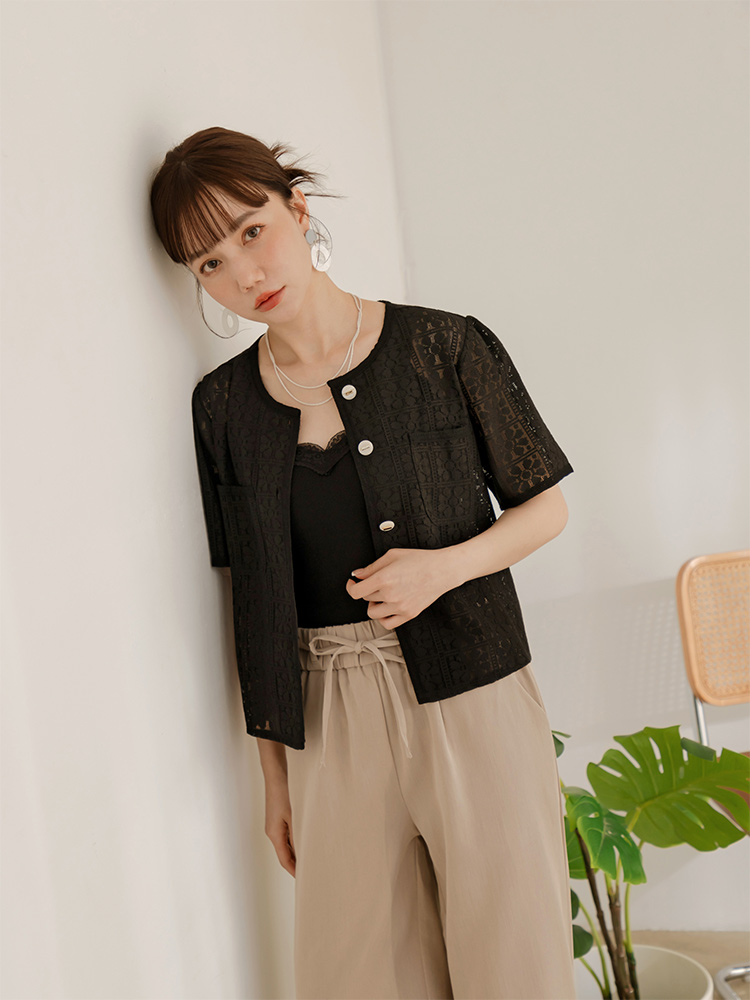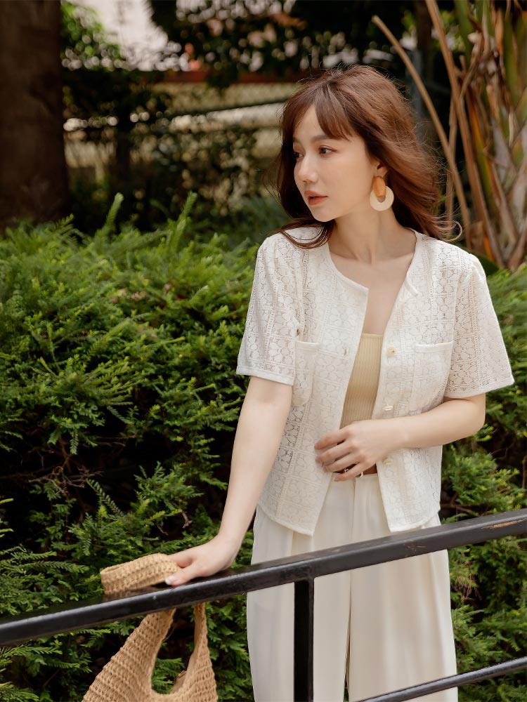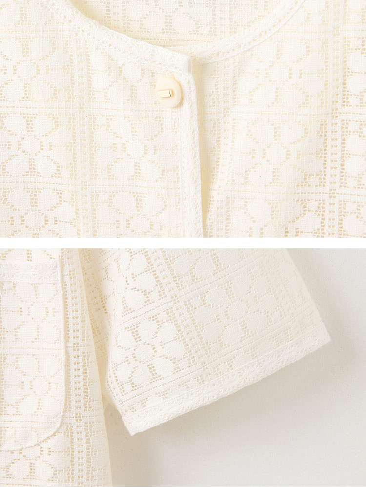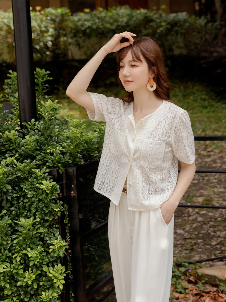 Product Feature: โ Crafted from delicate, open-work lace. โ Features real pockets. โ Adorned with stylish metallic buttons. โ Cropped length to flatter your figure.