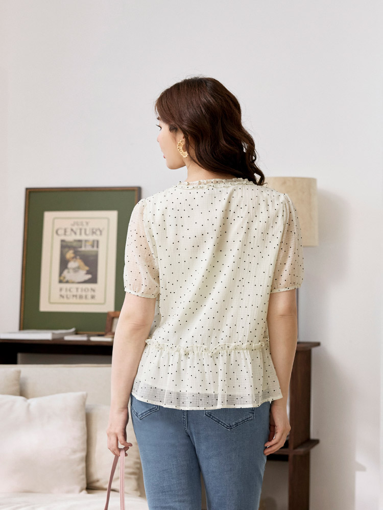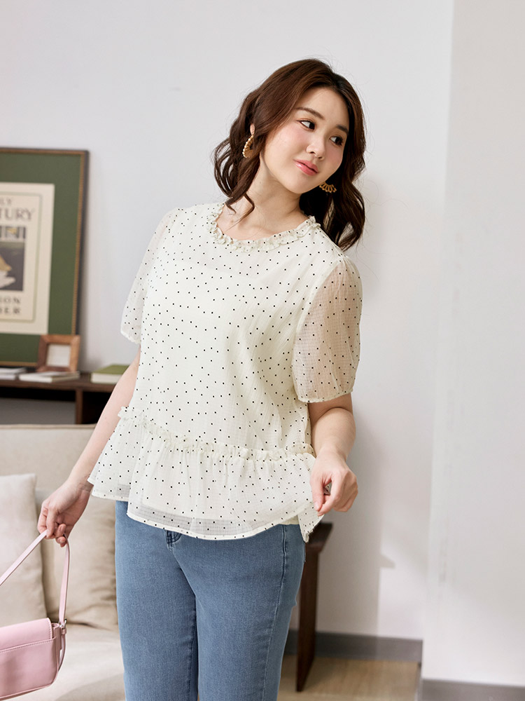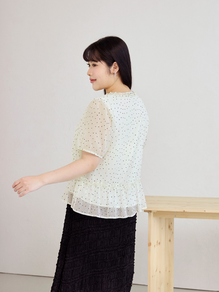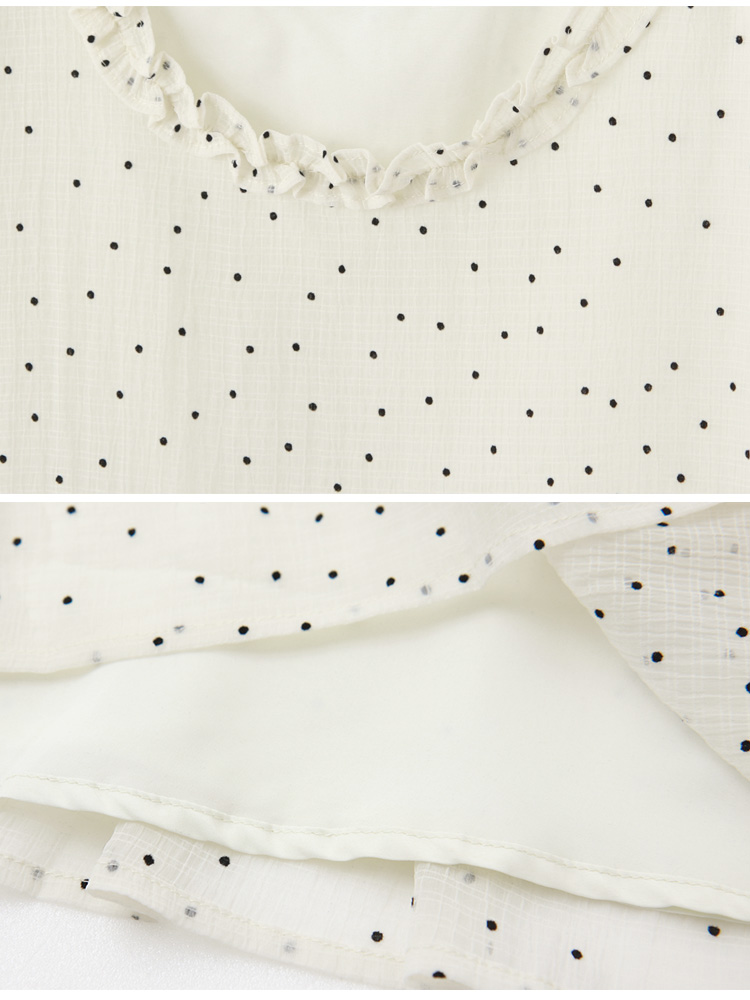 Product Feature: โ Features a charming dotted ruffle collar. โ Designed with flattering bubble sleeves. โ Cut in an A-line shape to enhance the silhouette. โ Includes a full lining for comfort and coverage.