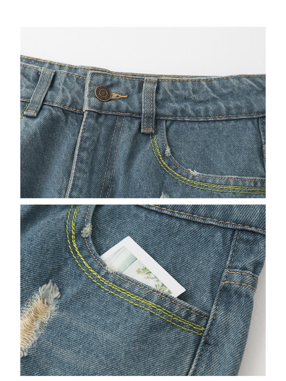 Product Feature: โ Crafted from breathable cotton denim. โ Features a stylish ripped design and frayed hems. โ Relaxed fit with slightly wider legs to flatter the thighs.