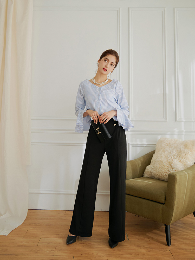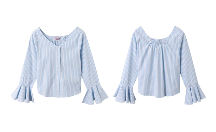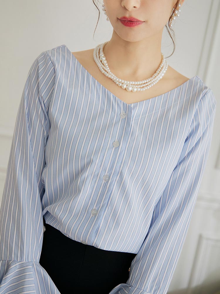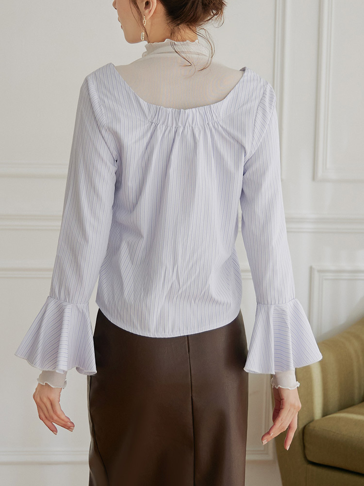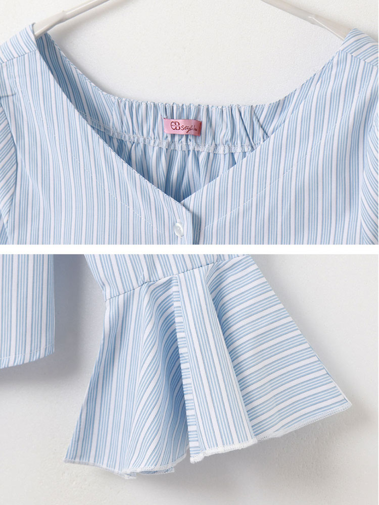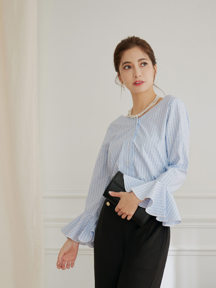 Product Feature: โ Crafted from a skin-friendly, blended striped fabric. โ Features a 2-way collar design for versatile styling. โ Designed with ruffle sleeves for a touch of romance.