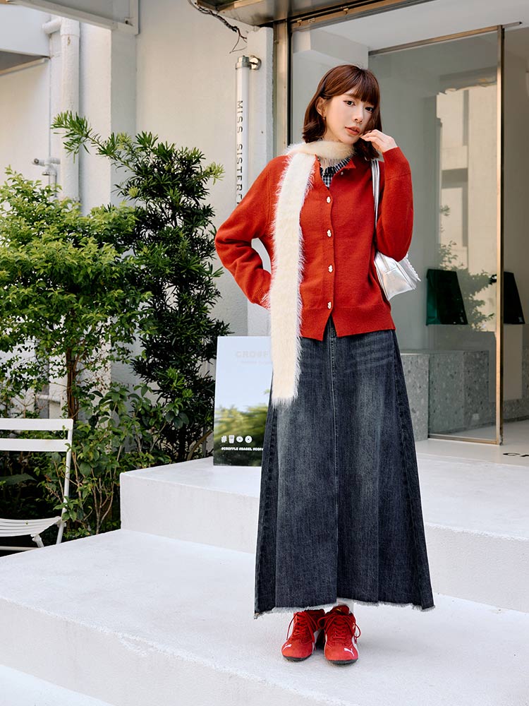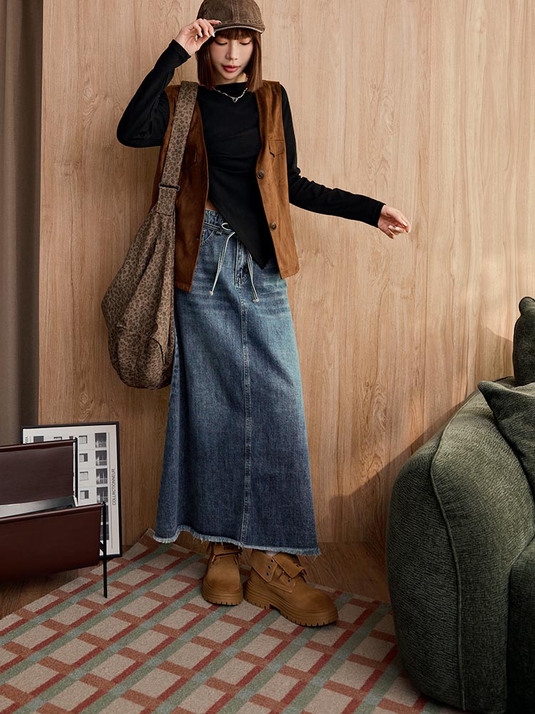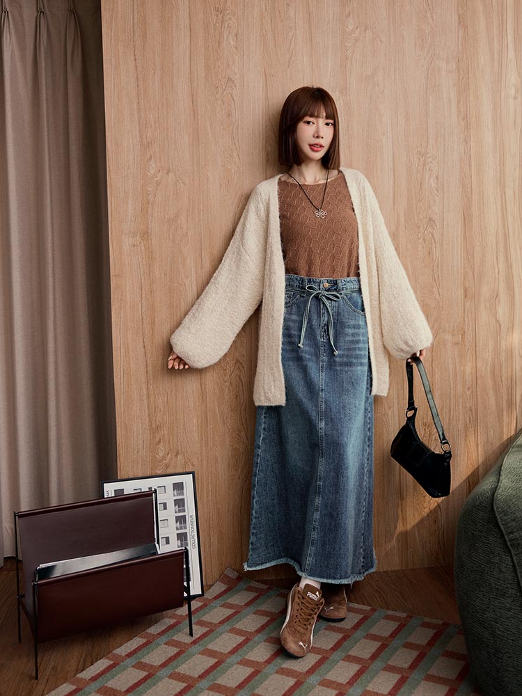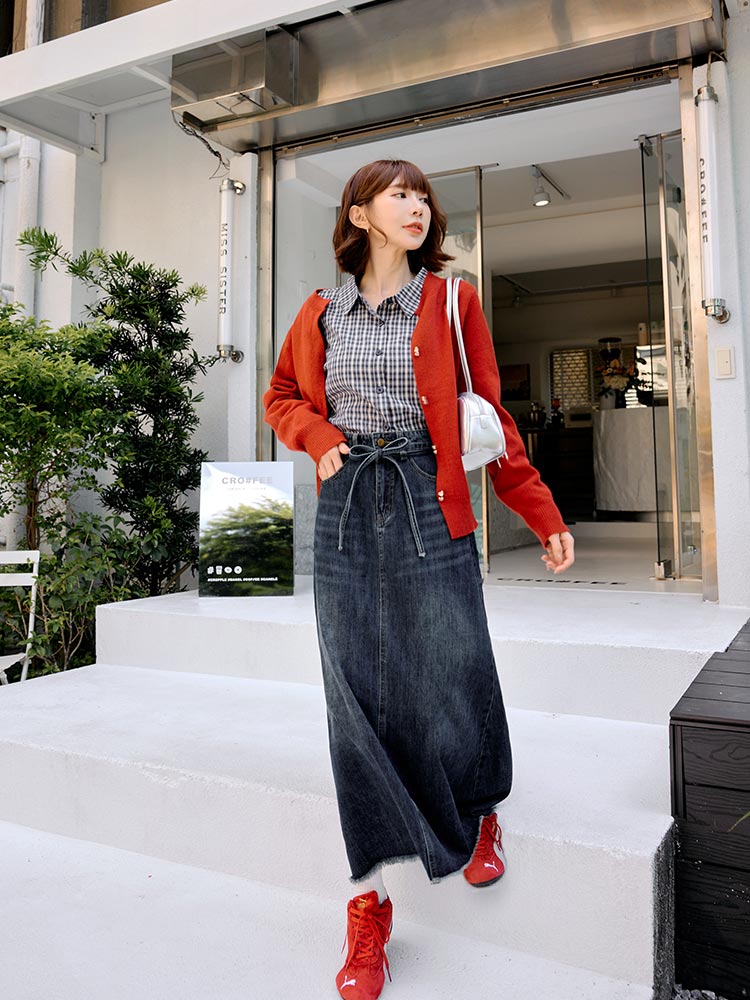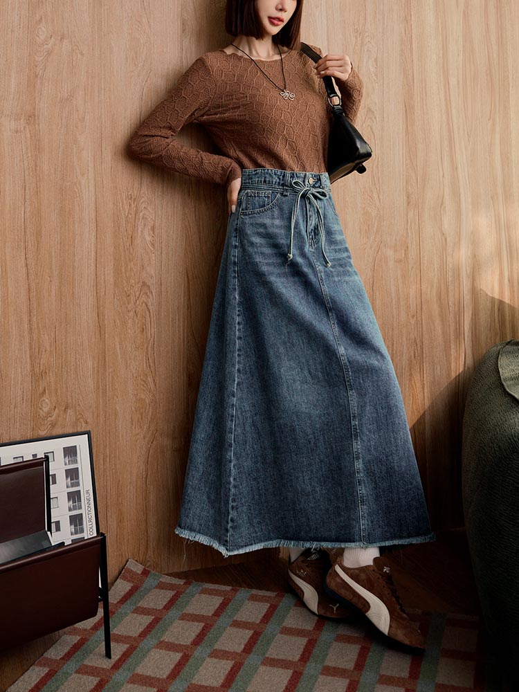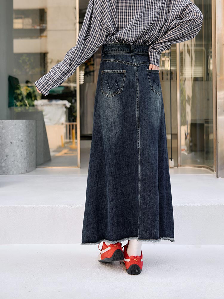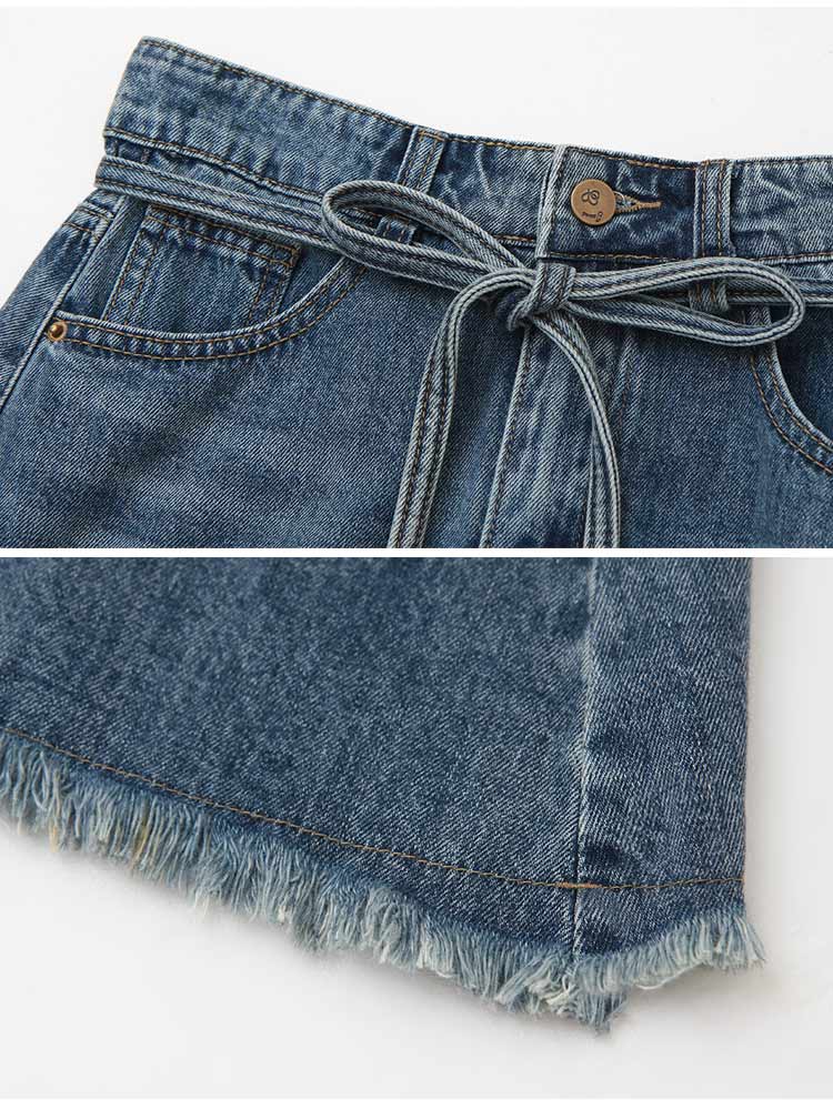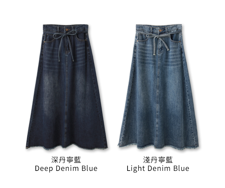 Product Feature: โ Crafted from soft, comfortable cotton denim โ Features a stylish A-line cut to flatter your figure โ Includes a detachable, adjustable belt to define your waist โ Designed with functional front pockets for convenience.
