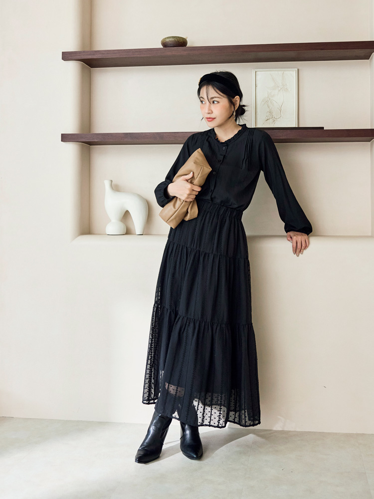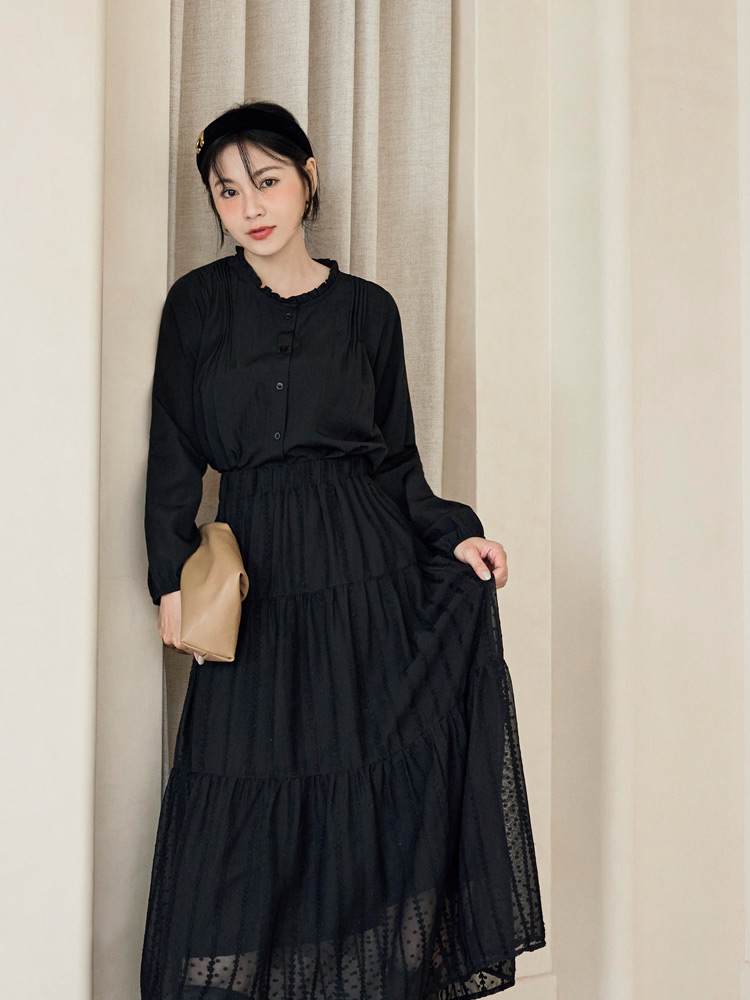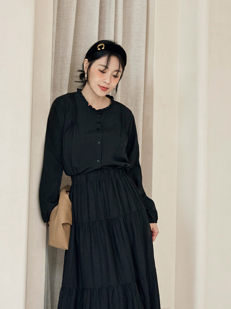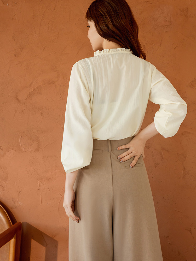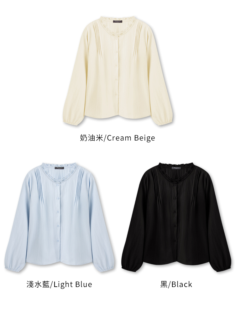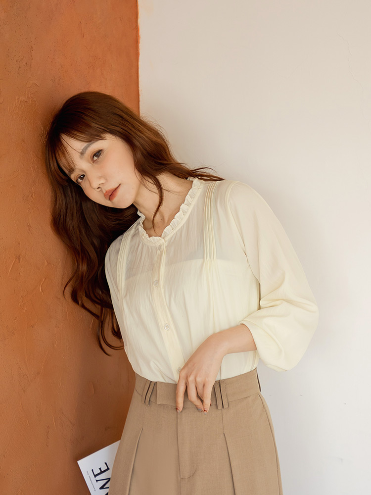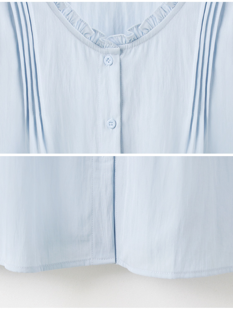 Product Feature: โ Features a delicate ruffled collar for a touch of elegance. โ Crafted from a lightweight, comfortable fabric. โ Pleated design to flatter the shoulders. โ Button-down front.