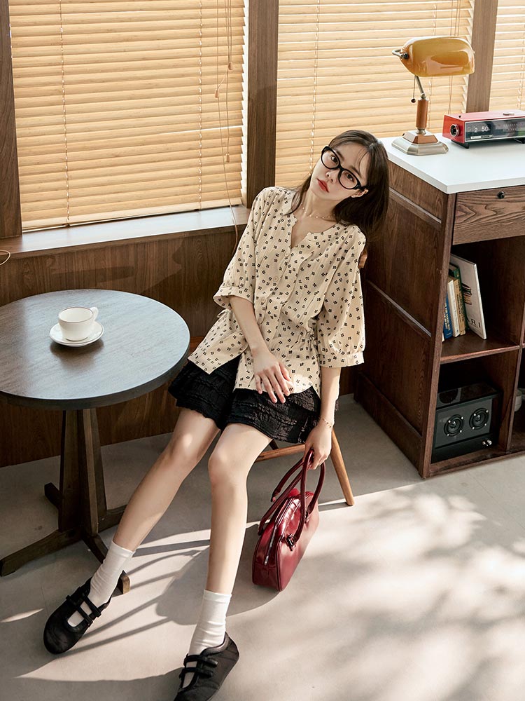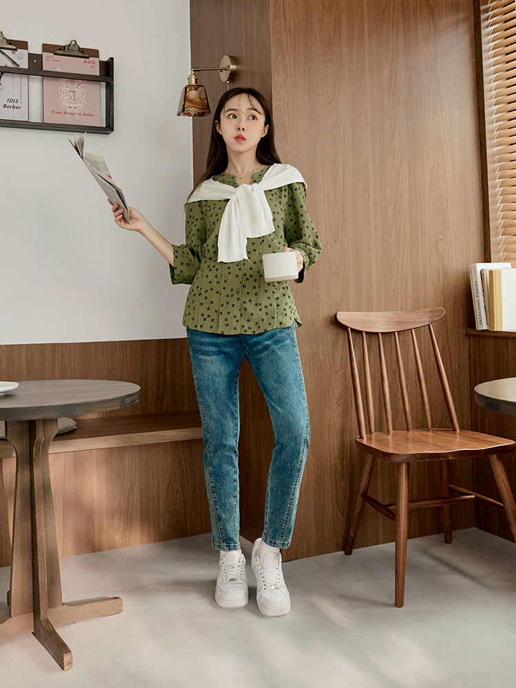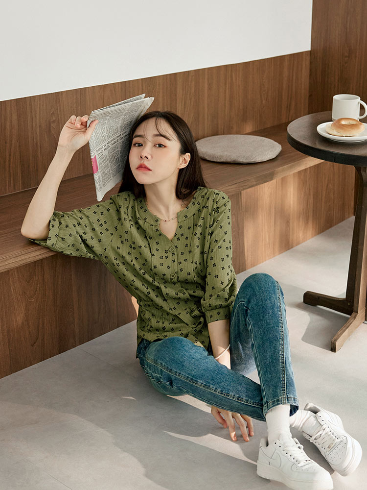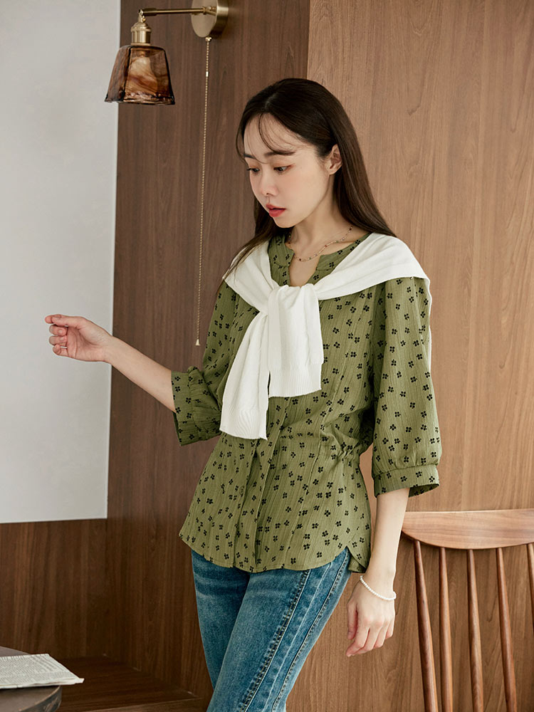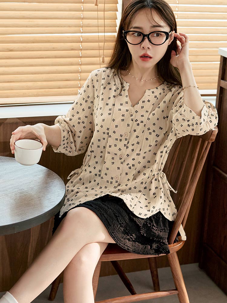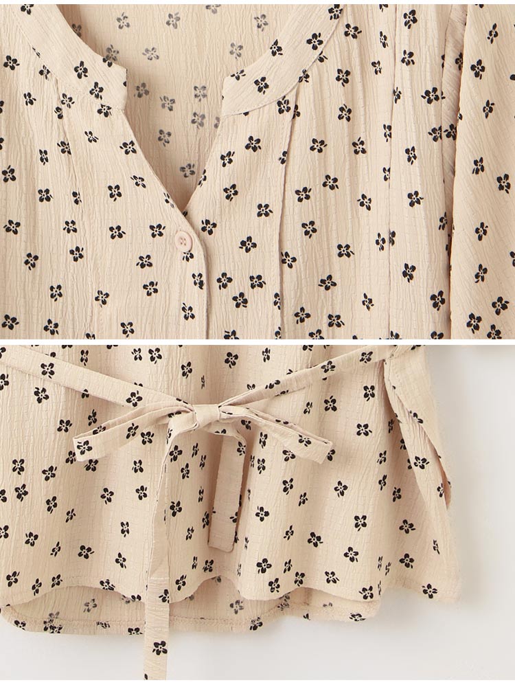 Product Feature: โ Features a charming all-over floral pattern. โ Designed with a flattering V-neckline. โ Adjustable tie-back detail for a custom fit. โ Button-down front.