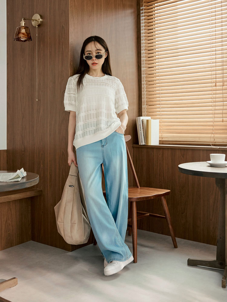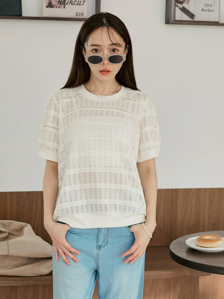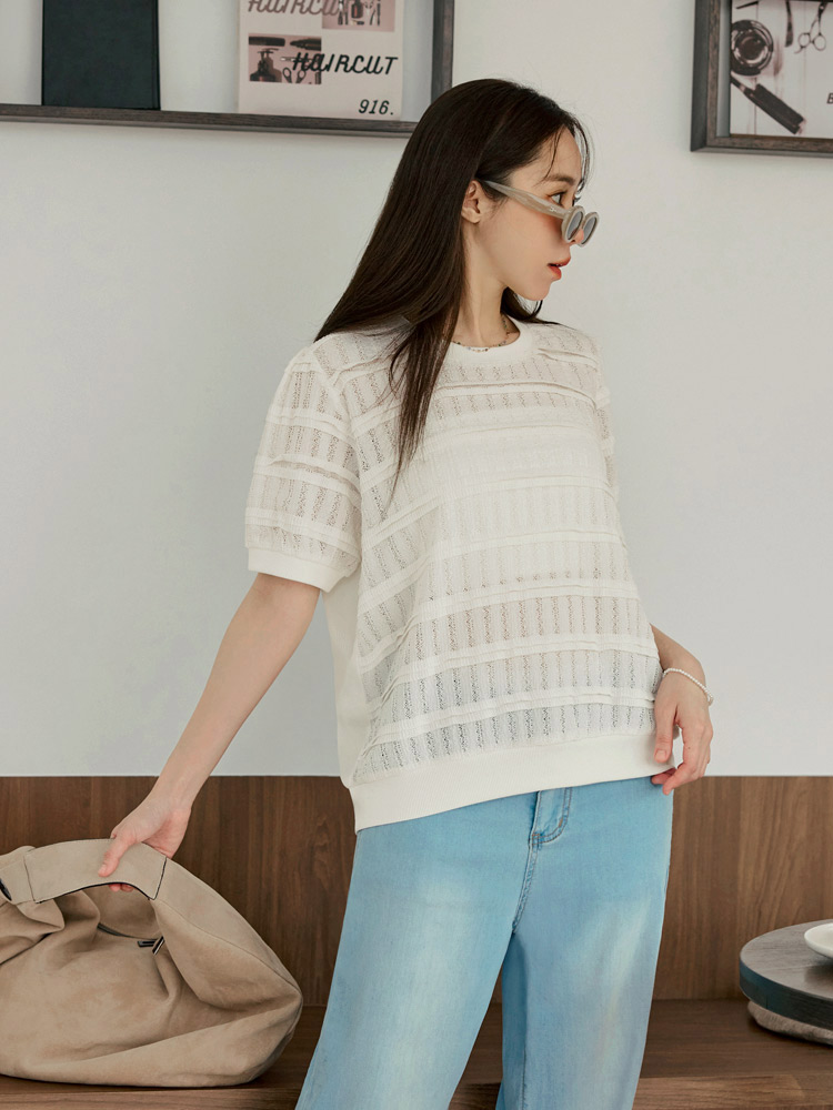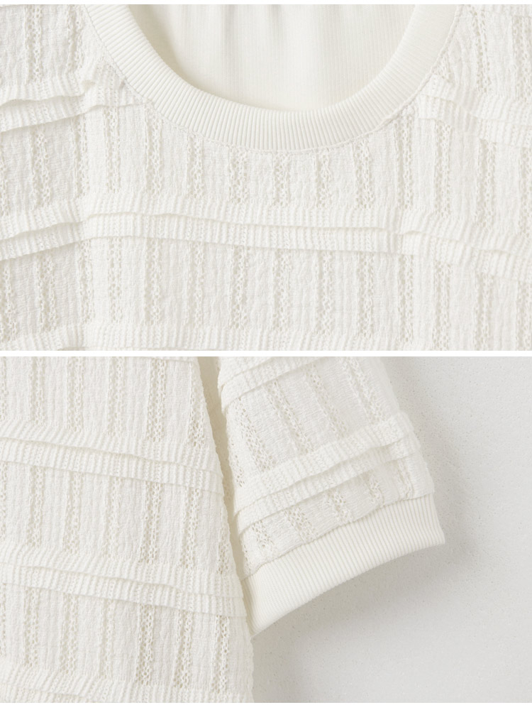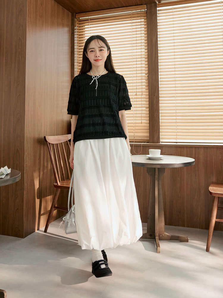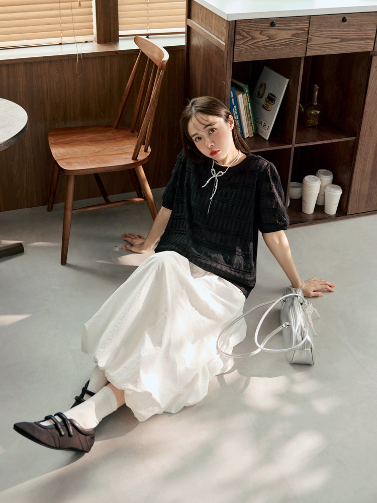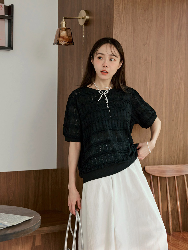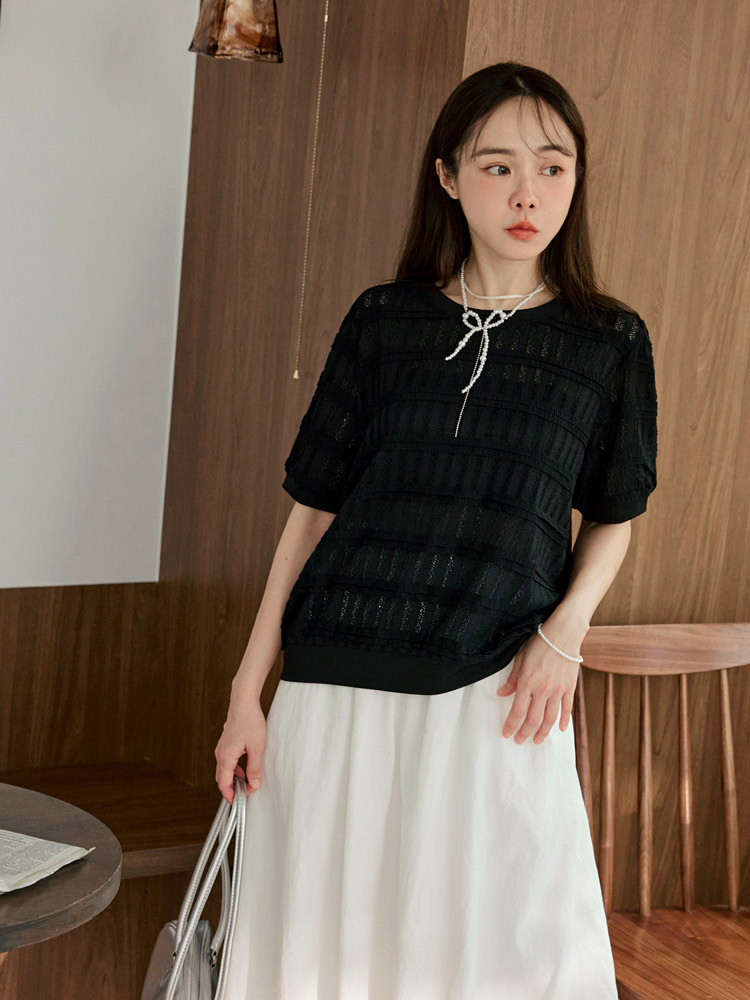 Product Feature: โ Features a comfortable, slightly sheer, and stretchy fabric. โ Delicate crochet detailing. โ Designed with elasticated neckline, cuffs, and hem. โ Flattering puff sleeves to gently cover the arms.