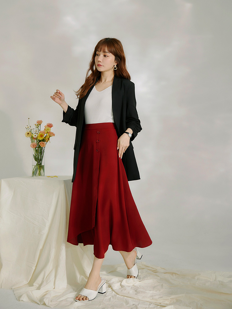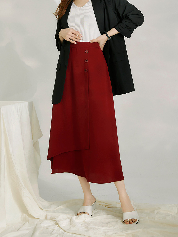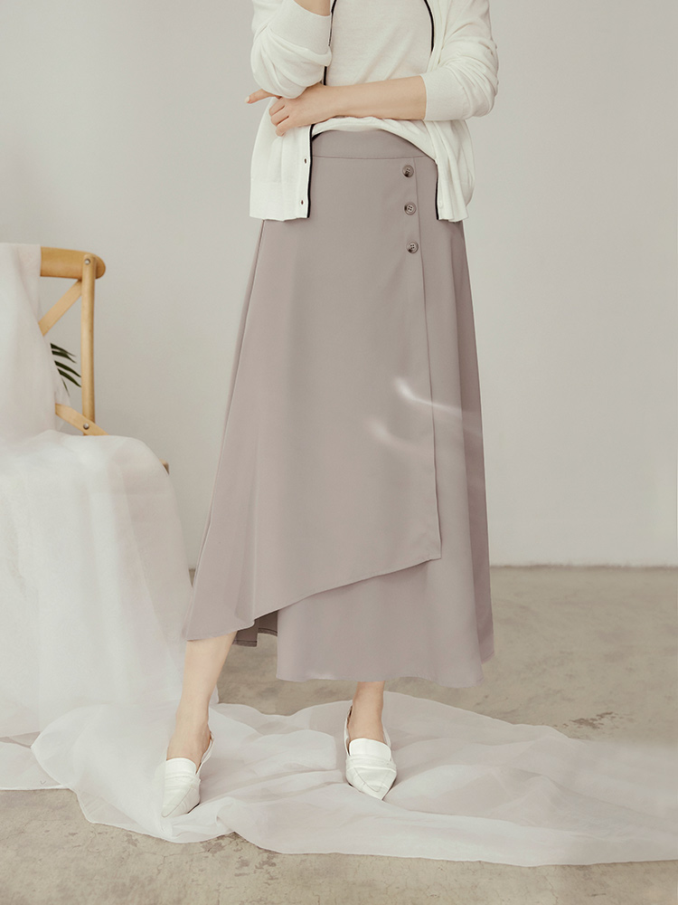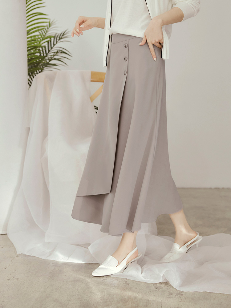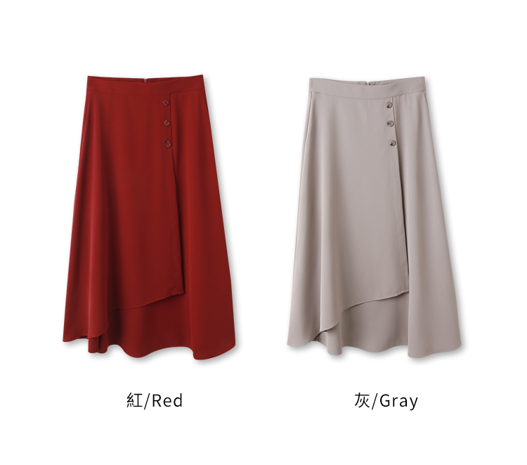 Product Feature: โ Crafted from crease-resistant fabric for easy care. โ Features decorative button detailing. โ Designed with an asymmetric, layered skirt for added dimension. โ Concealed zip at the back for a smooth finish.