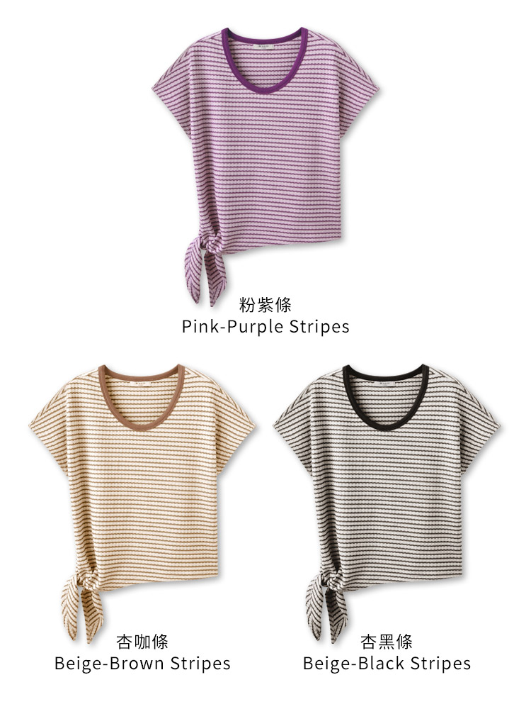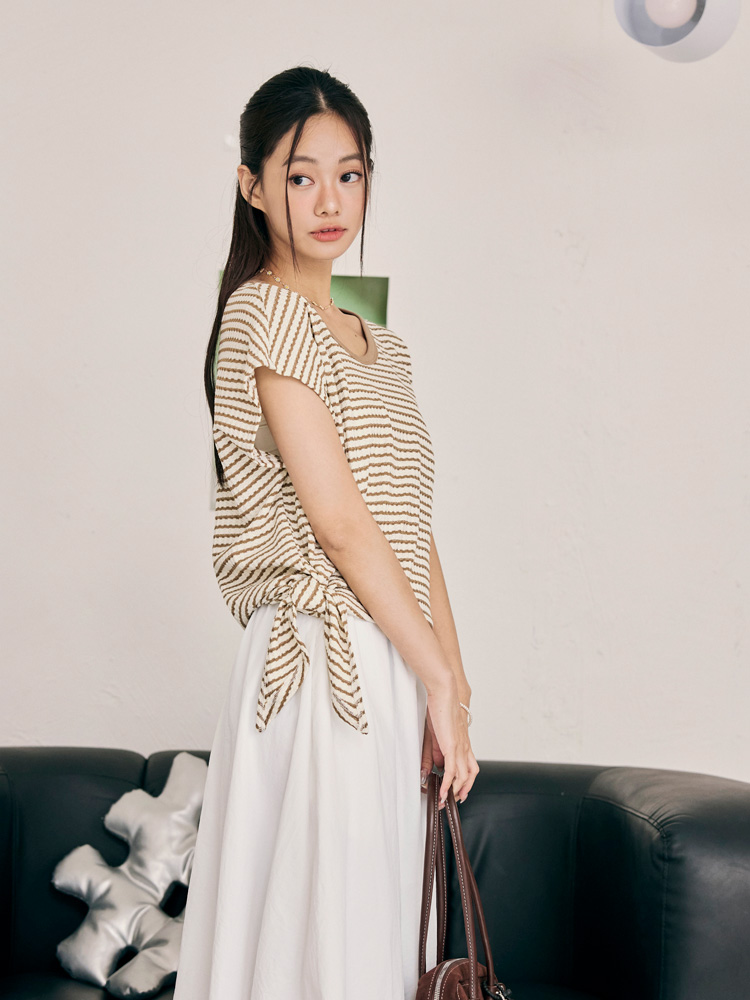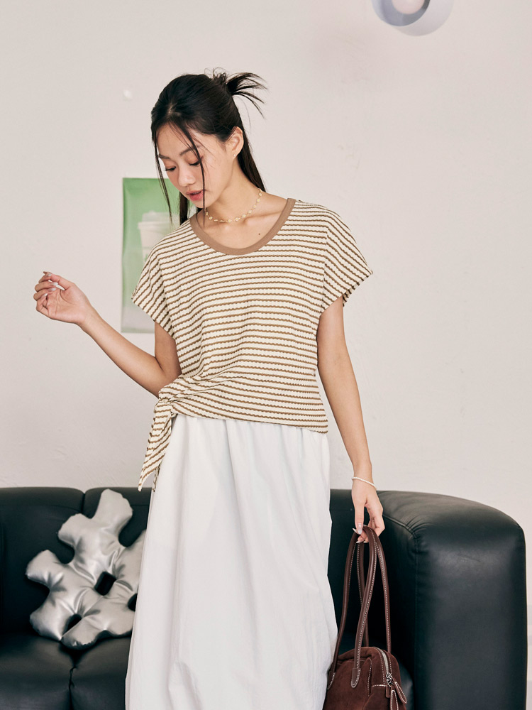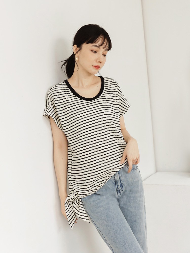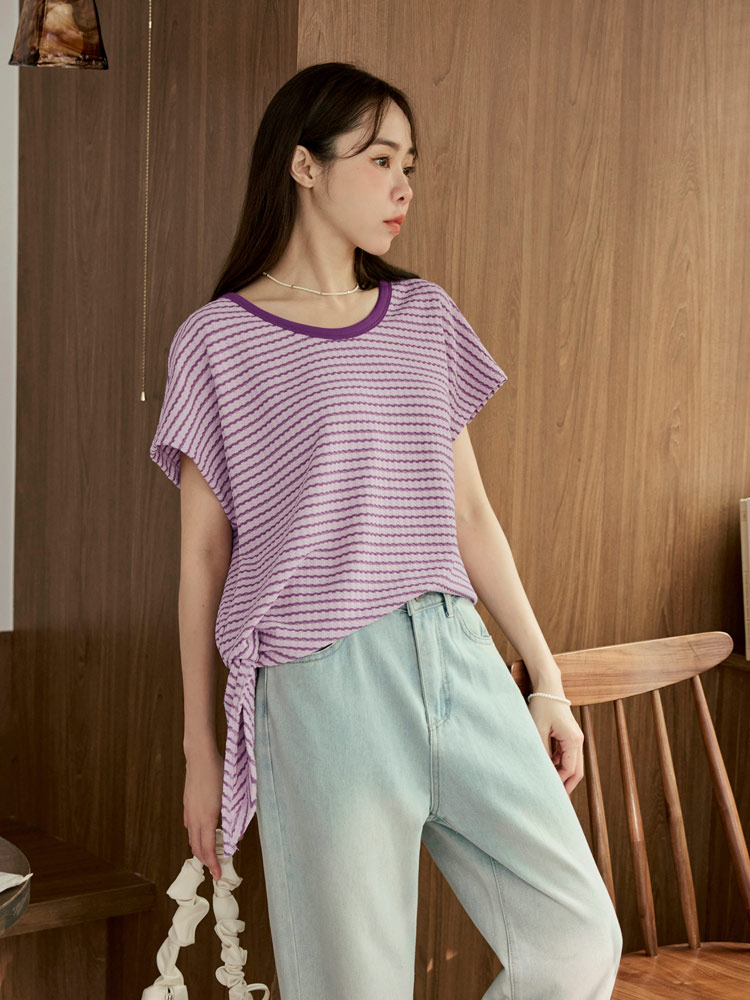 Product Feature: โ Crafted from a soft, breathable fabric. โ Features a flattering, relaxed shoulder design. โ Stylish tie-side detail. โ Designed with textured stripe.
