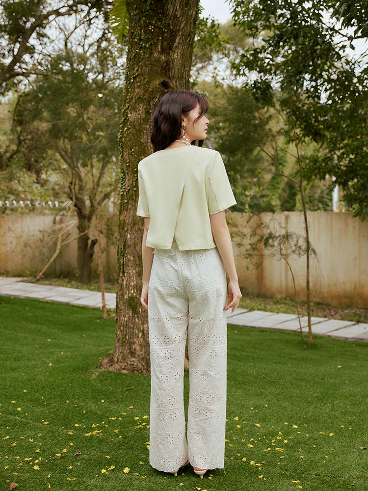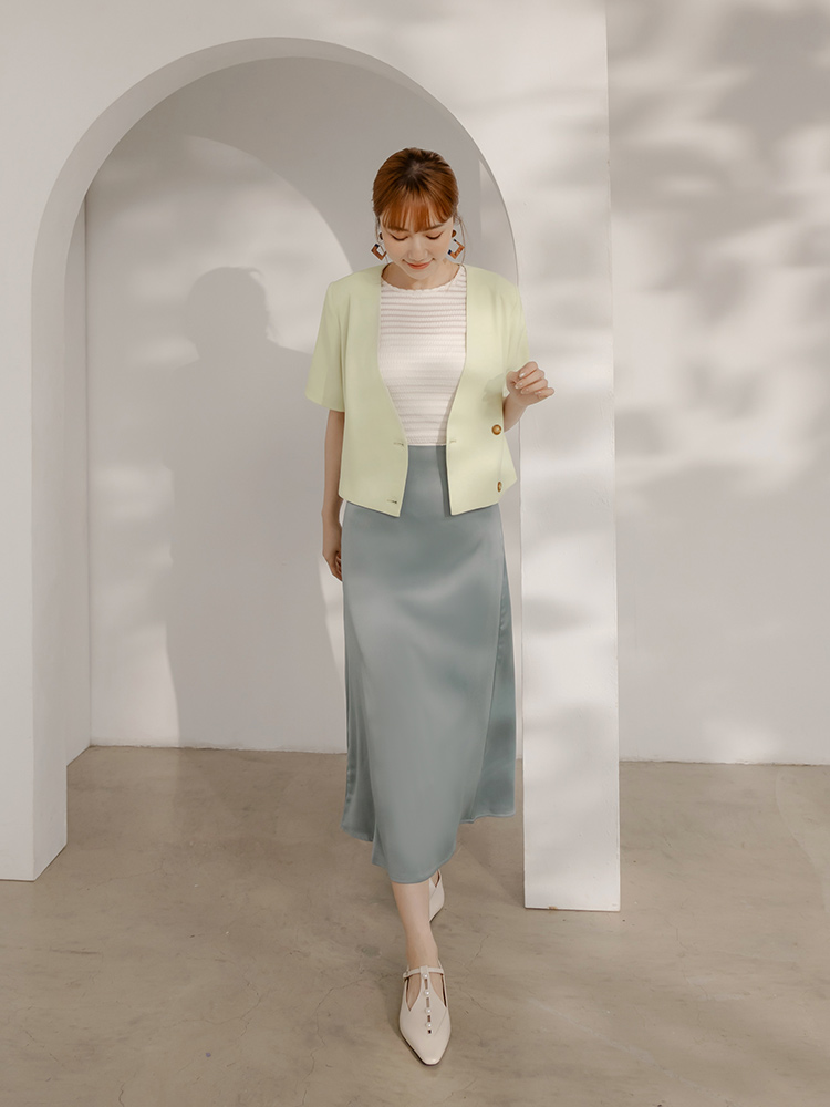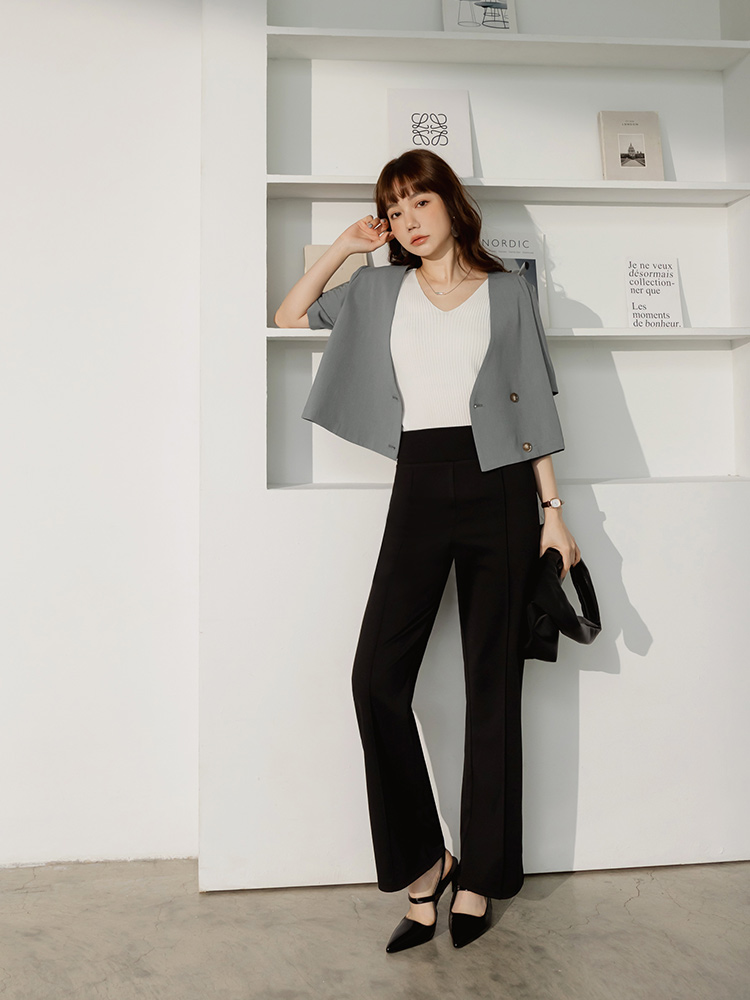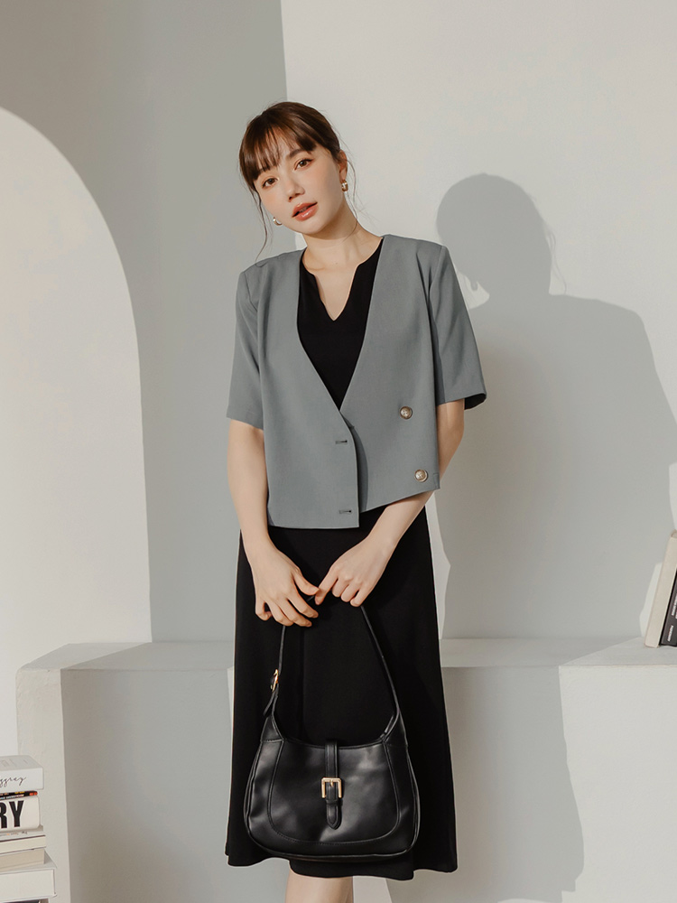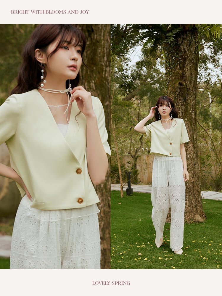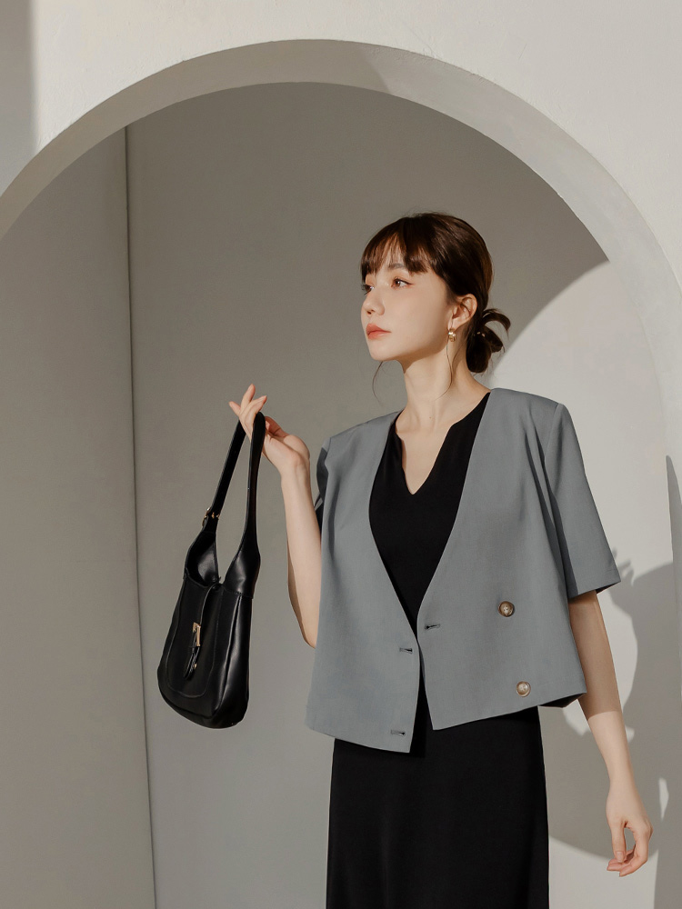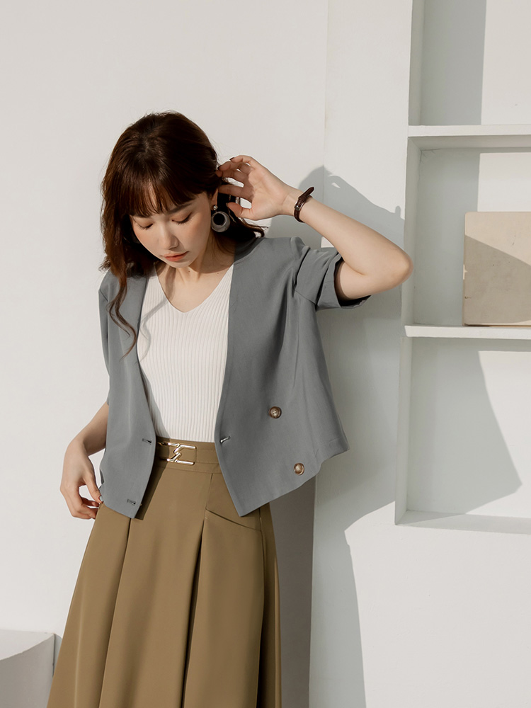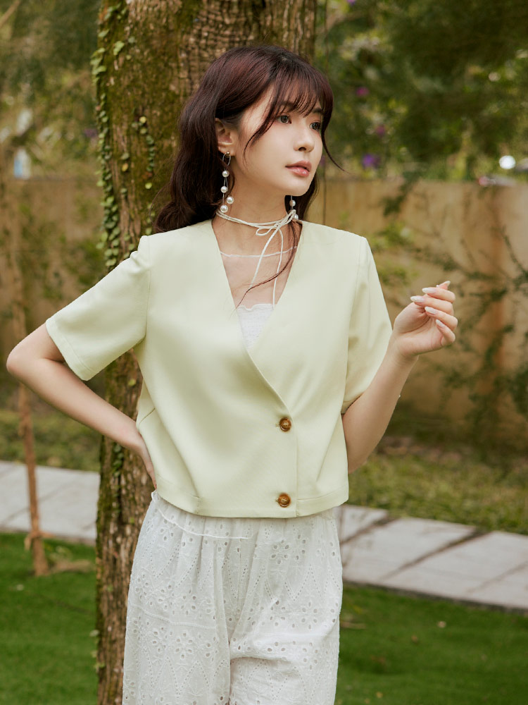 Product Feature: โ Crafted from smooth, refined suiting fabric โ Features a flattering, lightly padded shoulder design โ Elegant, subtle amber buttons add a touch of finesse โ Stylish cropped cut for a modern silhouette