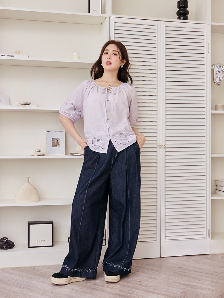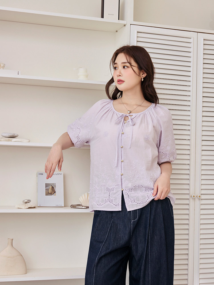 Embroidered Puff Sleeve Top with Tie Detail (XL~4XL)