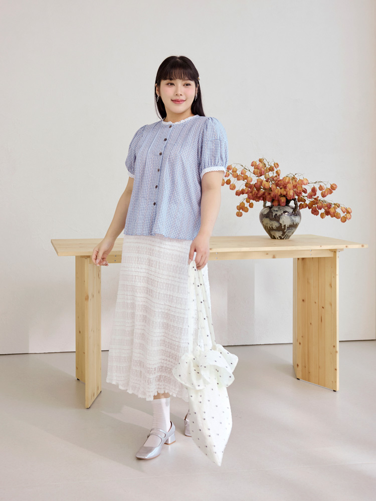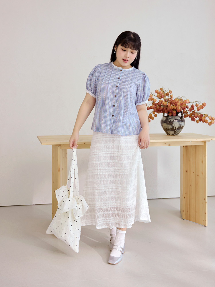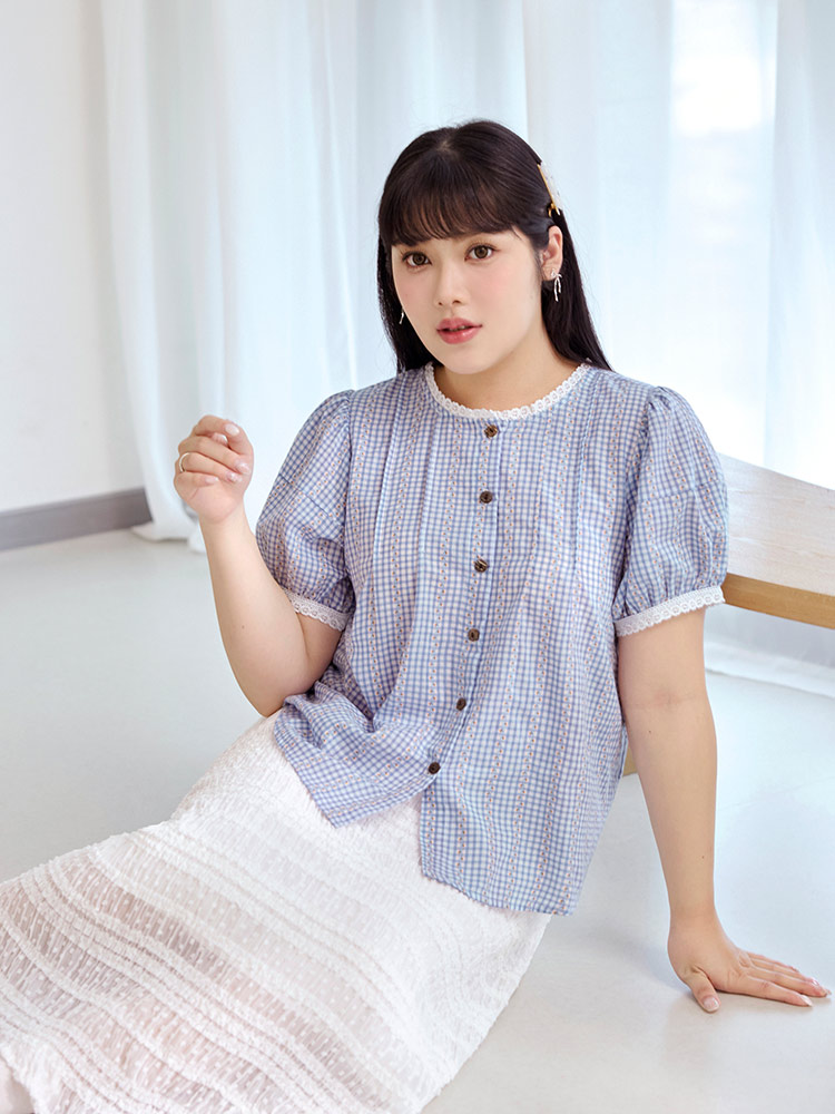 Cotton Checkered Lace Trim Puff Sleeve Top (XL~4XL)