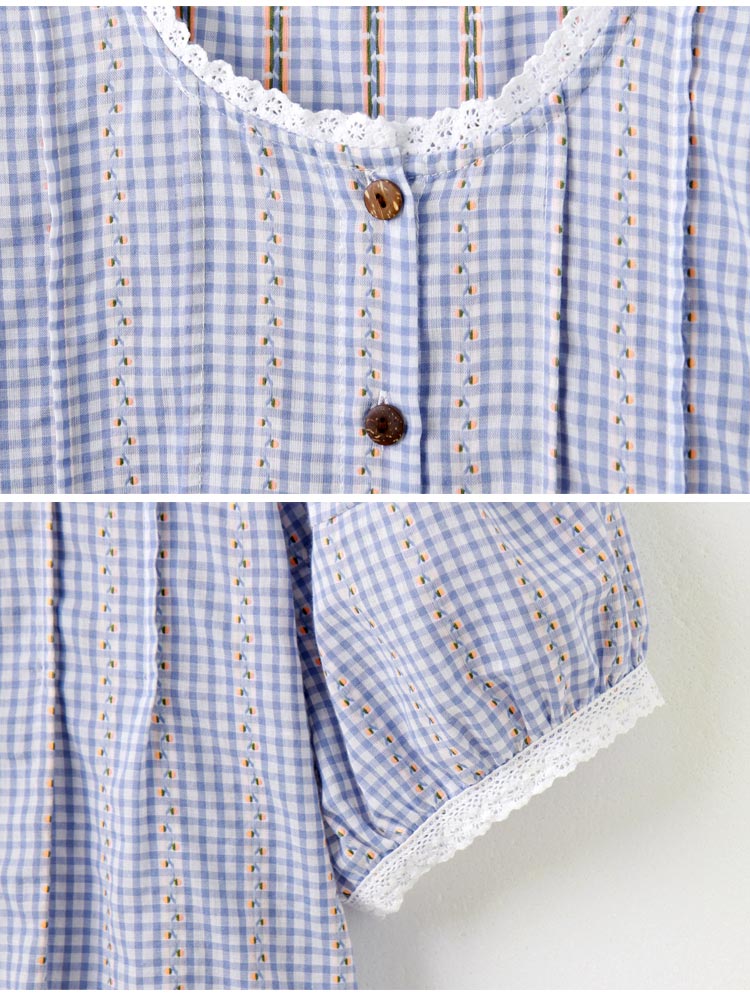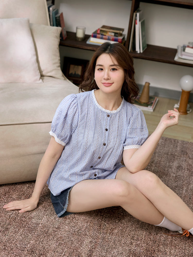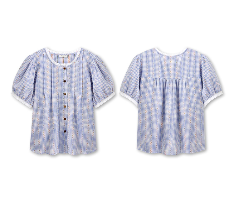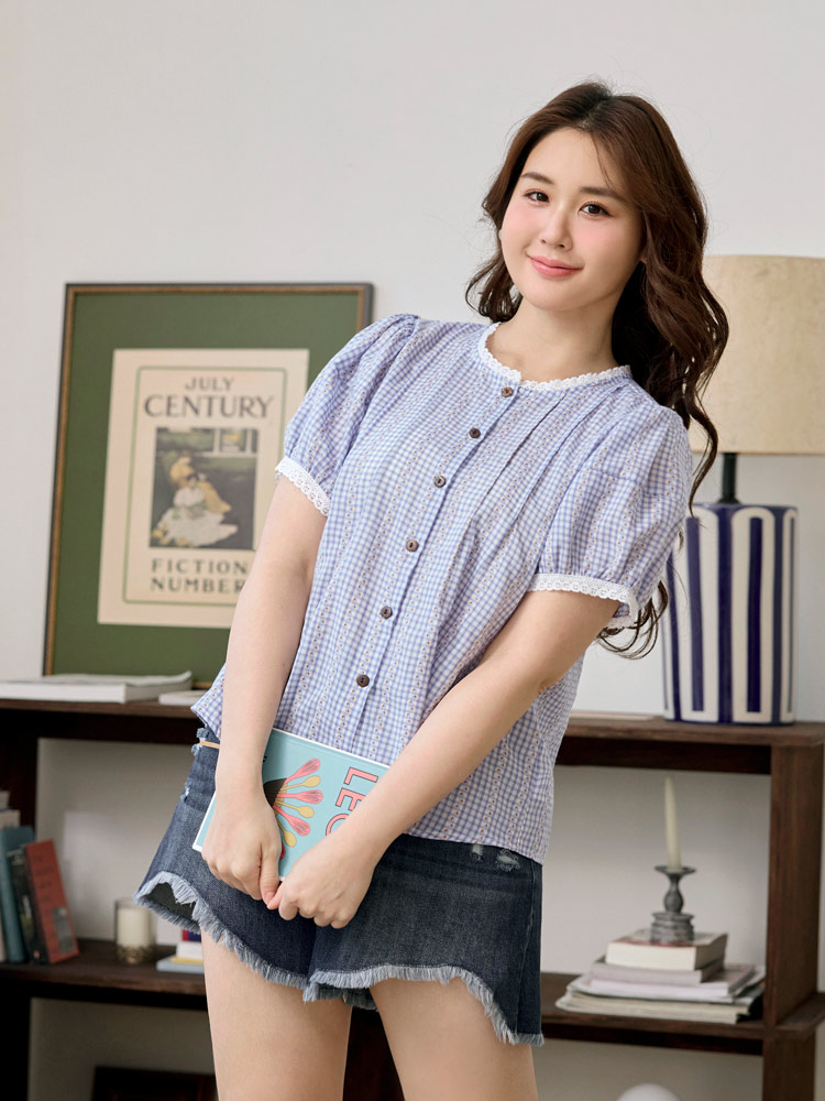 Product Feature: โ Crafted from soft, skin-friendly cotton check fabric โ Delicate lace trim detailing adds a touch of elegance โ Flattering puff sleeves to subtly enhance the arms โ Features a full button-down design for versatile styling