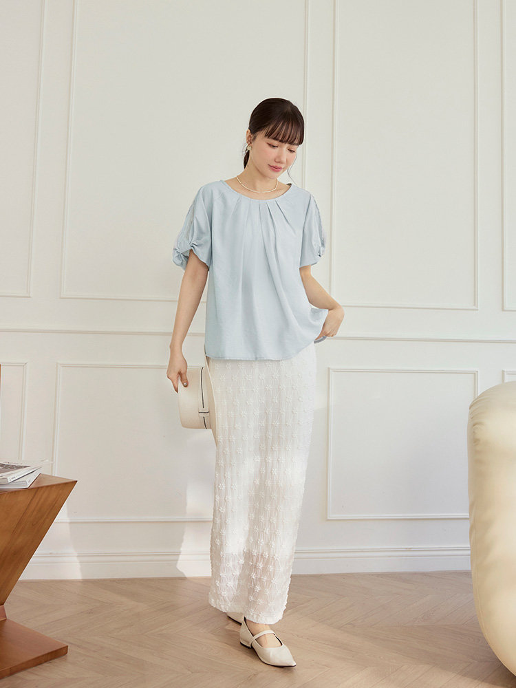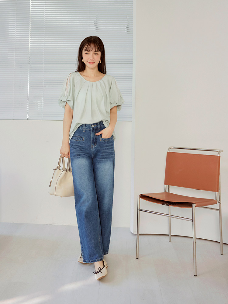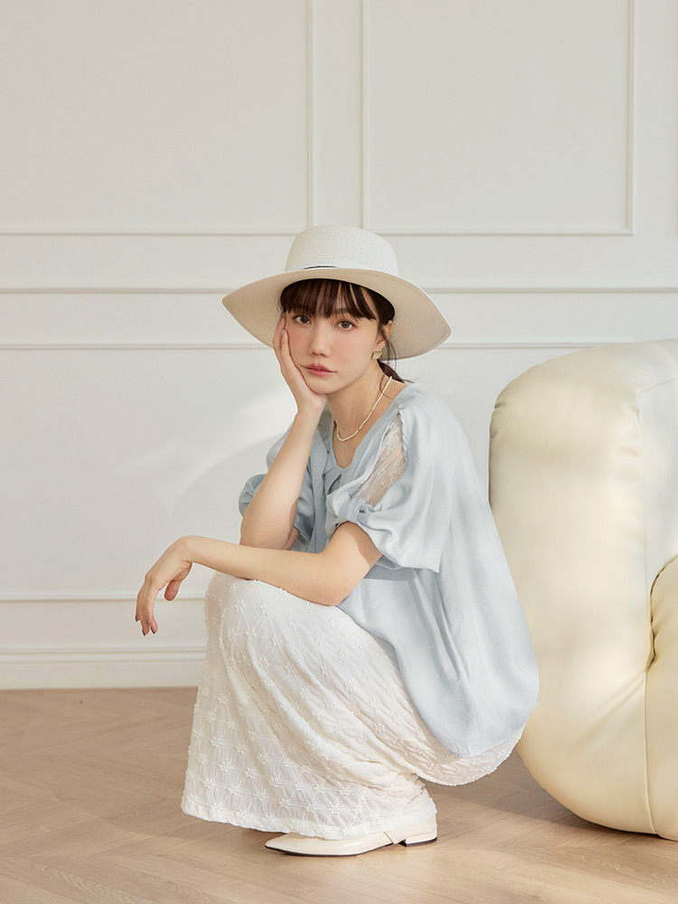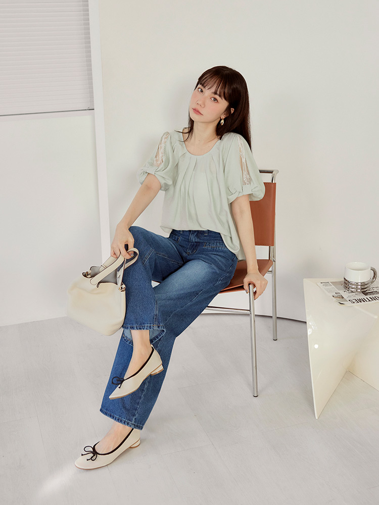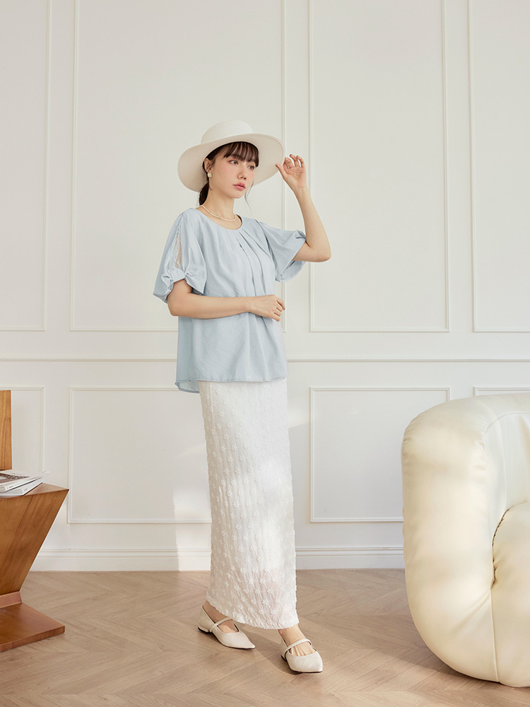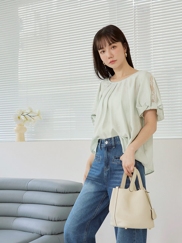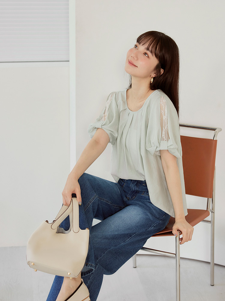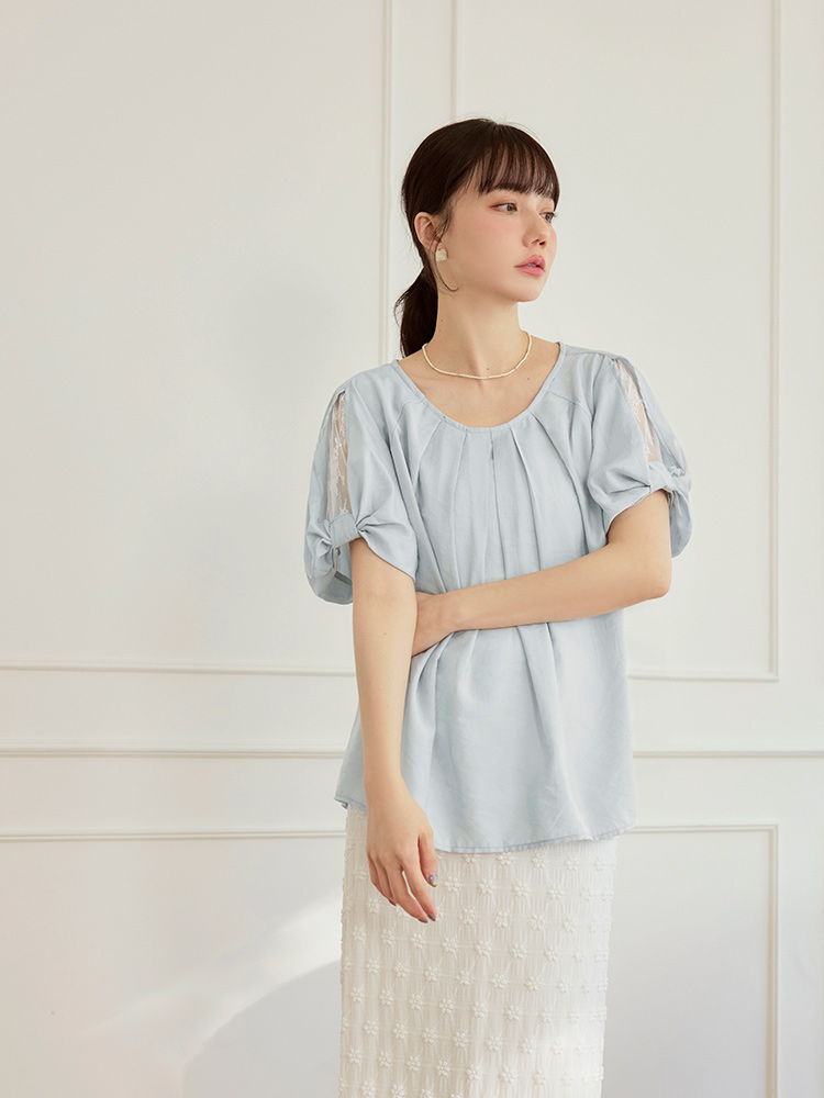 Product Feature: โ Features delicate, sheer lace panelling โ Designed with flattering pleated puff sleeves โ Crafted from a soft, lightweight fabric for comfort โ Relaxed fit for easy wear