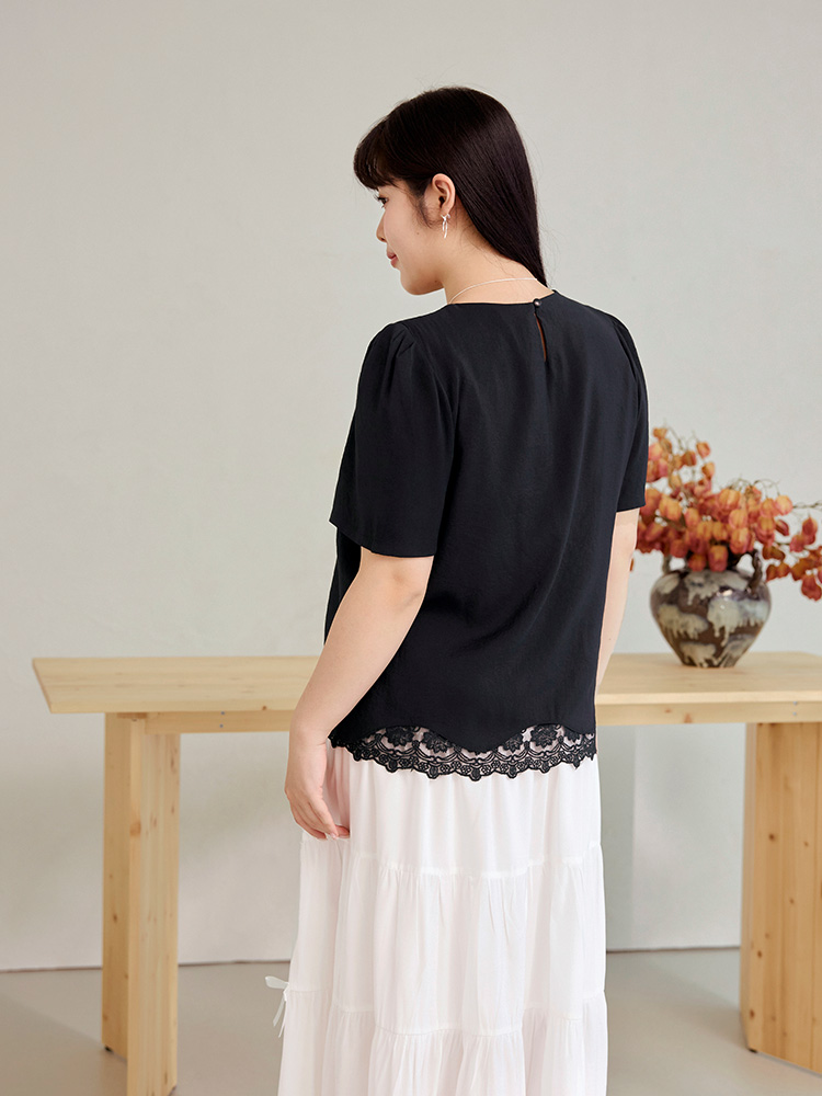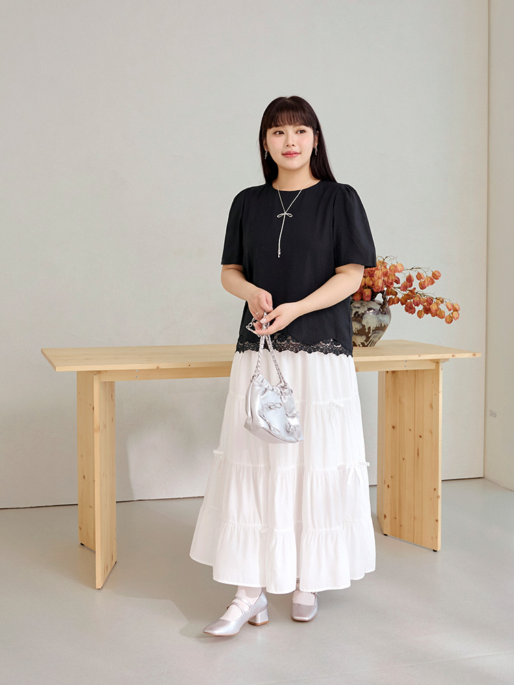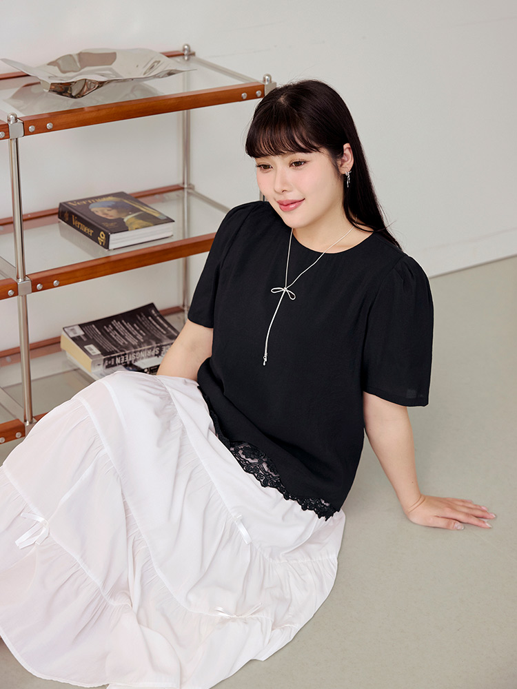 Product Feature: โ Crafted from a skin-friendly fabric with a delicate texture โ Features elegant lace detailing โ Flattering puff sleeves to subtly conceal the arms โ Designed with a flowing, wave-shaped hemline