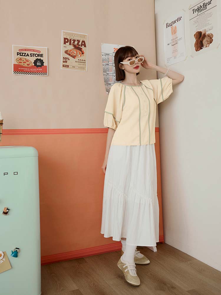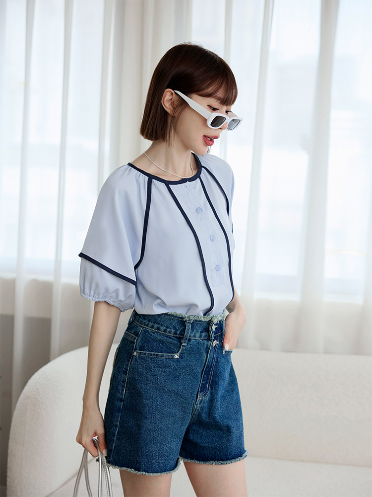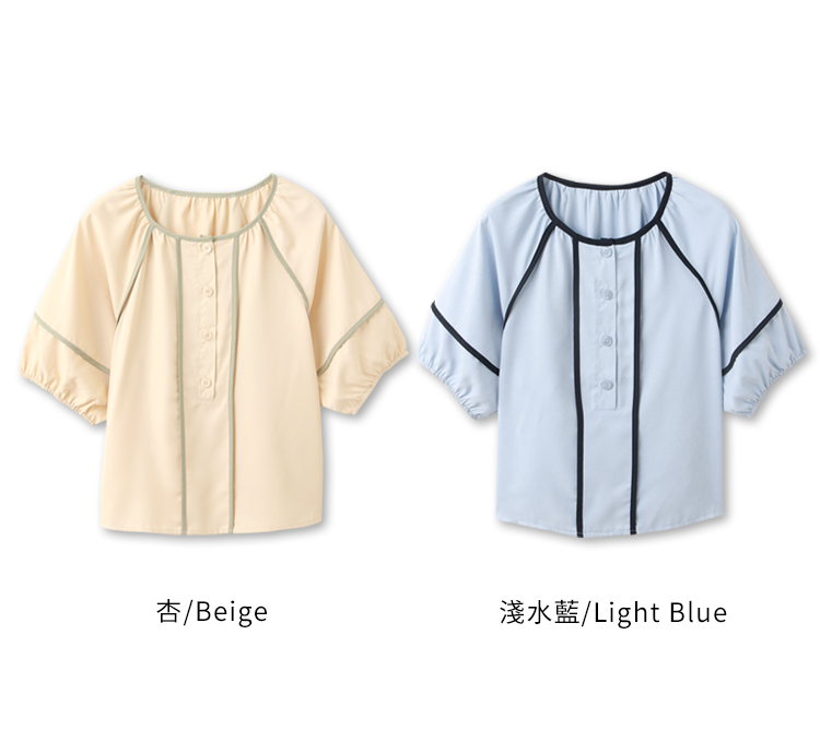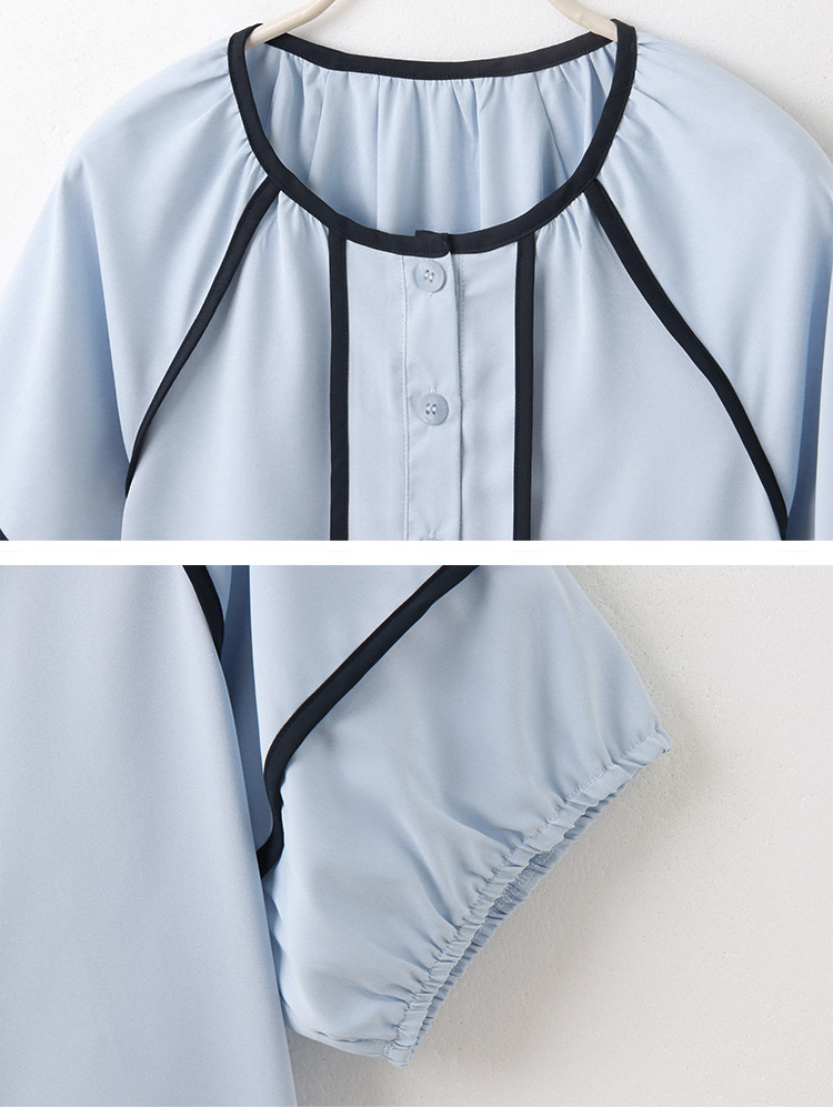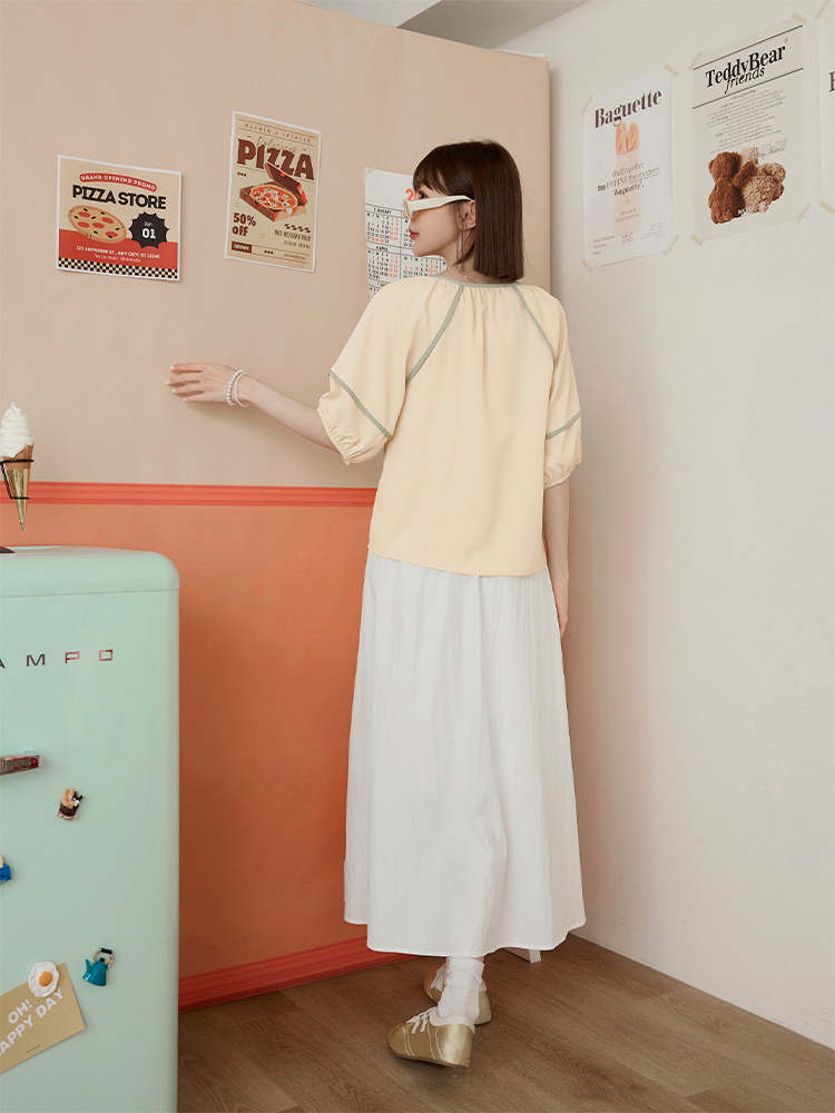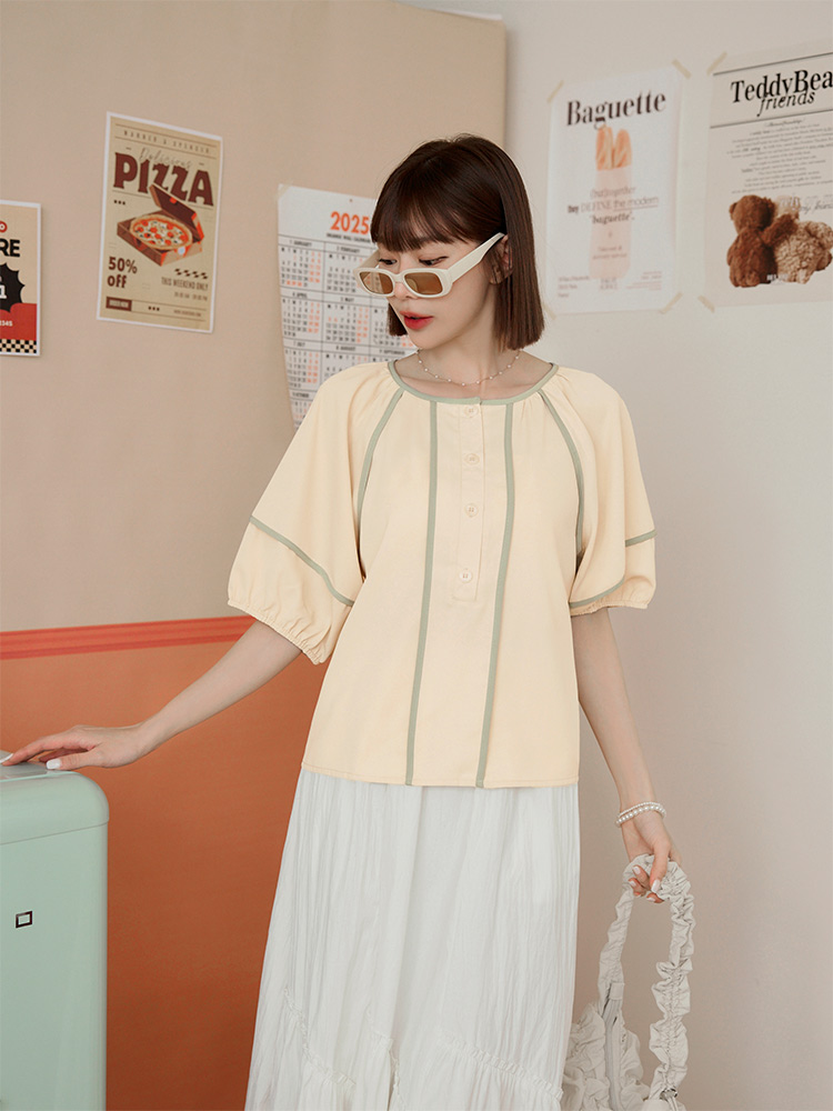 Product Feature: โ Features a flattering puff sleeve design โ Enhanced with a colour-block trim for a visual pop โ Crafted from a slightly stretchy blend for comfort