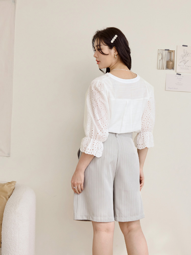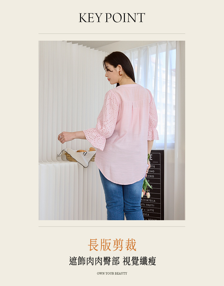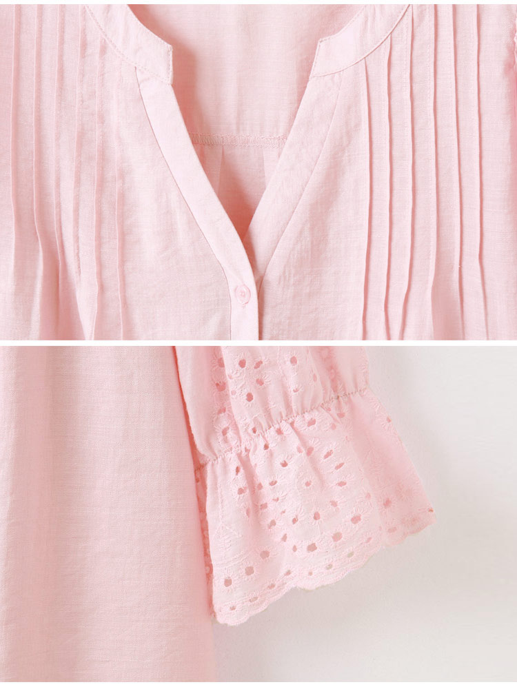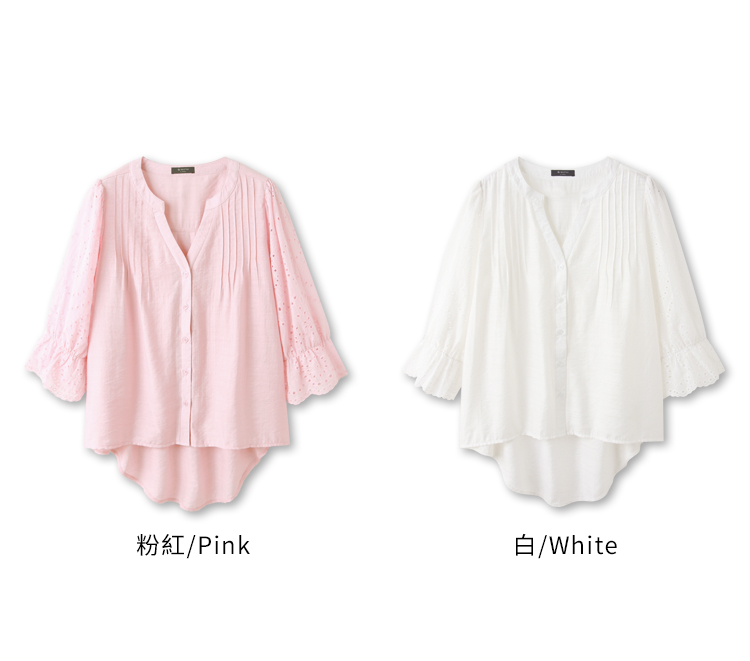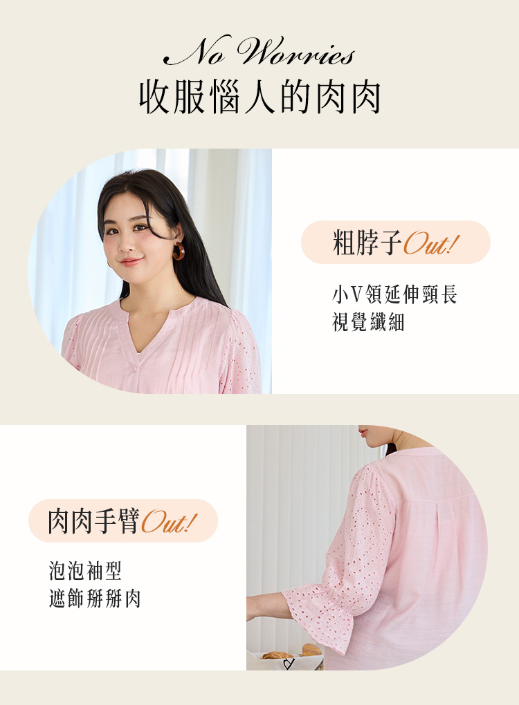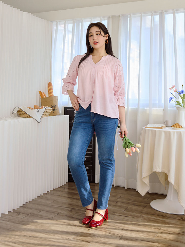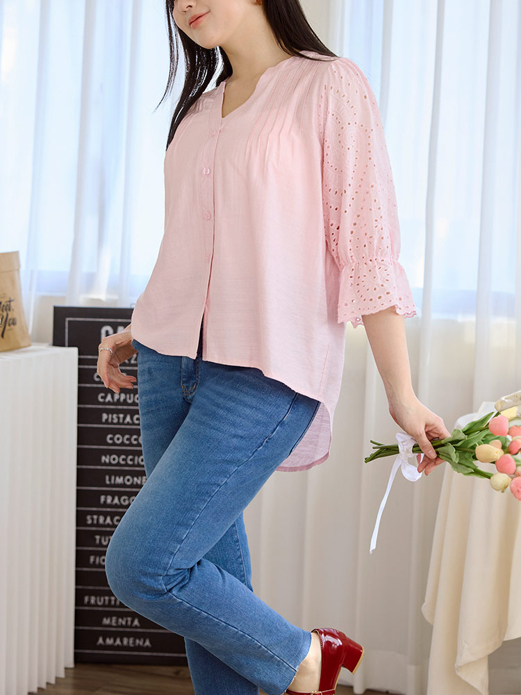 Product Feature: โ Crafted from soft, breathable eyelet fabric โ Flattering V-neck design โ Features stylish puff sleeves to cover the upper arm โ Button-up front โ Elasticated cuffs
