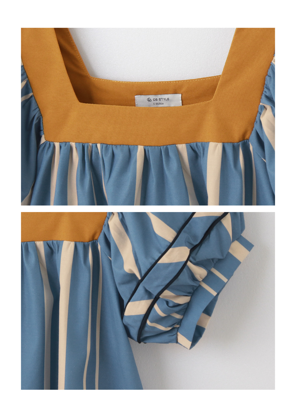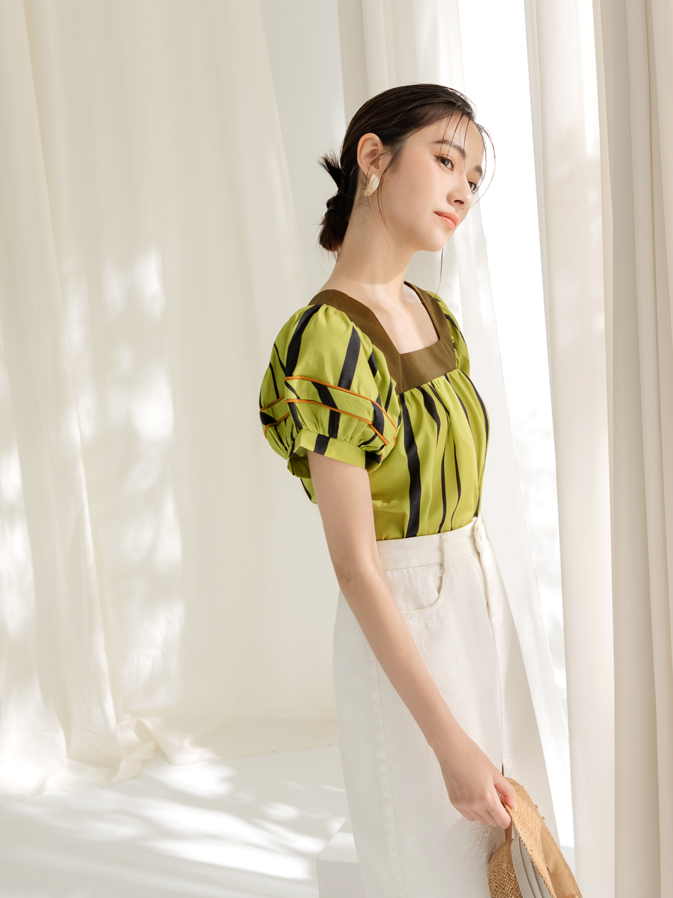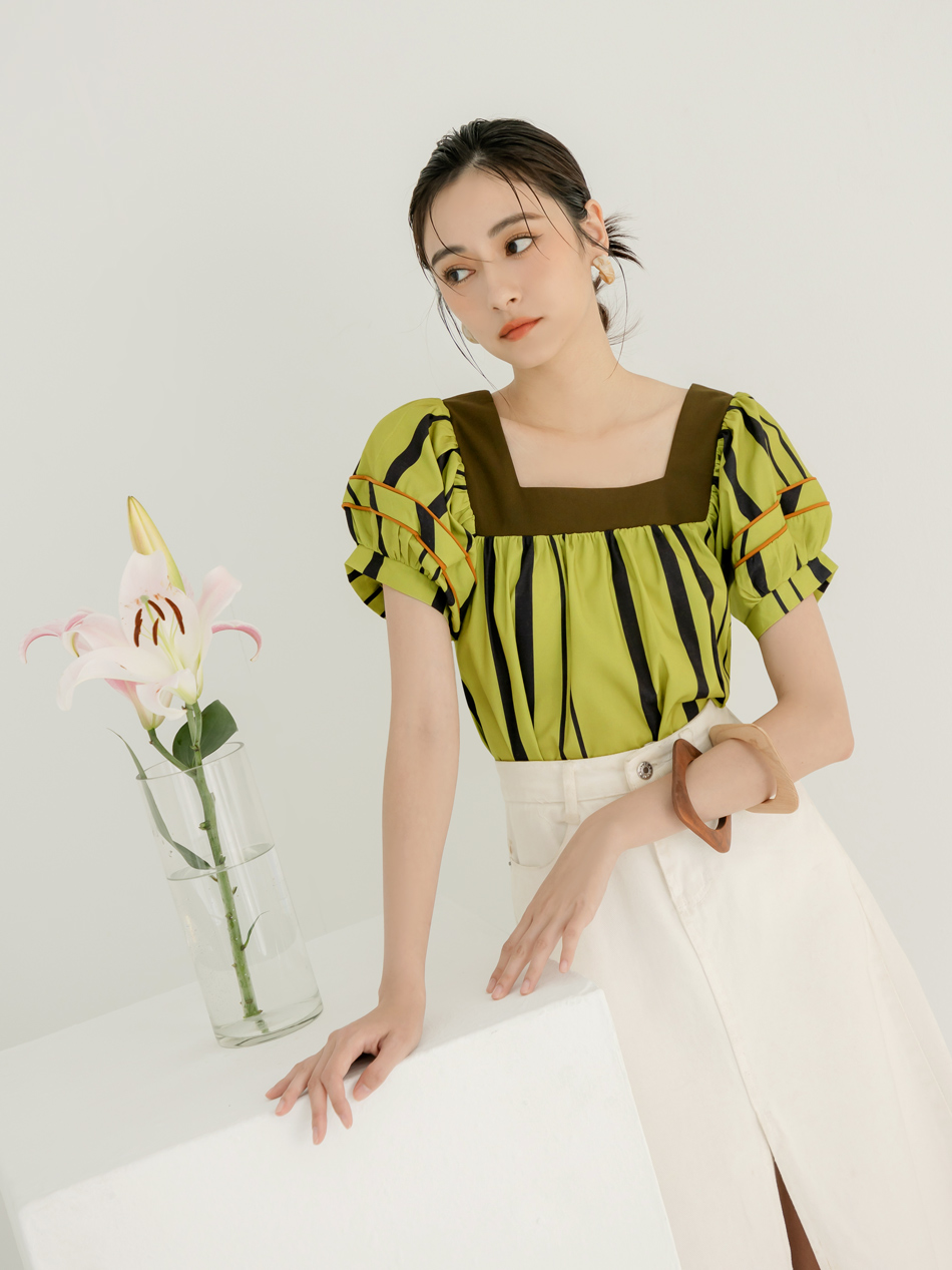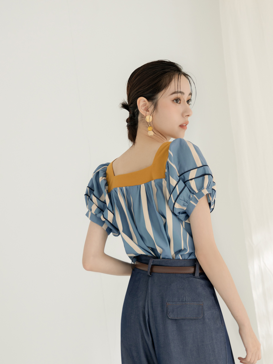 Square Neck Striped Puff Sleeve Top