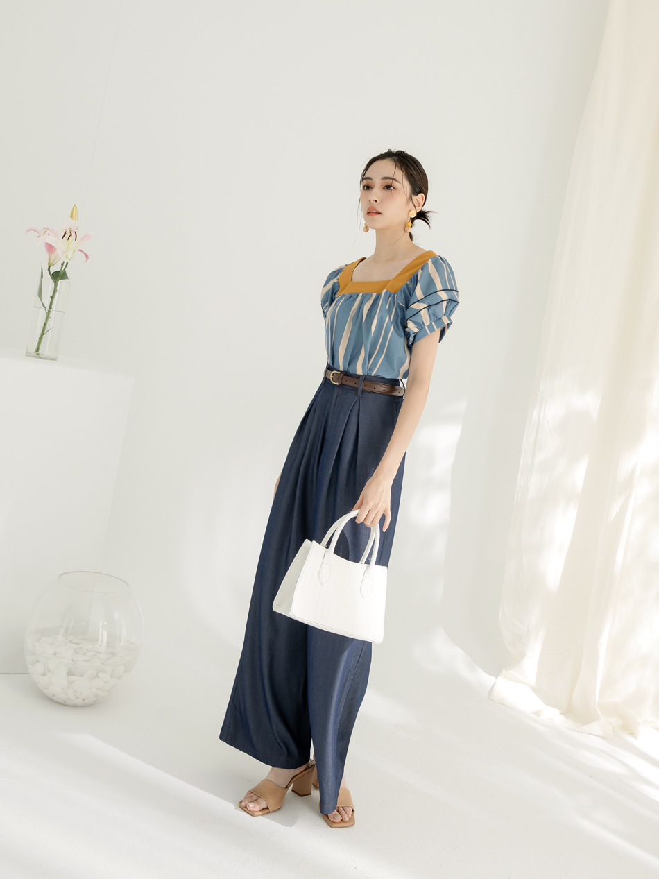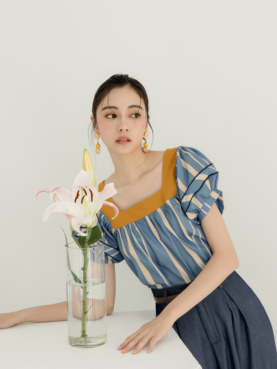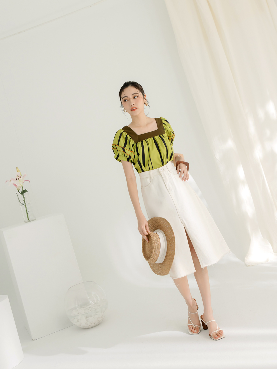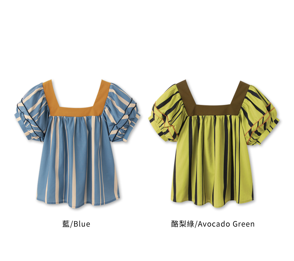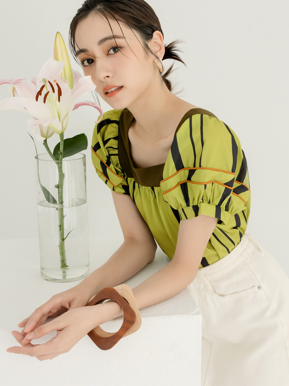 Square Neck Striped Puff Sleeve Top