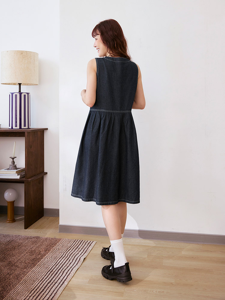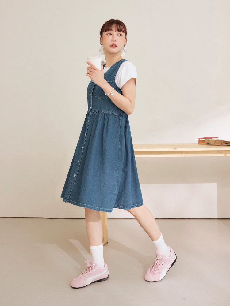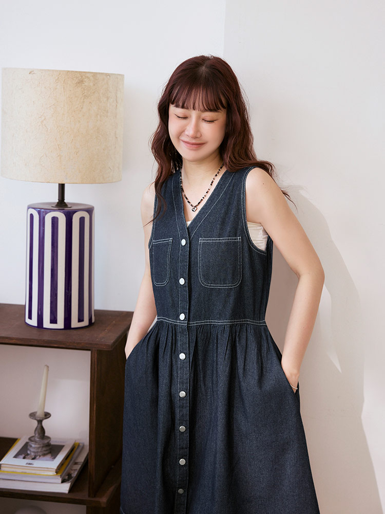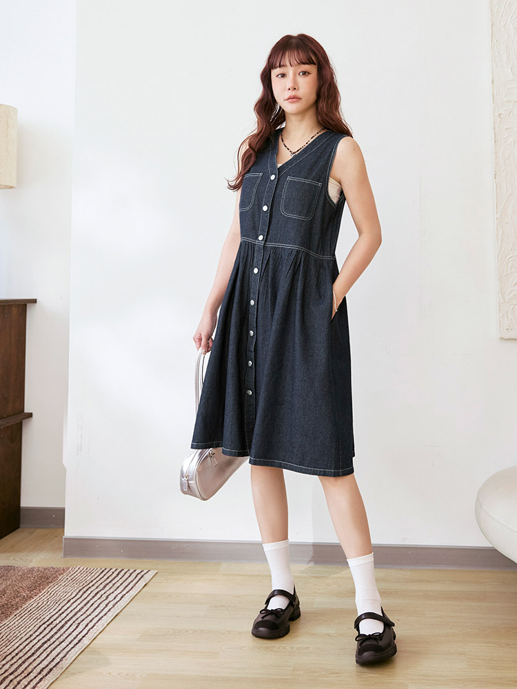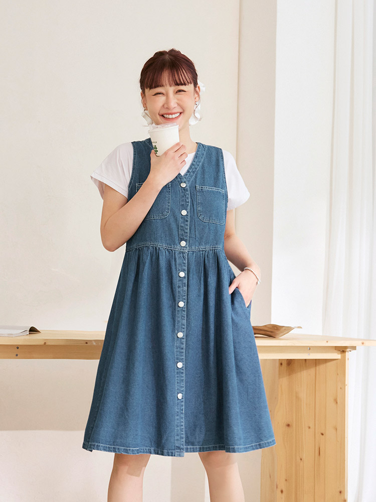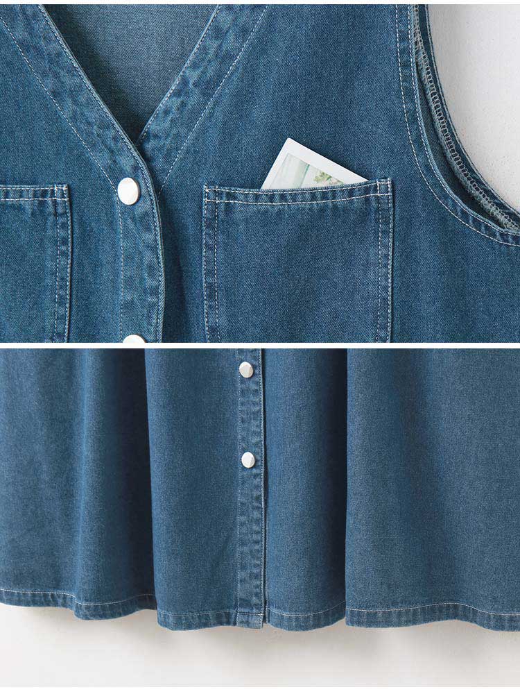 Product Feature: โ Crafted from breathable, pure cotton denim. โ Features a flattering V-neckline. โ Designed with functional pockets. โ Button-down design.