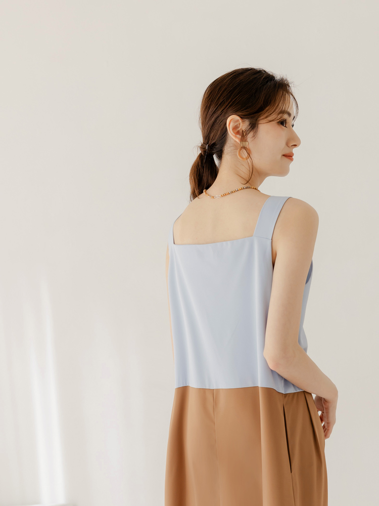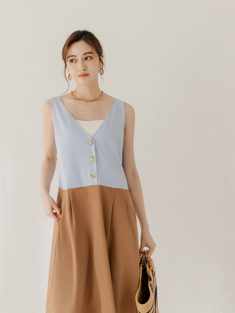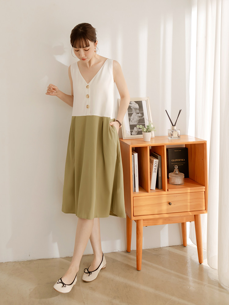 Product Feature: โ Crafted from a smooth, skin-friendly fabric. โ Features a striking colour-block design. โ Flattering V-neckline to enhance your silhouette. โ Includes functional pockets and a full skirt lining.