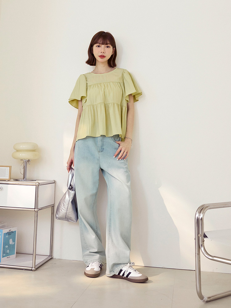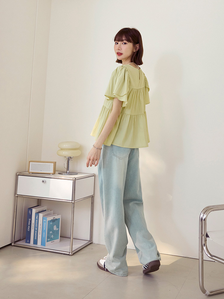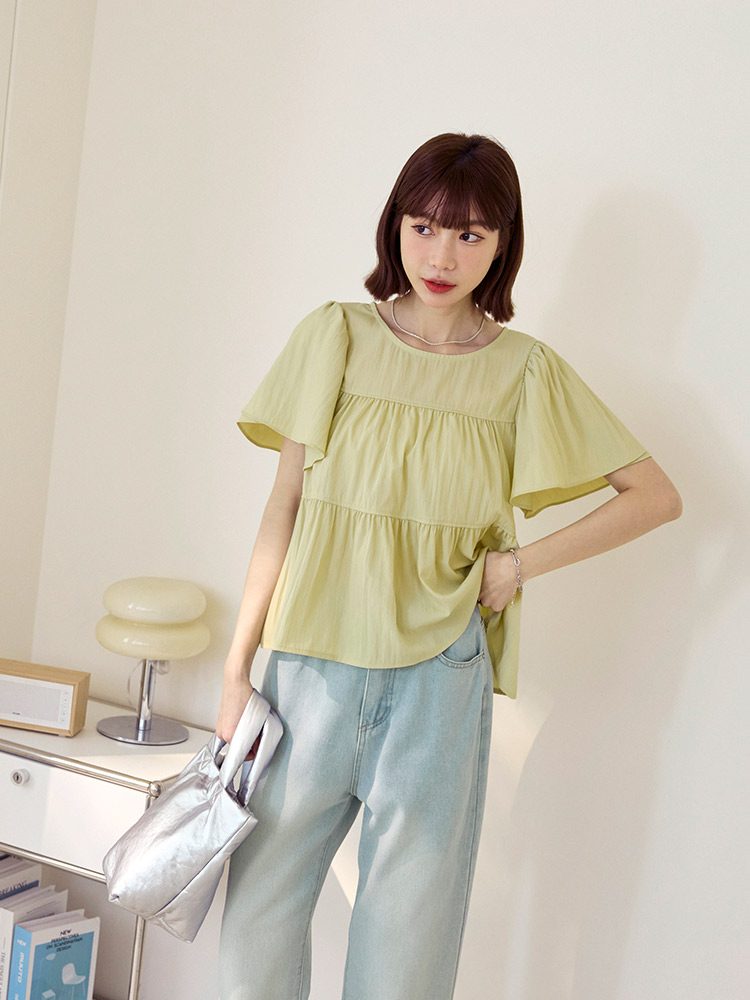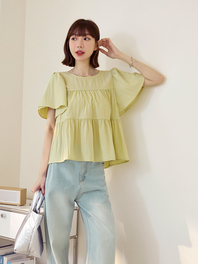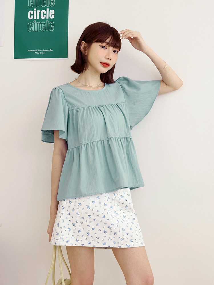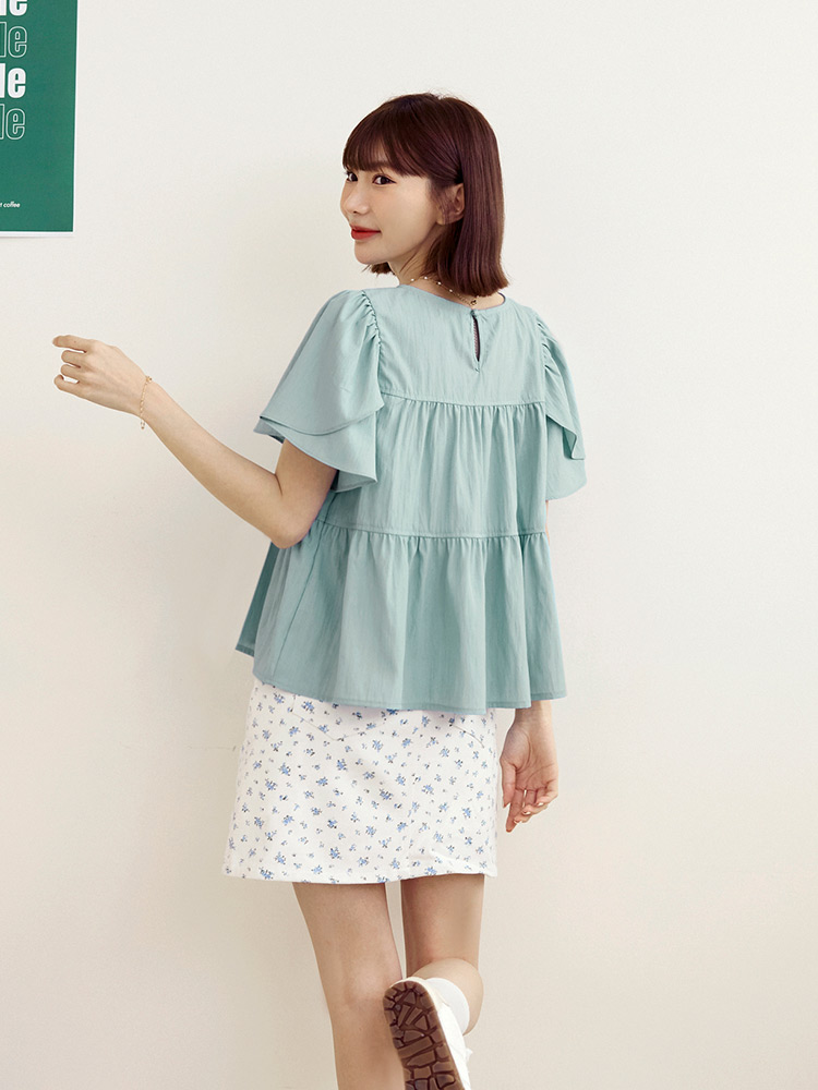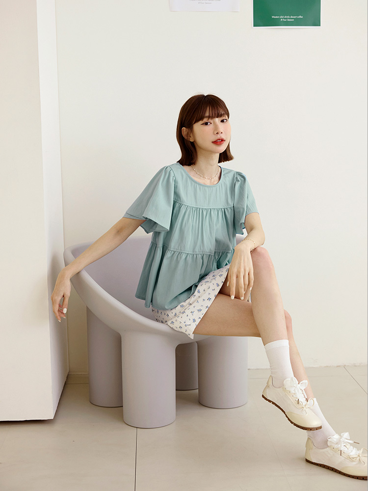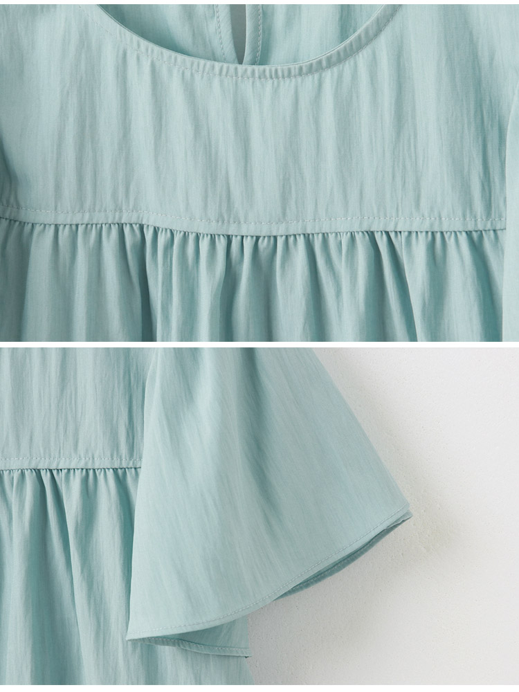 Product Feature: โ Designed with a relaxed, flattering fit โ Features layered ruffle sleeves for arm coverage โ Made from a blend of polyester and cotton