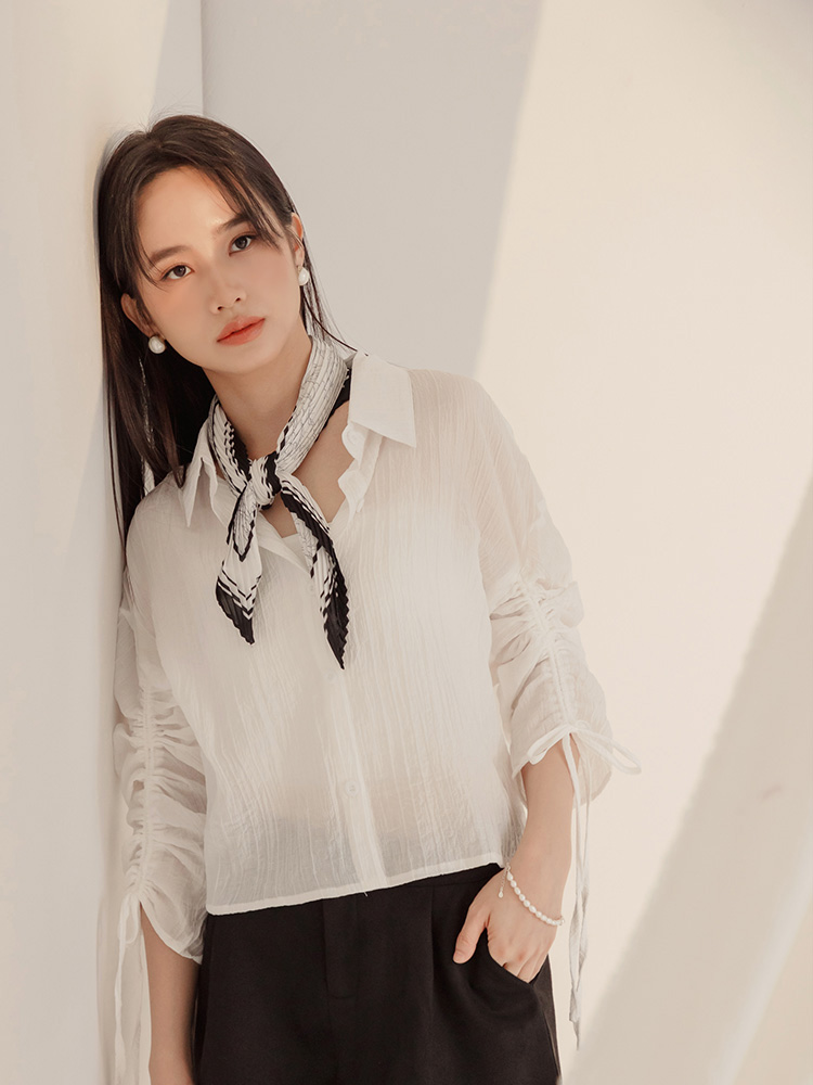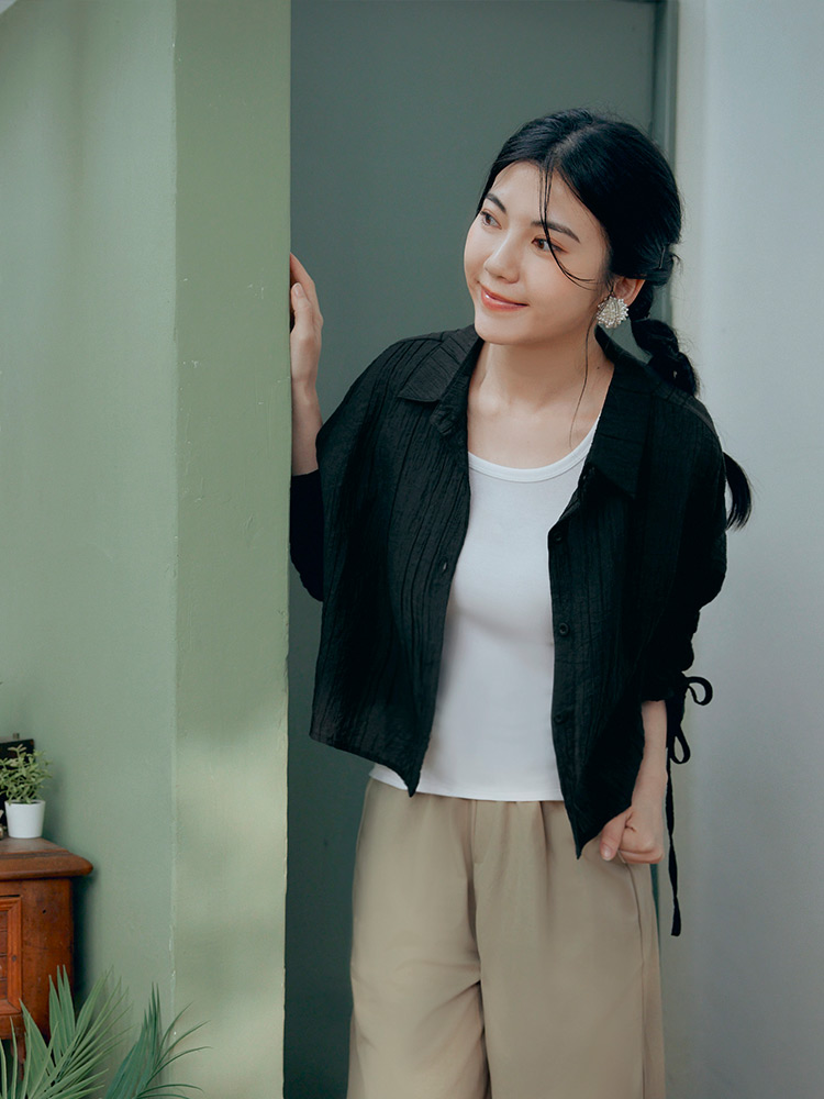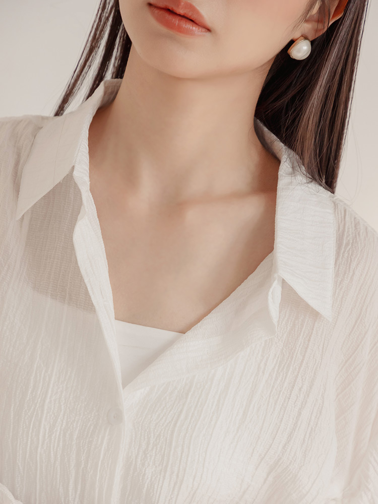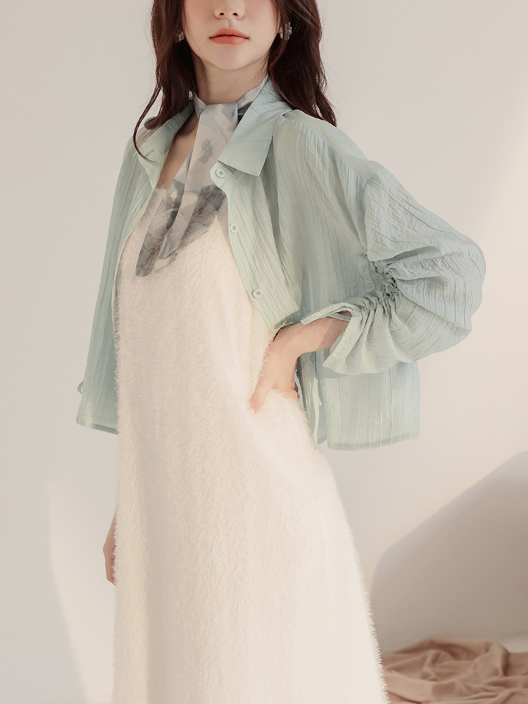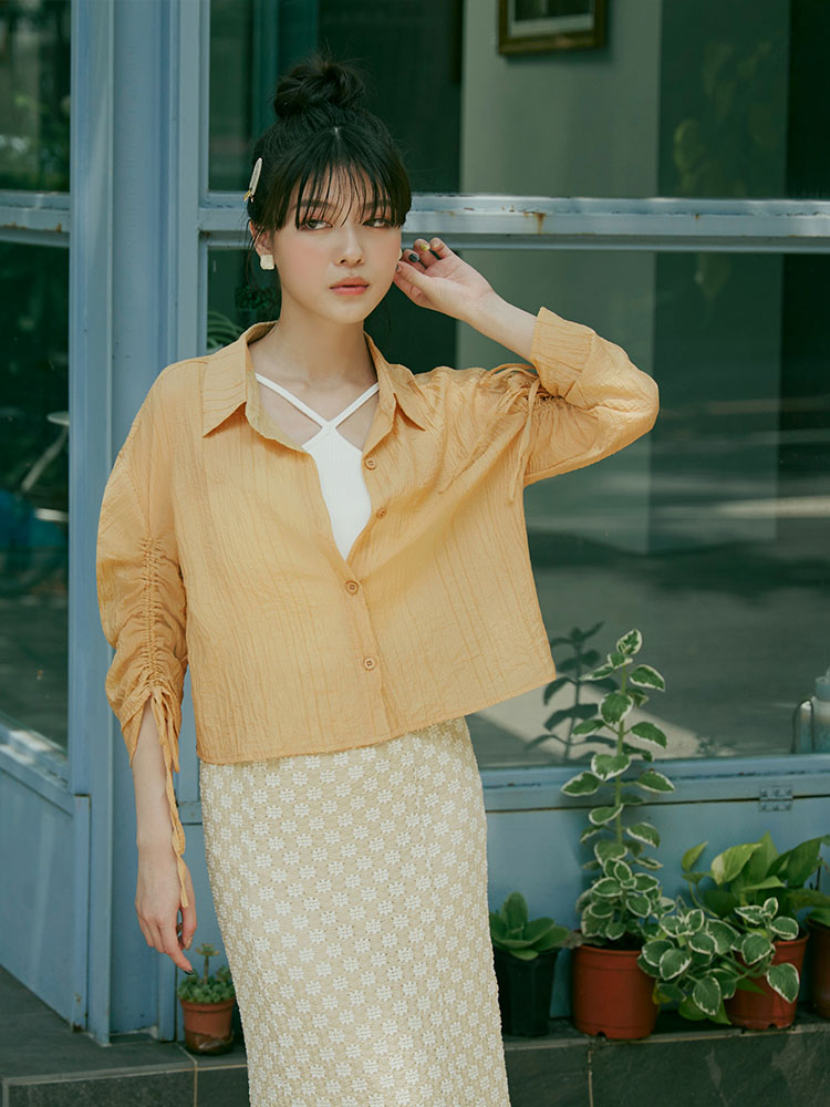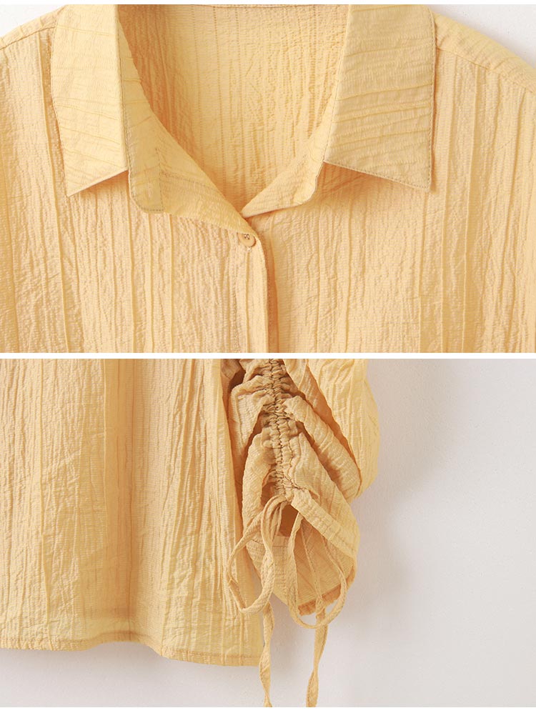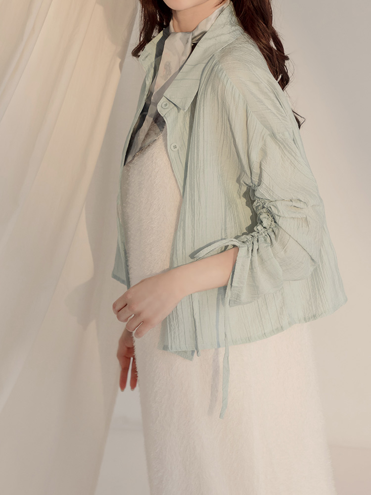 Product Feature: โ Crafted from sheer, textured striped fabric. โ Features adjustable drawstring sleeves for a custom fit. โ Button-up front, can be worn as a top or layering piece.