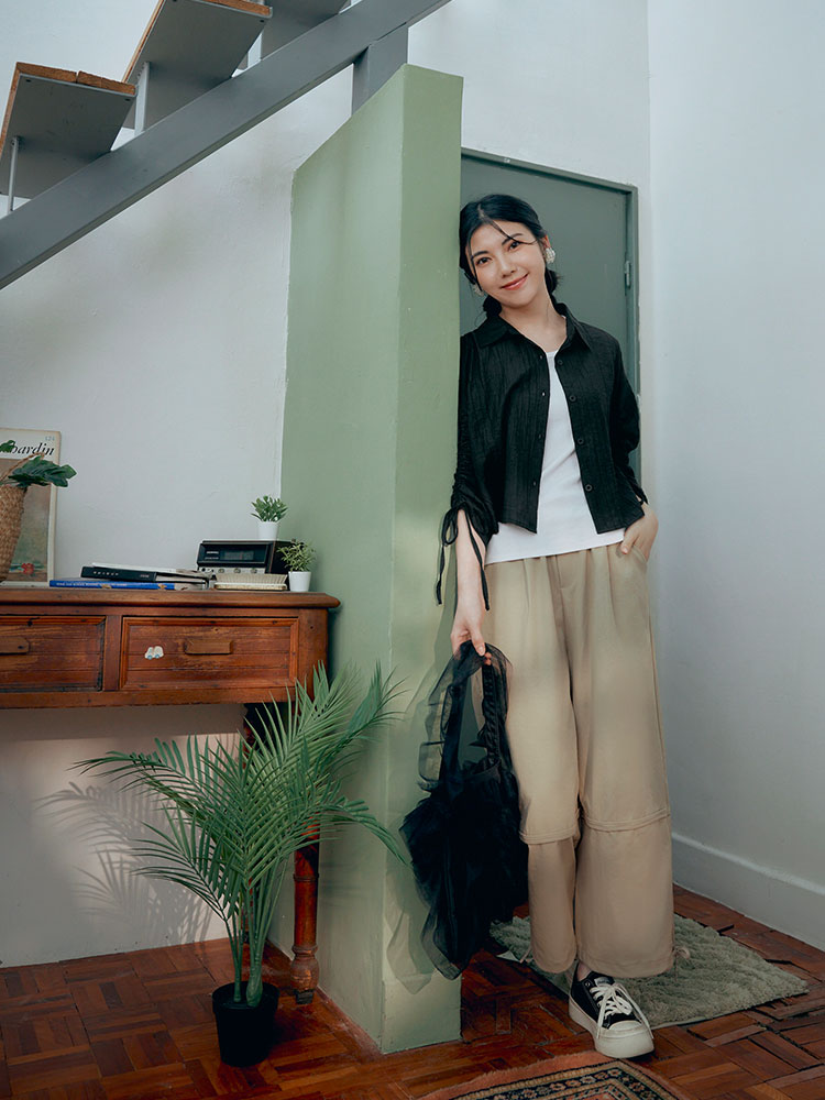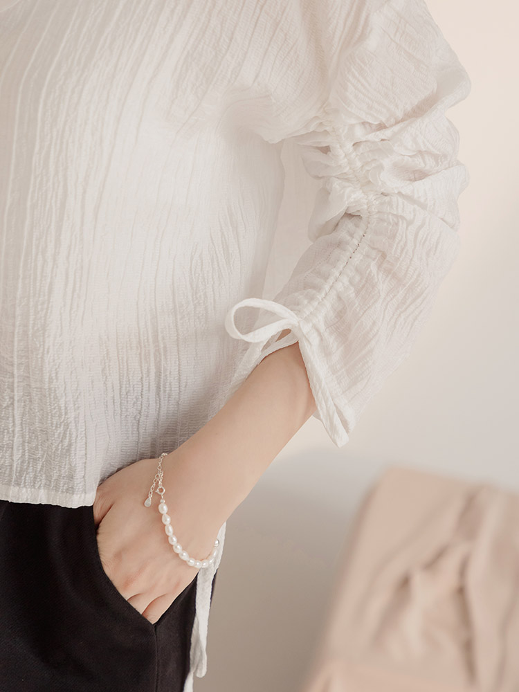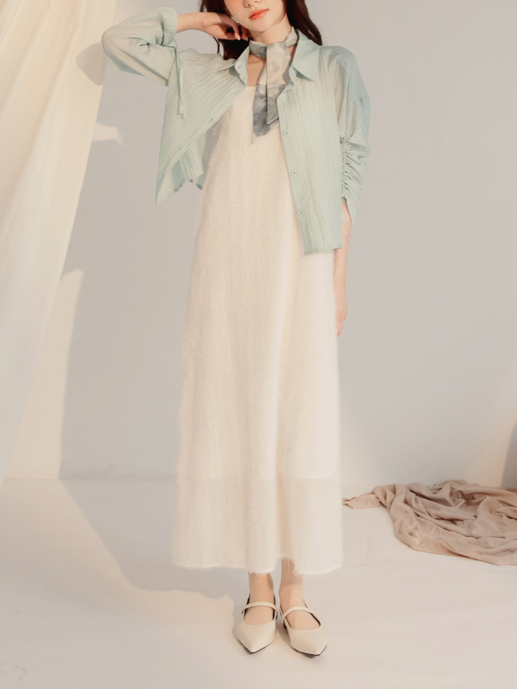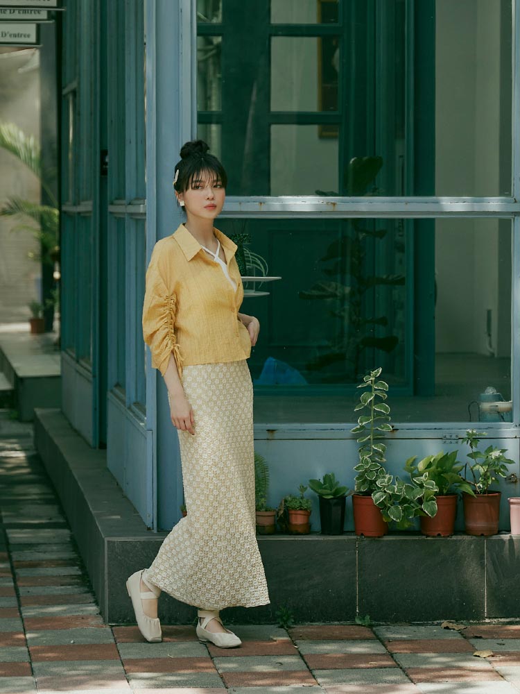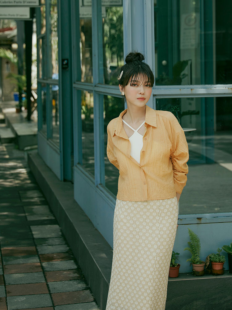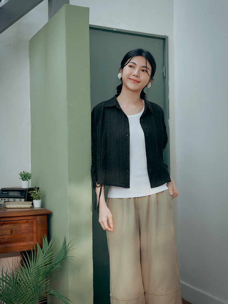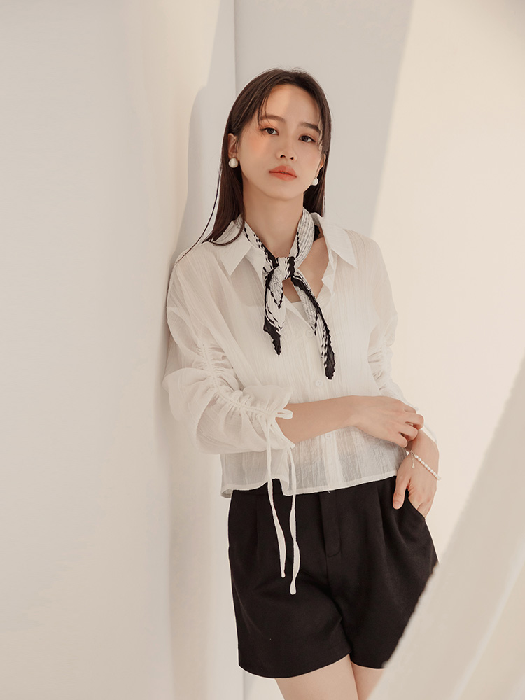 Product Feature: โ Crafted from sheer, textured striped fabric. โ Features adjustable drawstring sleeves for a custom fit. โ Button-up front, can be worn as a top or layering piece.