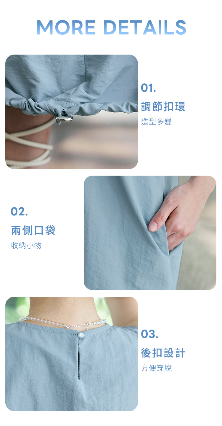 Product Feature: โ Made with cooling, UV-protective ice silk fabric โ Features a flattering, loose fit for all body types โ Adjustable drawstring hem for a custom fit โ Includes side pockets for added convenience