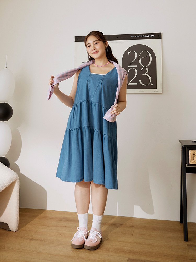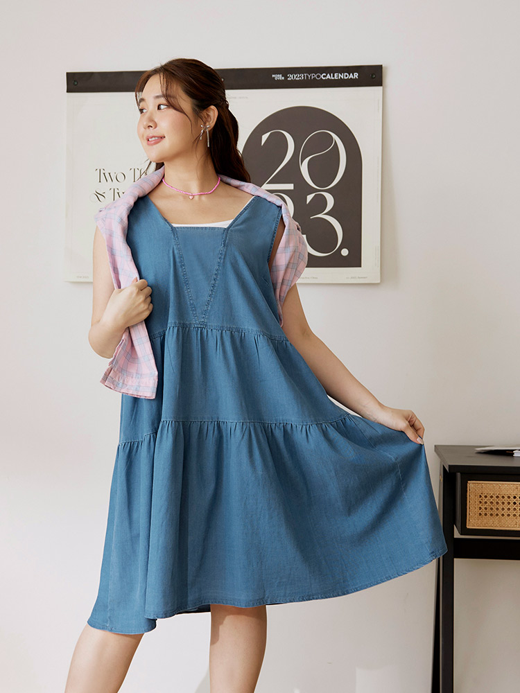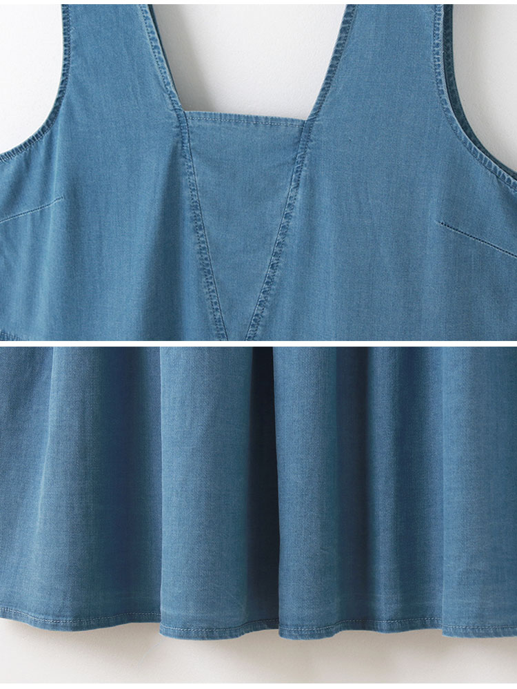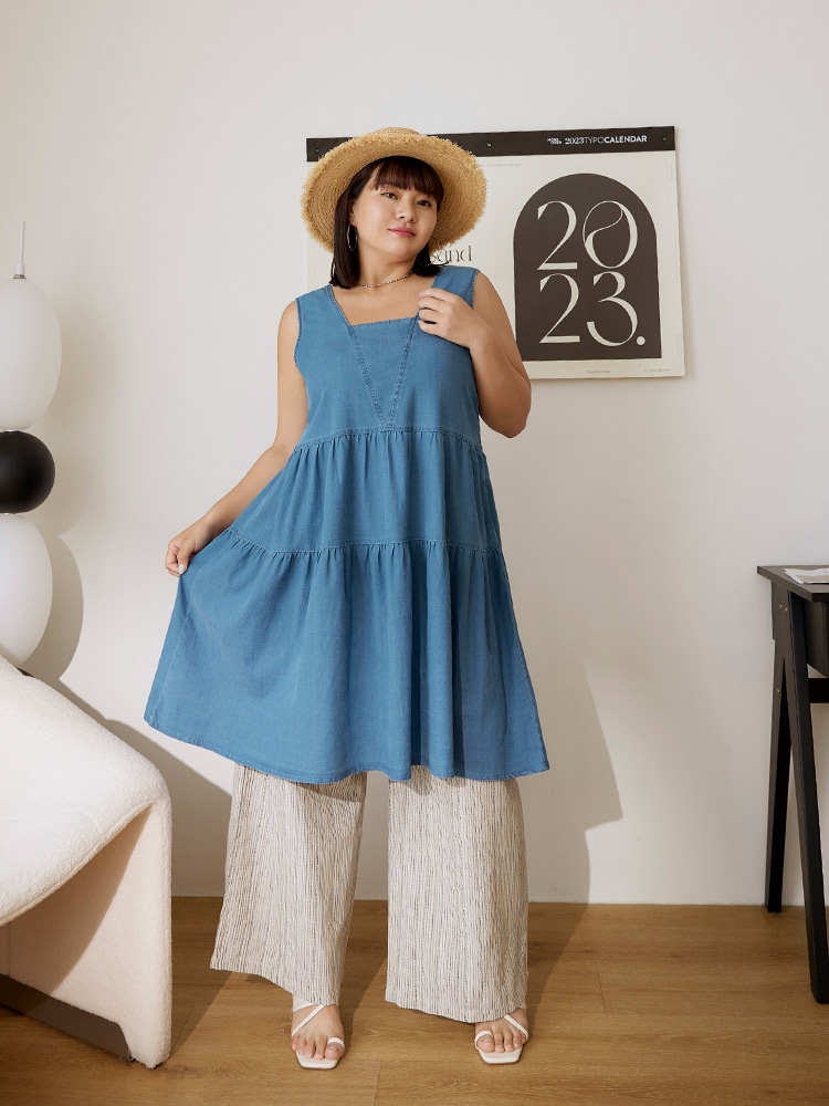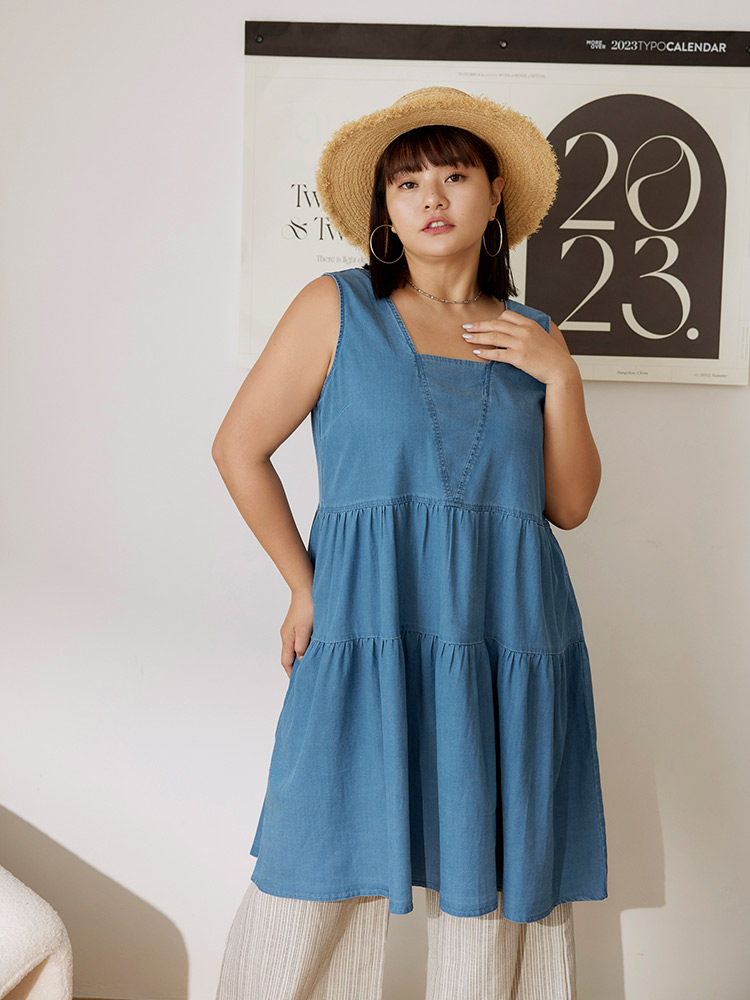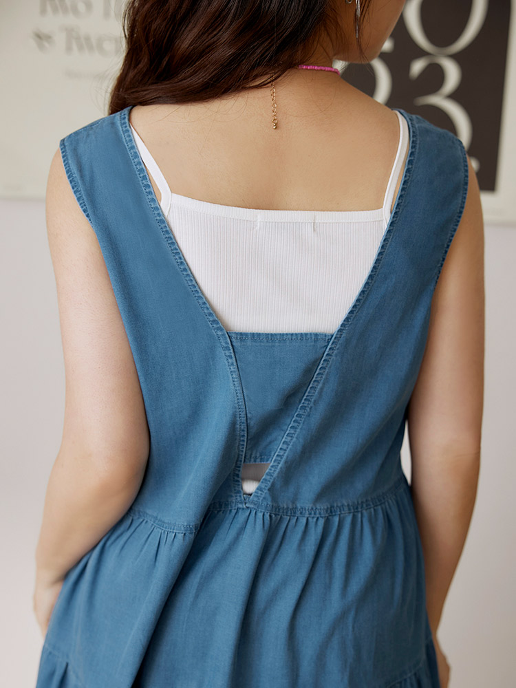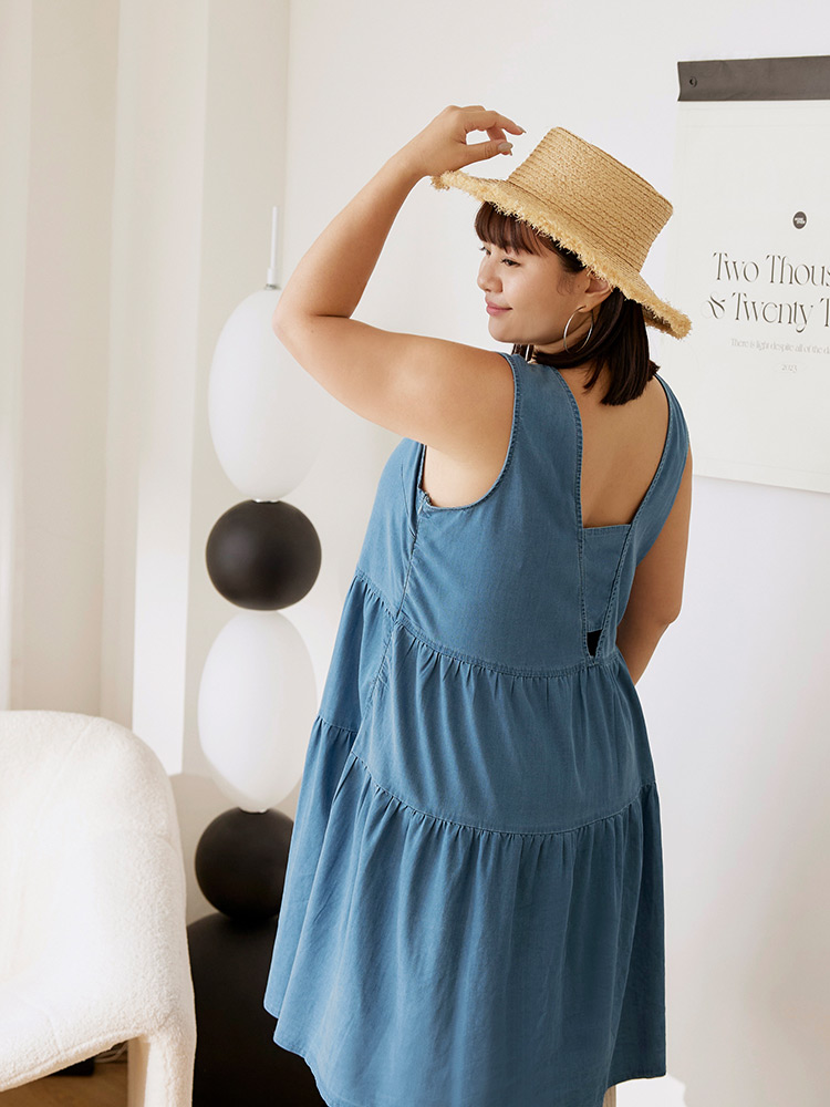 Product Feature: โ Designed with a flattering A-line silhouette. โ Features a square neckline and open back design. โ Wide shoulder straps for added support. โ Crafted from a blend of lyocell, polyester and elastane with slight stretch.