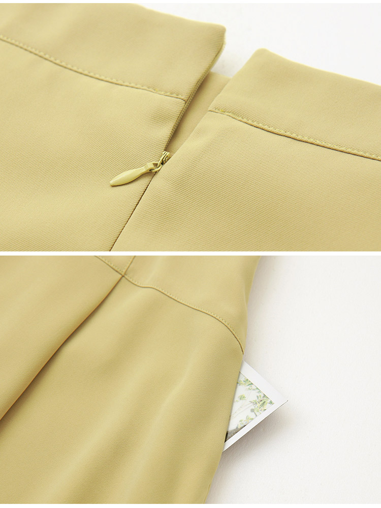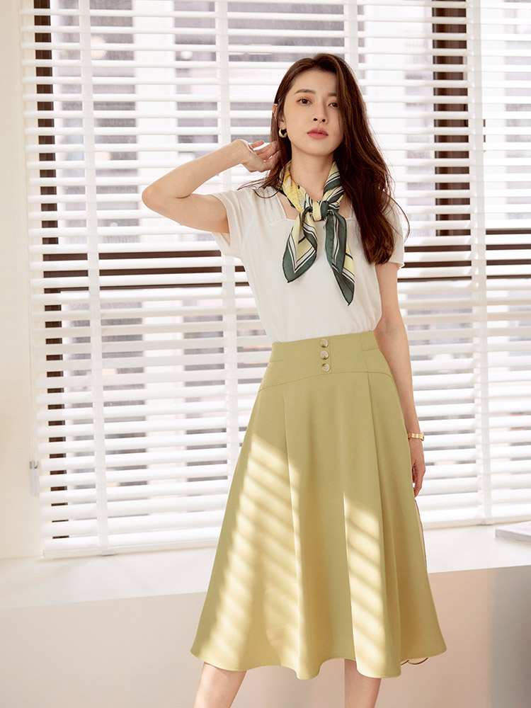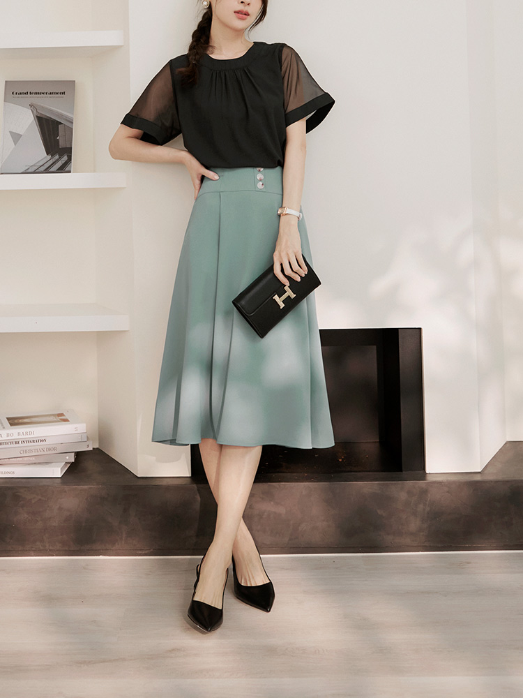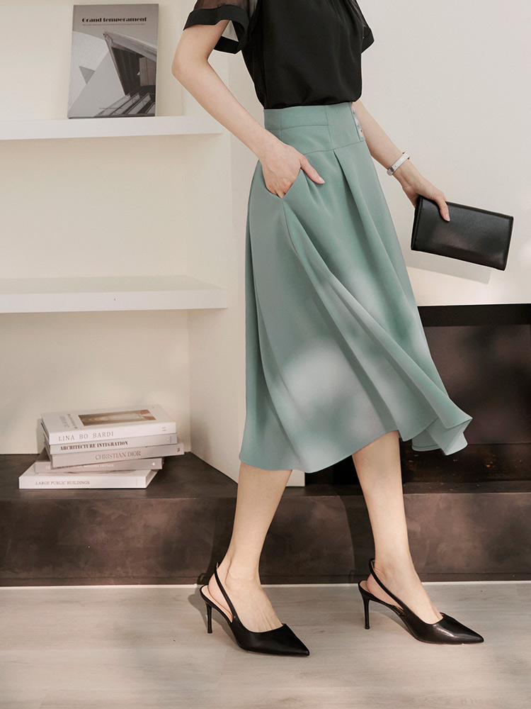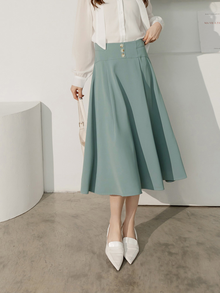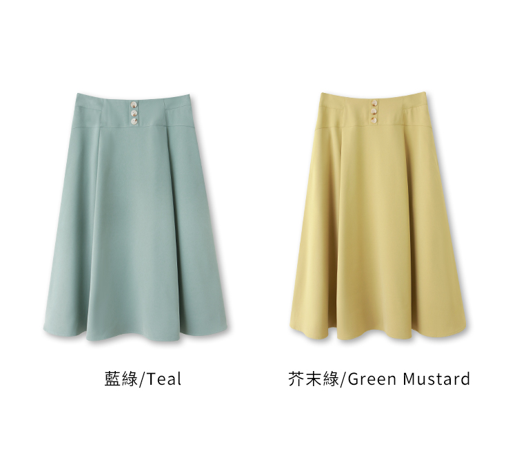 Product Feature: โ Features a flattering pleated design. โ Designed with a flowing, flared hem. โ Decorative button detailing for added style. โ Made from a stretchy blend for comfort.