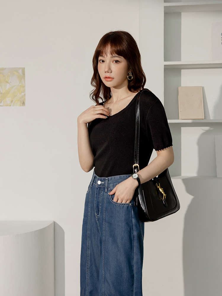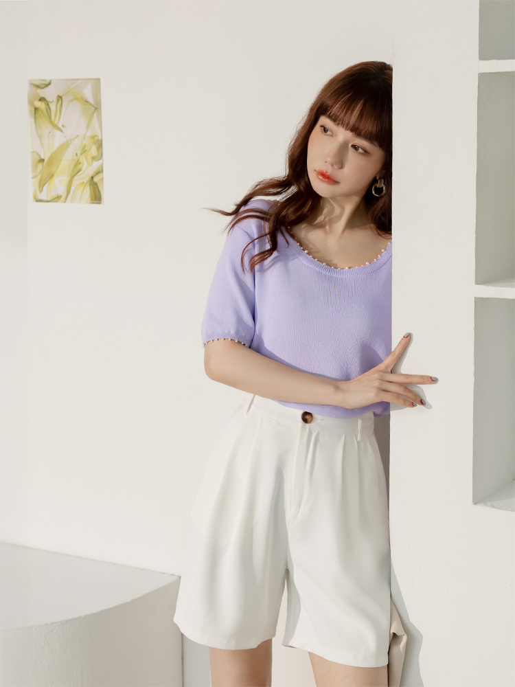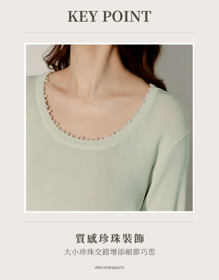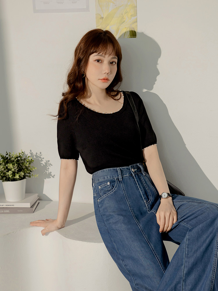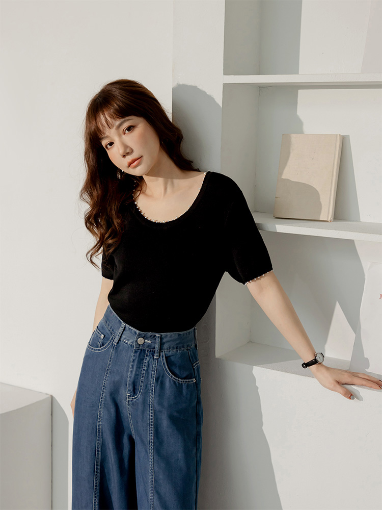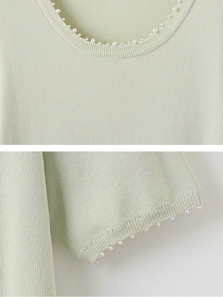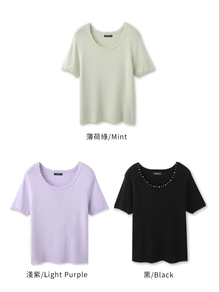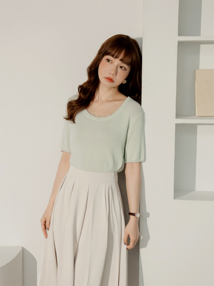 Product Feature: โ Crafted from soft, skin-friendly knit fabric. โ Features an eye-catching design with pearl embellishments. โ Simple solid colour for easy matching.