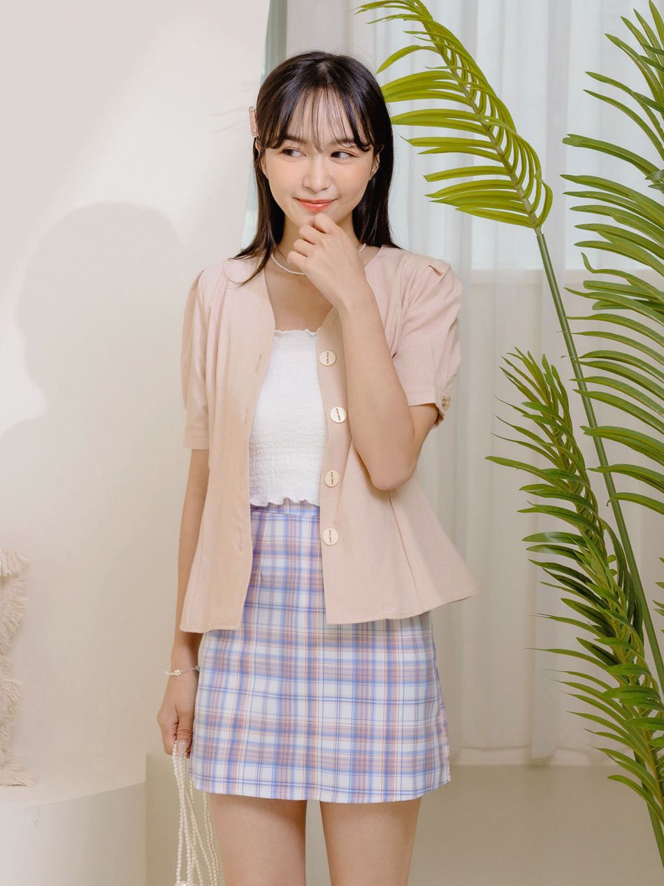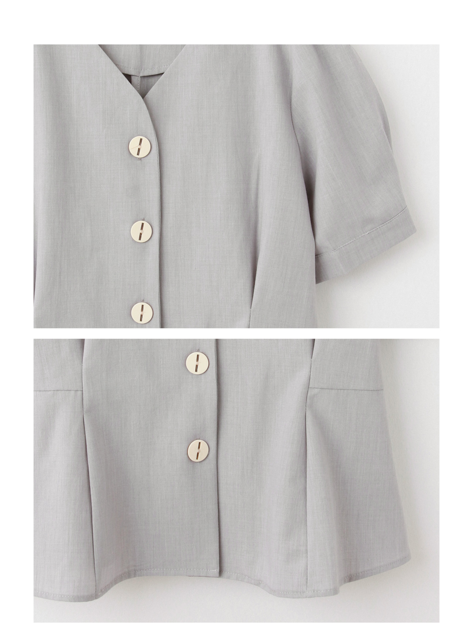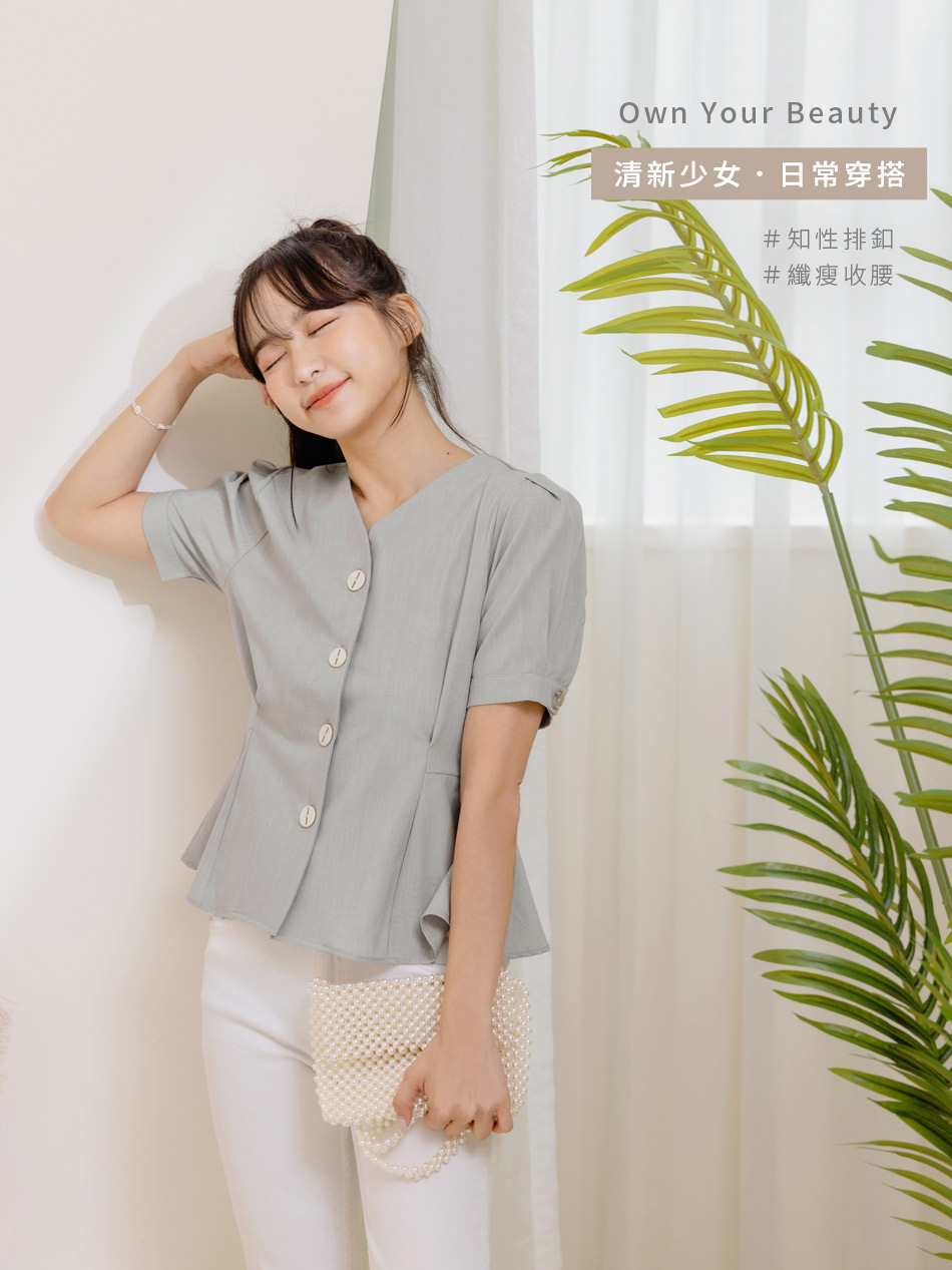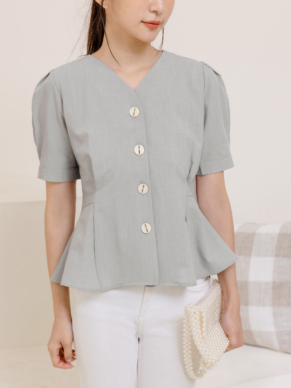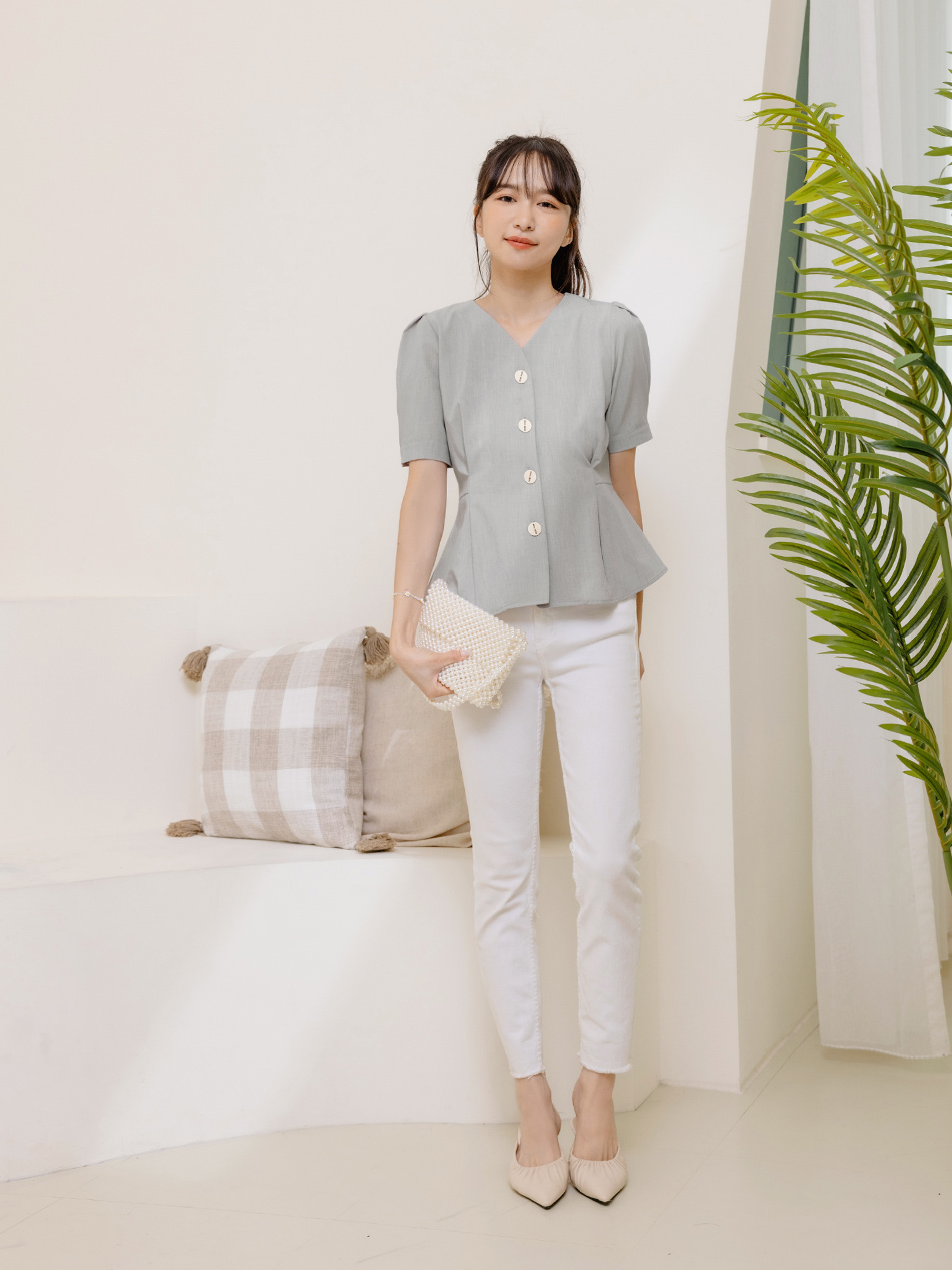 Product Feature: โ Features a flattering V-neckline to elongate the face โ Delicate textured weave adds a touch of elegance โ Designed with a waist-defining cut for a feminine silhouette โ Front and sleeve buttons for versatile styling