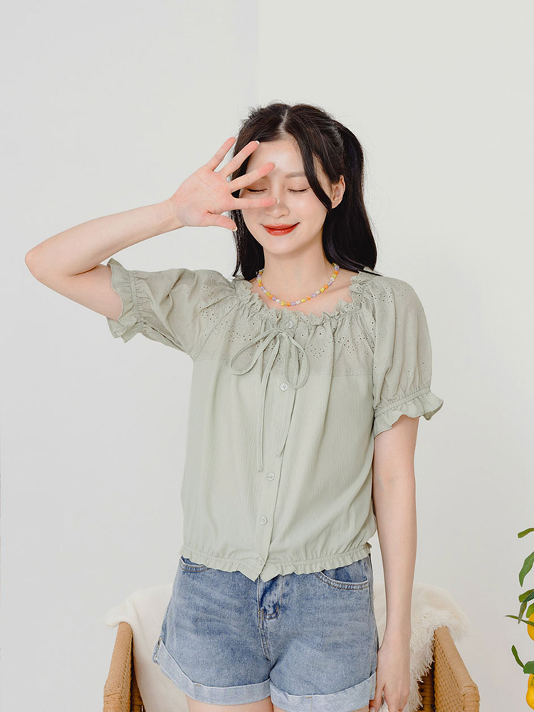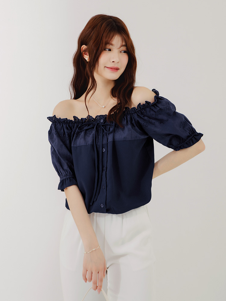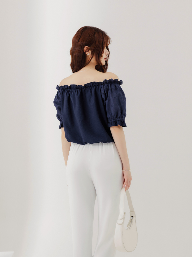 Product Feature: โ Versatile 2-way design: wear as off-shoulder or round neck โ Adjustable neckline and waist for a comfortable fit โ Delicate lace texture adds a touch of elegance โ Feminine ruffled hem detail