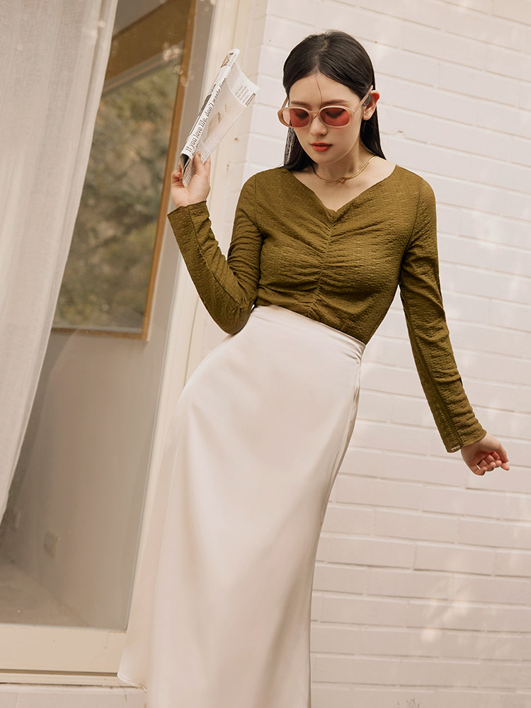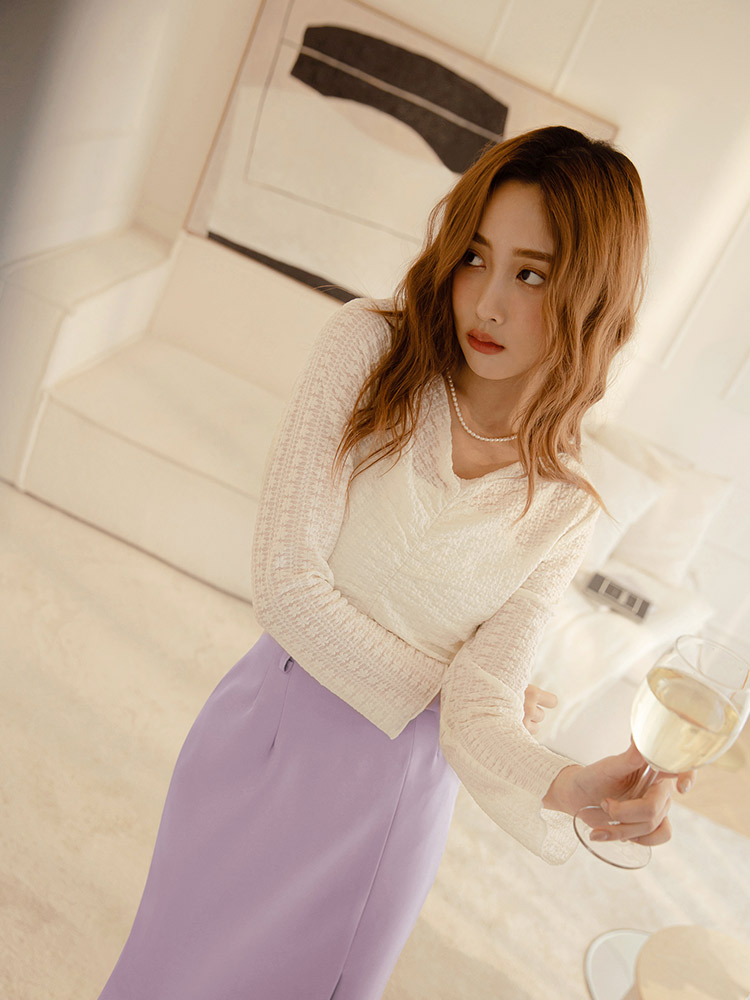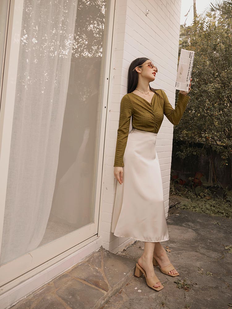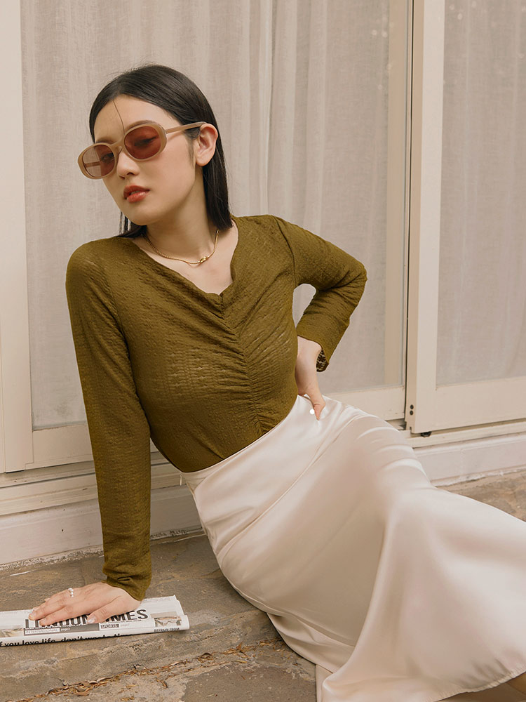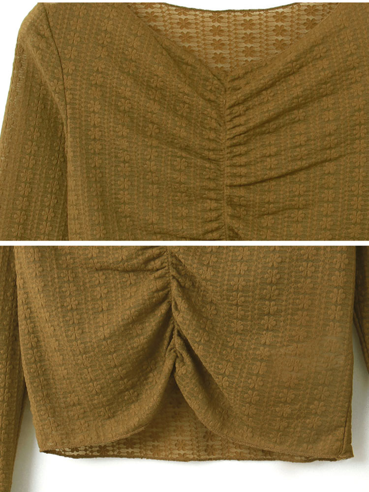 Product Feature: โ Delicate sheer lace for a touch of elegance โ Flattering V-neck design โ Features a stylish ruched front โ Cropped length to elongate your legs