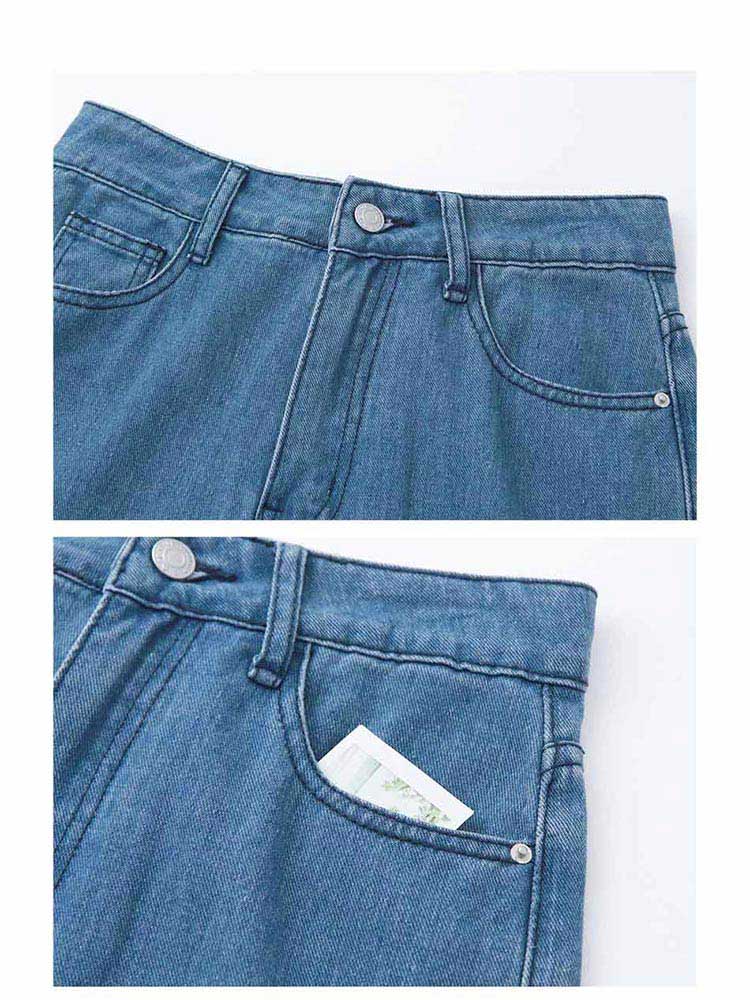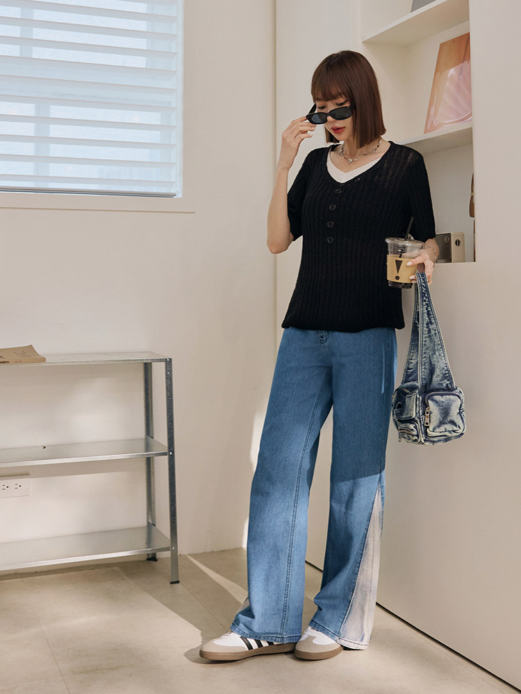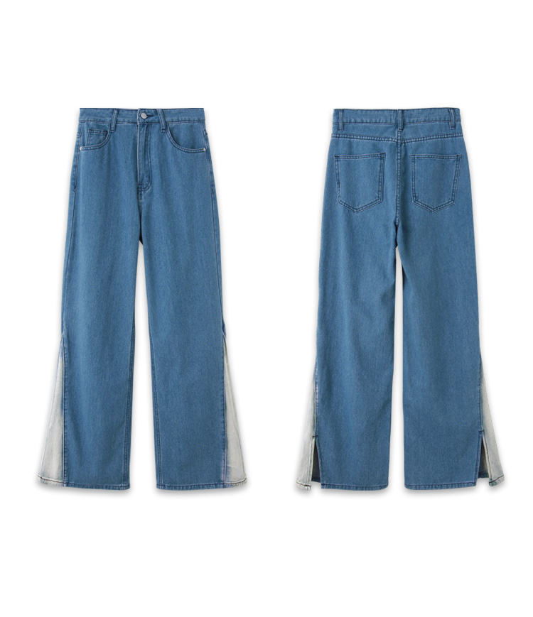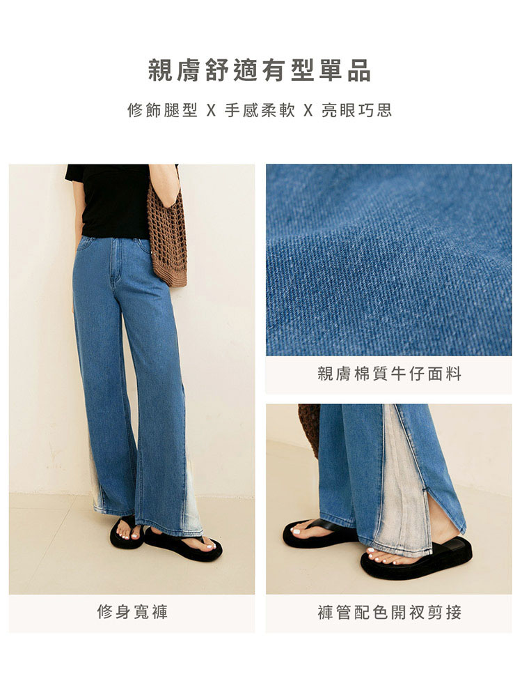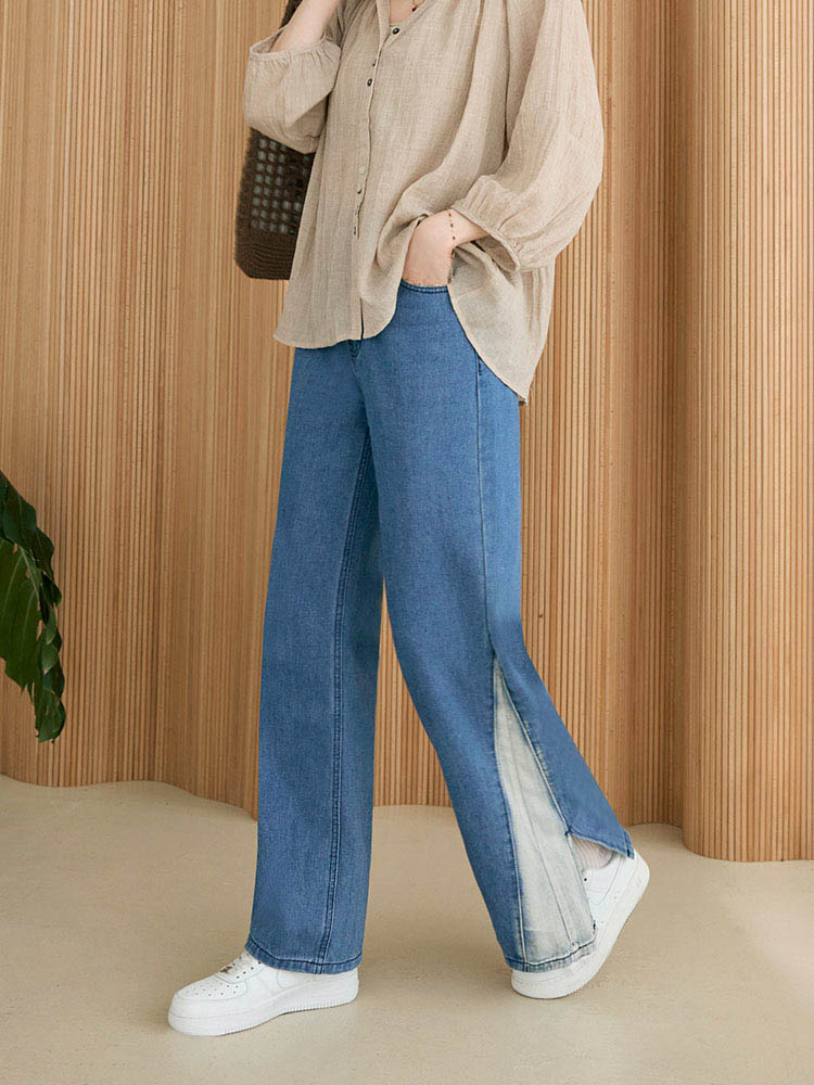 Product Feature: โ Crafted from soft, skin-friendly cotton denim โ Features a stylish colour-block and split-hem design โ Comfortable wide-leg fit for a flattering silhouette โ Functional front and back pockets with a button and zip closure
