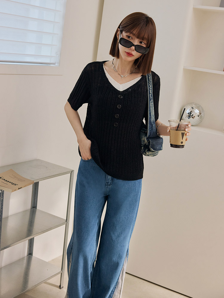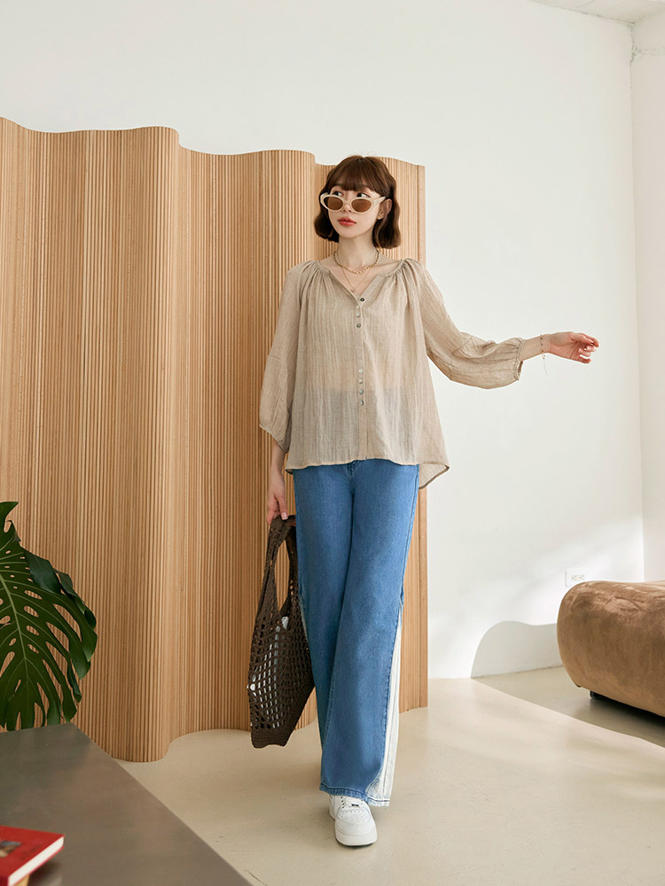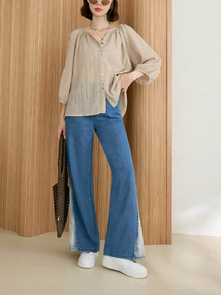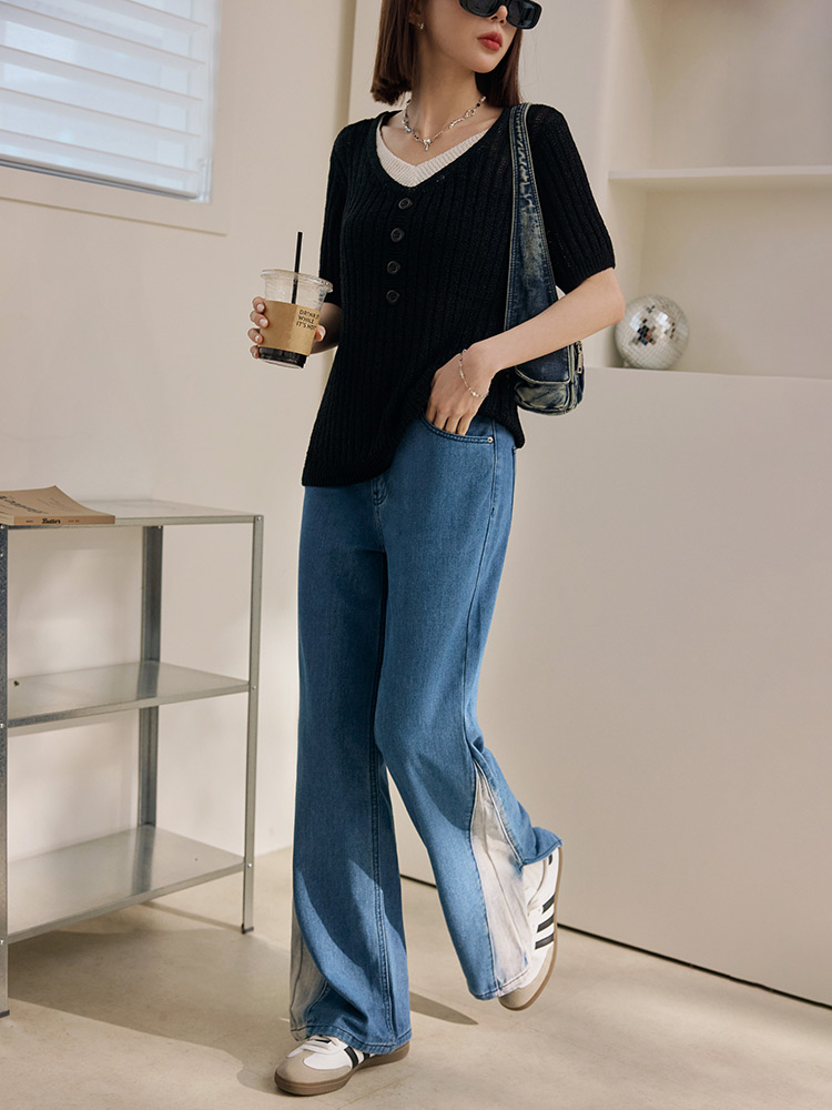 Product Feature: โ Crafted from soft, skin-friendly cotton denim โ Features a stylish colour-block and split-hem design โ Comfortable wide-leg fit for a flattering silhouette โ Functional front and back pockets with a button and zip closure