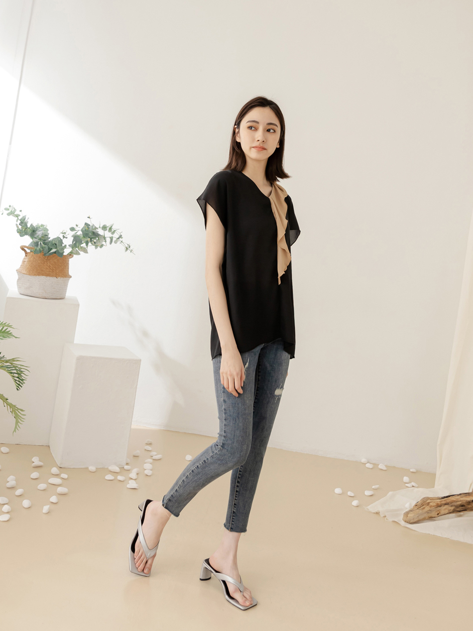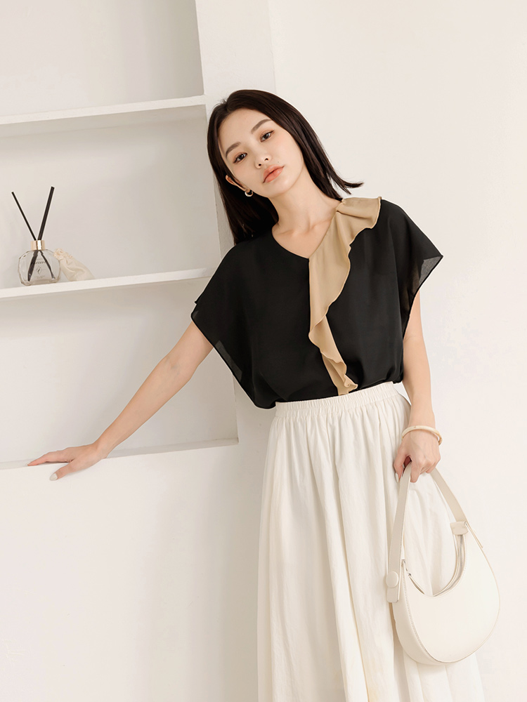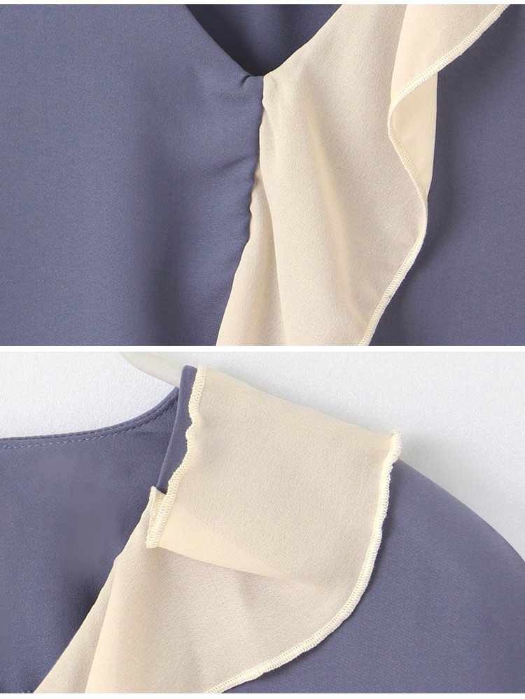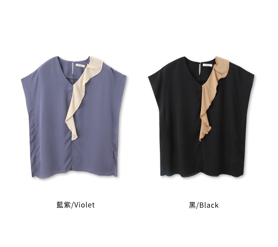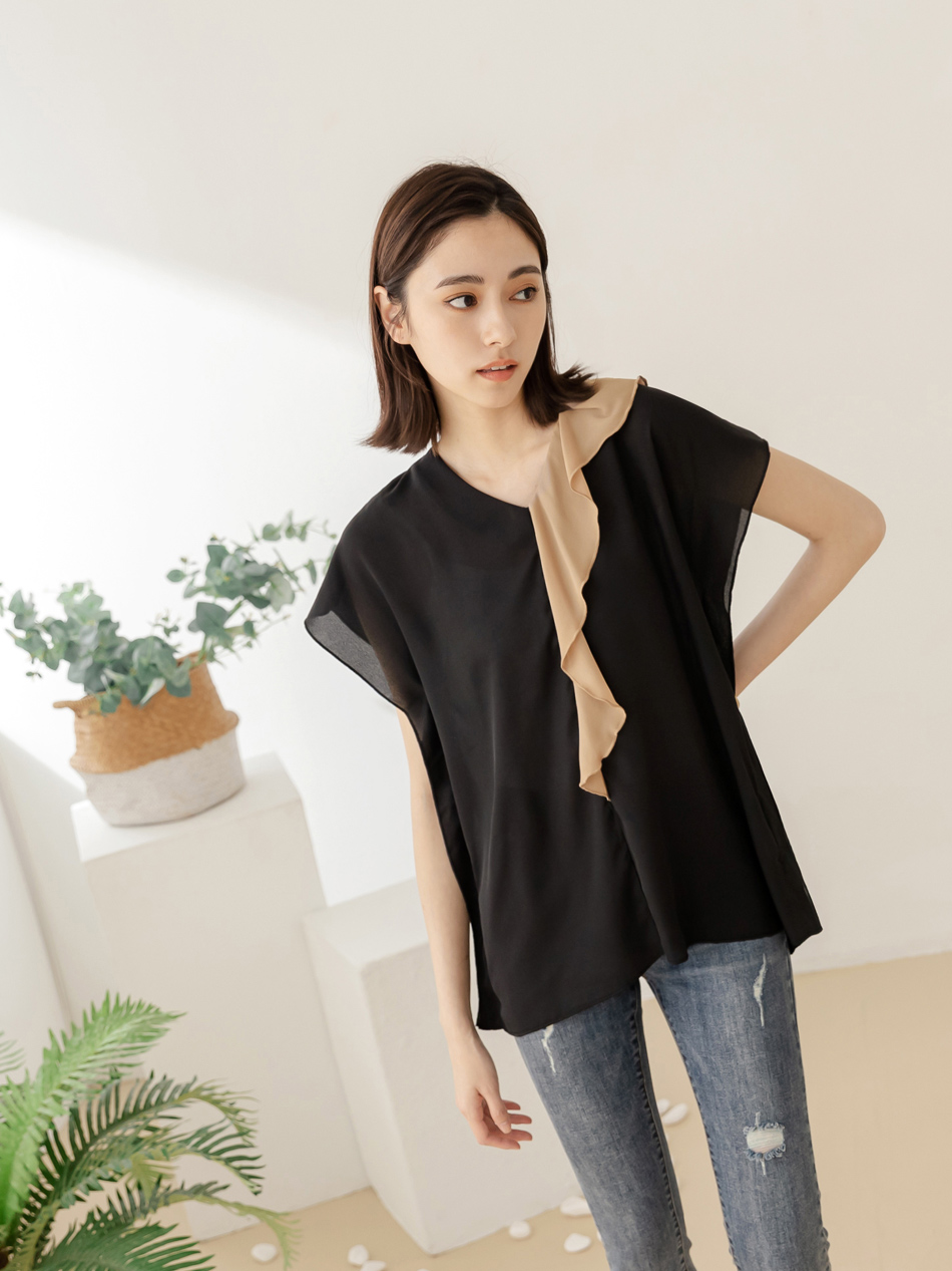 Product Feature: โ Crafted from smooth, skin-friendly fabric โ Flattering V-neck design to lengthen the neckline โ Features a stylish colour-block ruffle trim โ Relaxed fit suitable for all body types