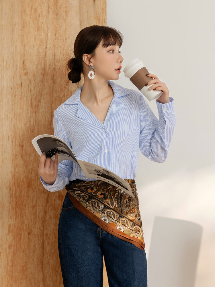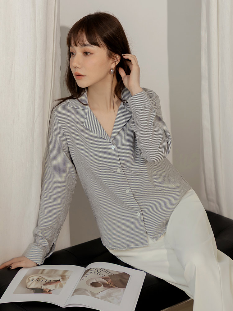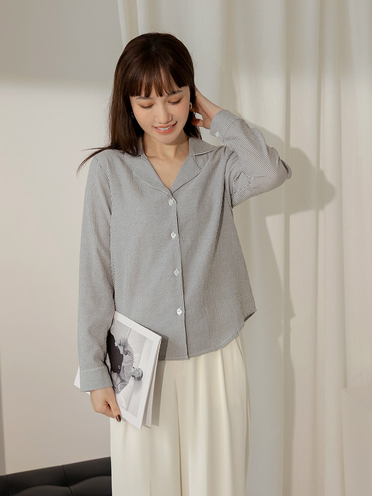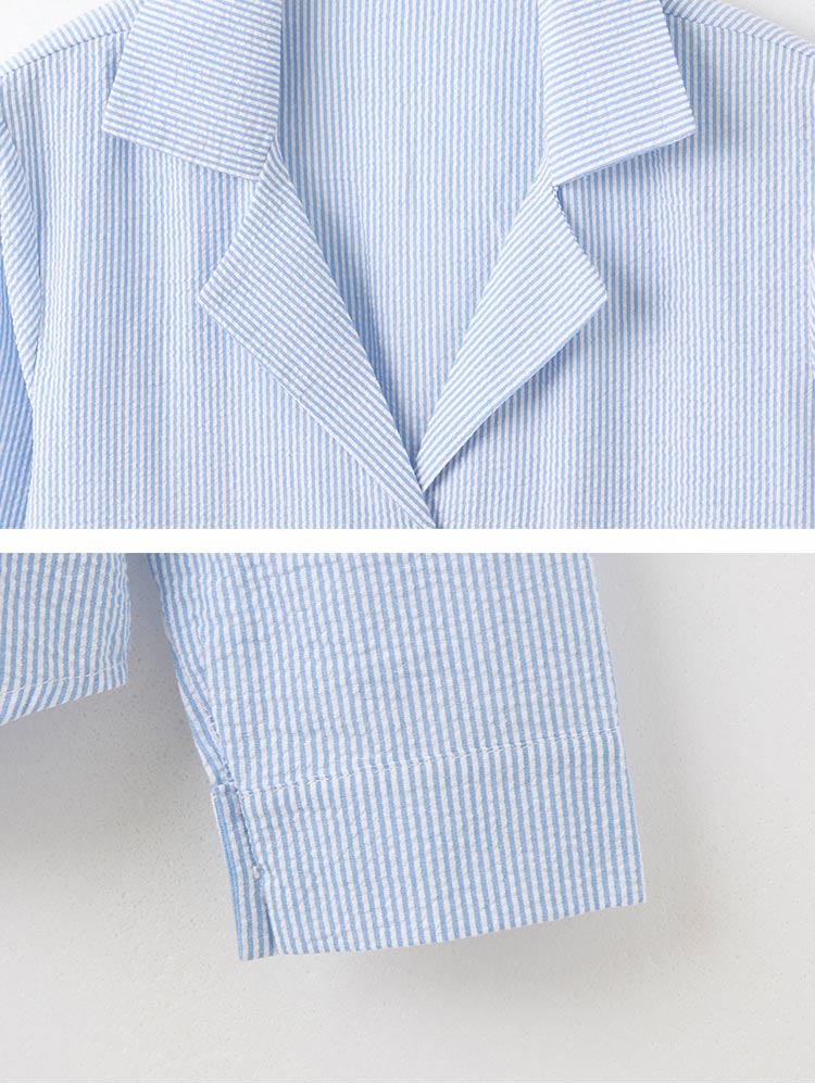 Product Feature: โ Features a sophisticated striped print. โ Classic notched lapel design. โ Button-up front and cuffs. โ Versatile design, suitable as a top or layering piece.
