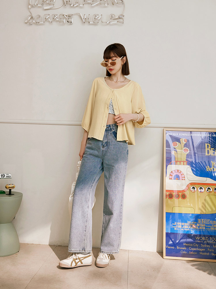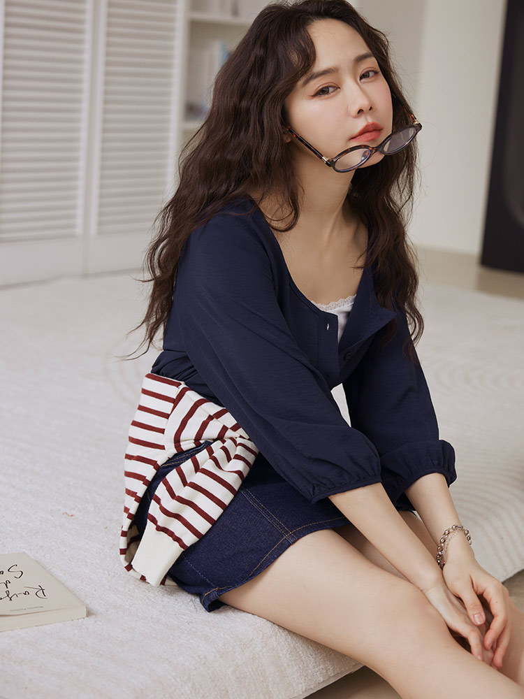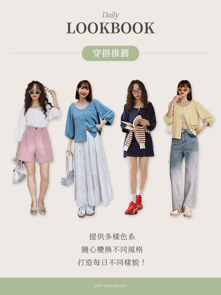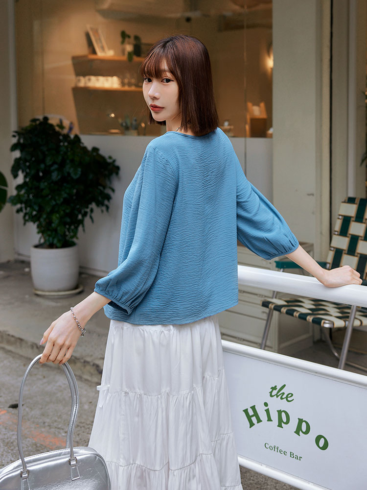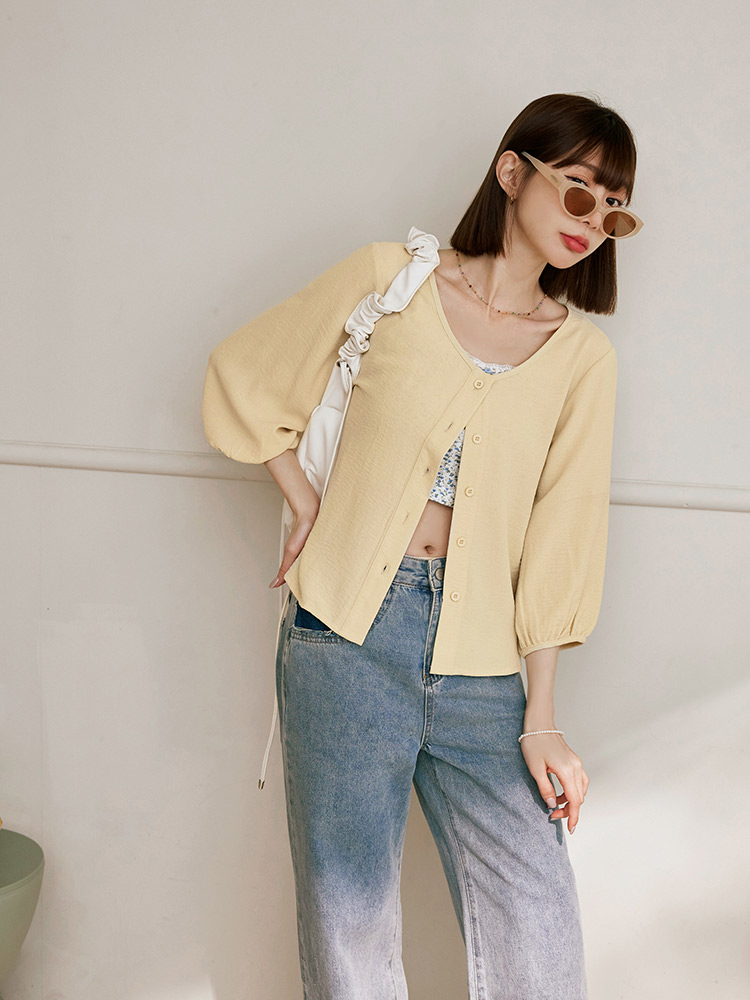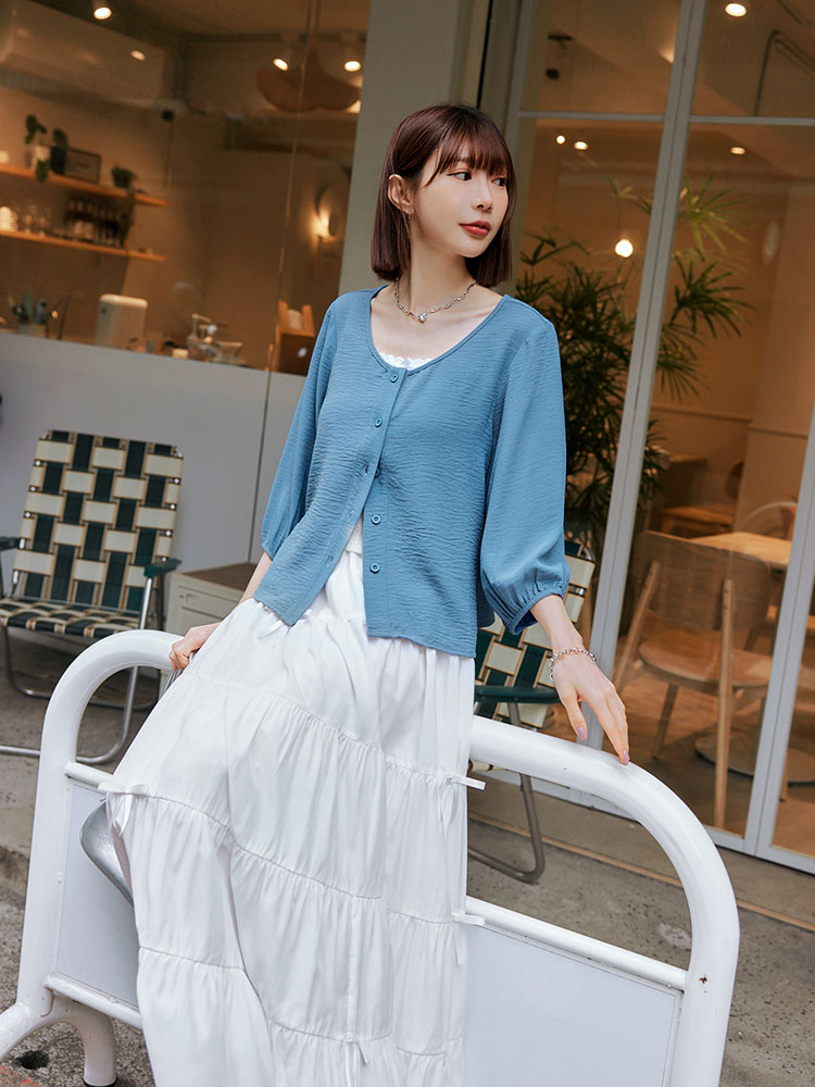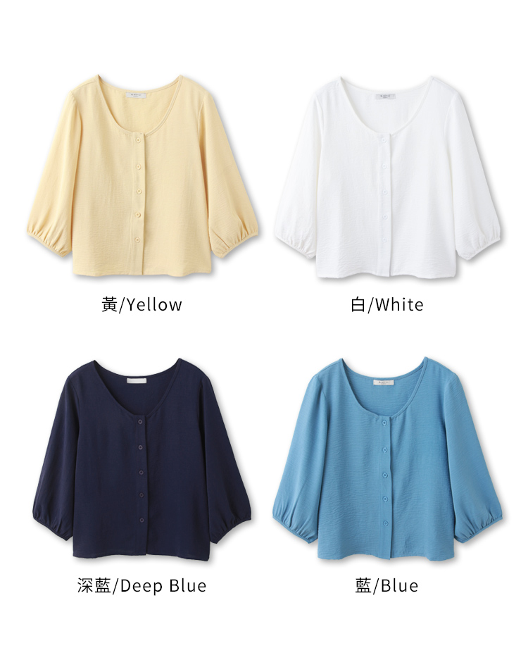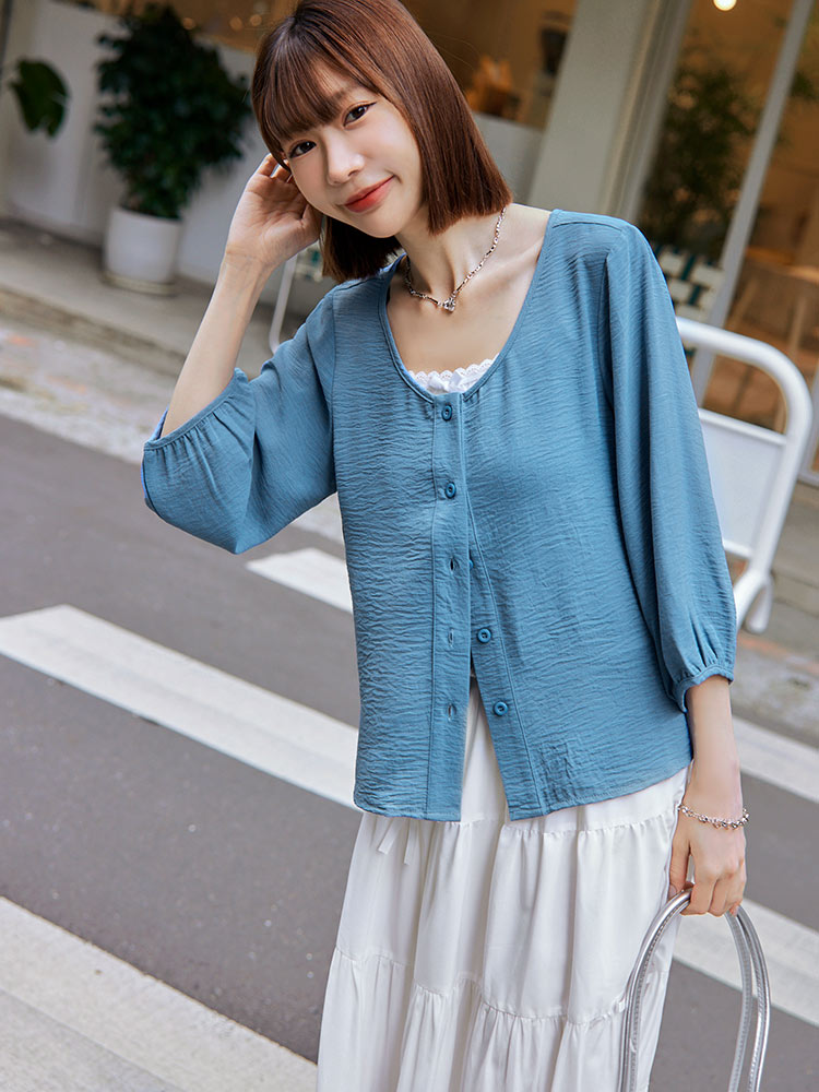 Product Feature: โ Crafted from delicate textured fabric โ Features a flattering round neckline โ Designed with three-quarter sleeves โ Versatile button-up design, can be worn alone or as a layering piece